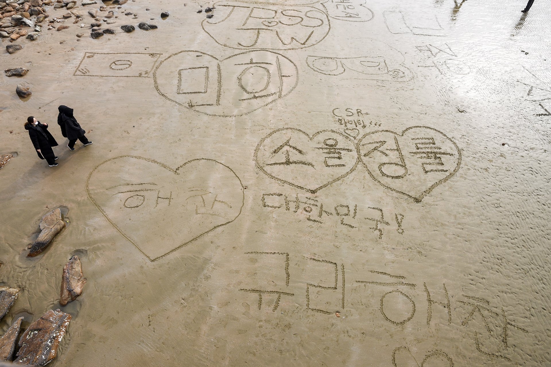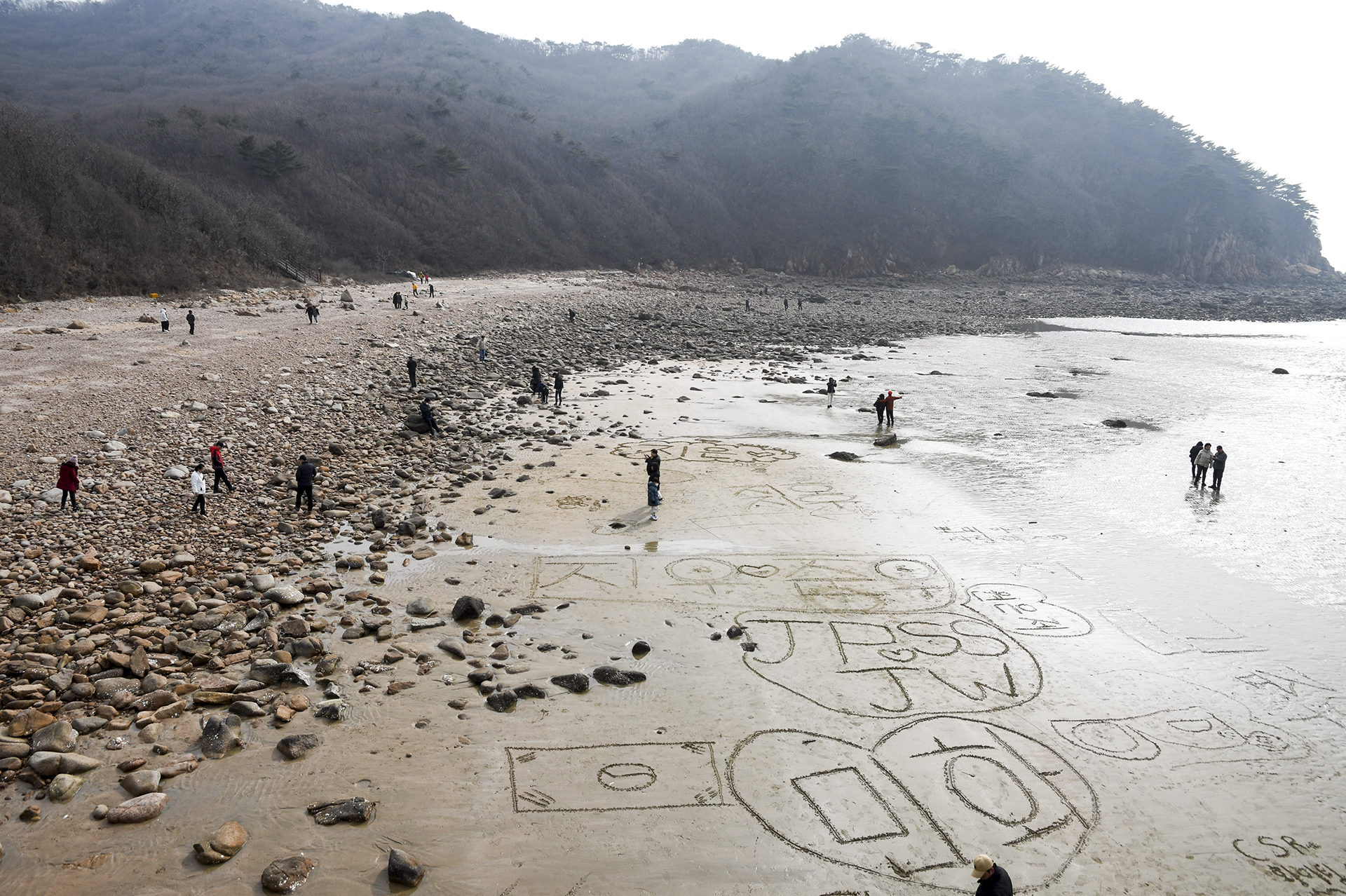 물이 빠져 탄탄해진 해변은 낙서장으로 변해 있다.