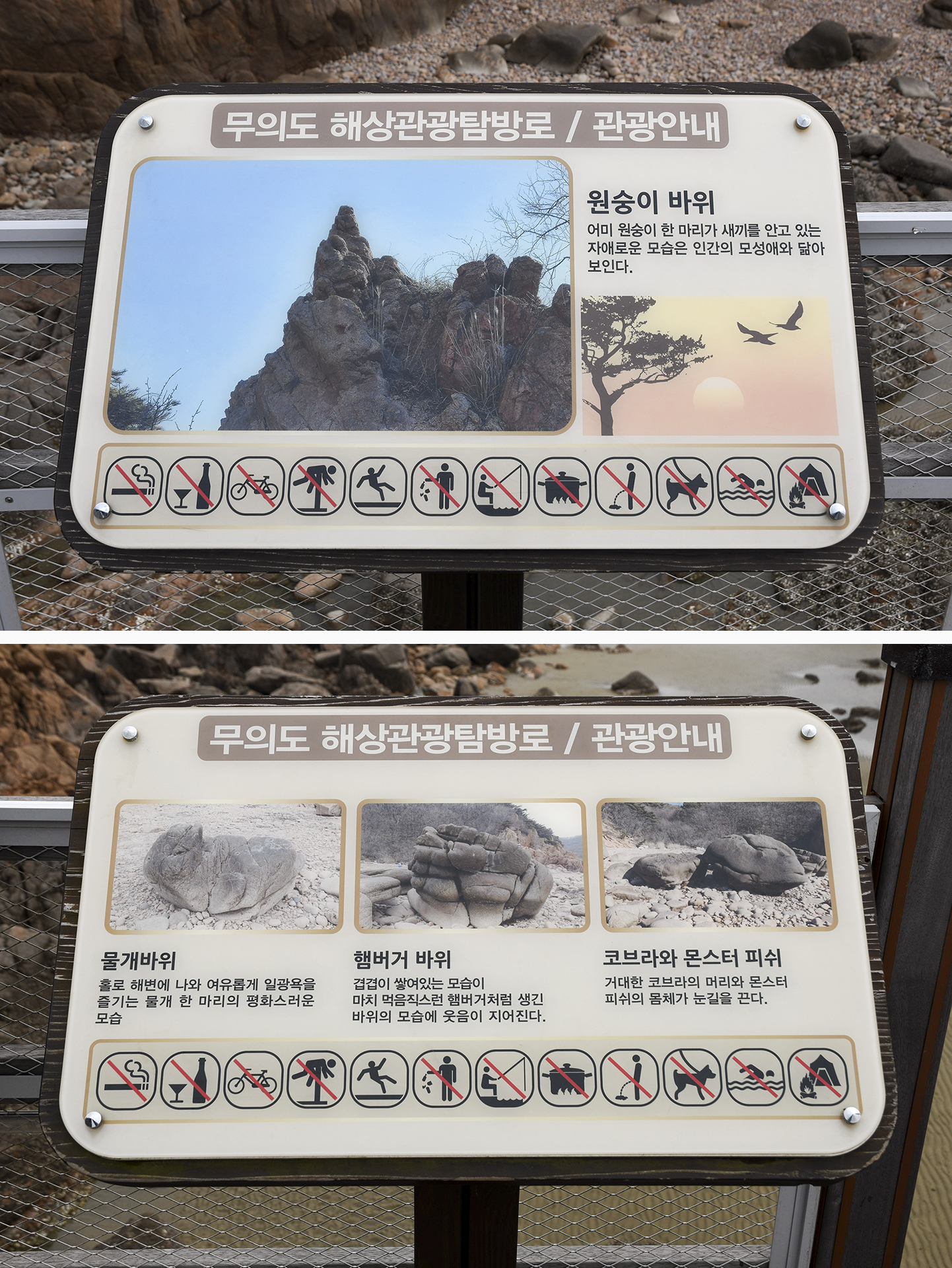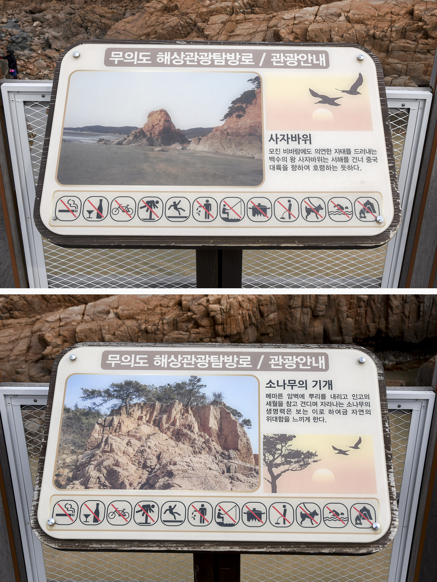 중간 쉼터에 도착, 좌측으로는 바위를 찾아볼수 있는 안내판이 있고, 우측으로는 서해바다의 풍광을 볼수 있게 망원경이 설치되어 있다.