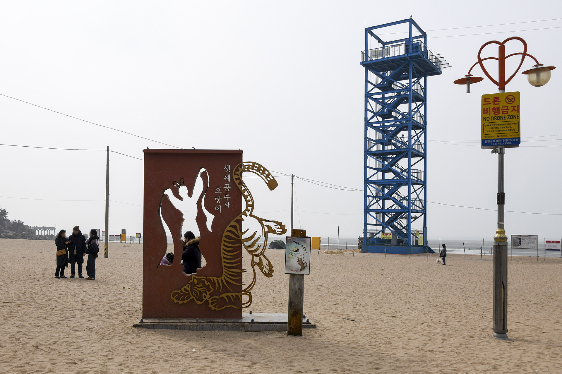 하나개 해수욕장의 짚라인 타워가 세워져 있고, 그 앞에 셋째공주와 호랑이 포토존이 있다.