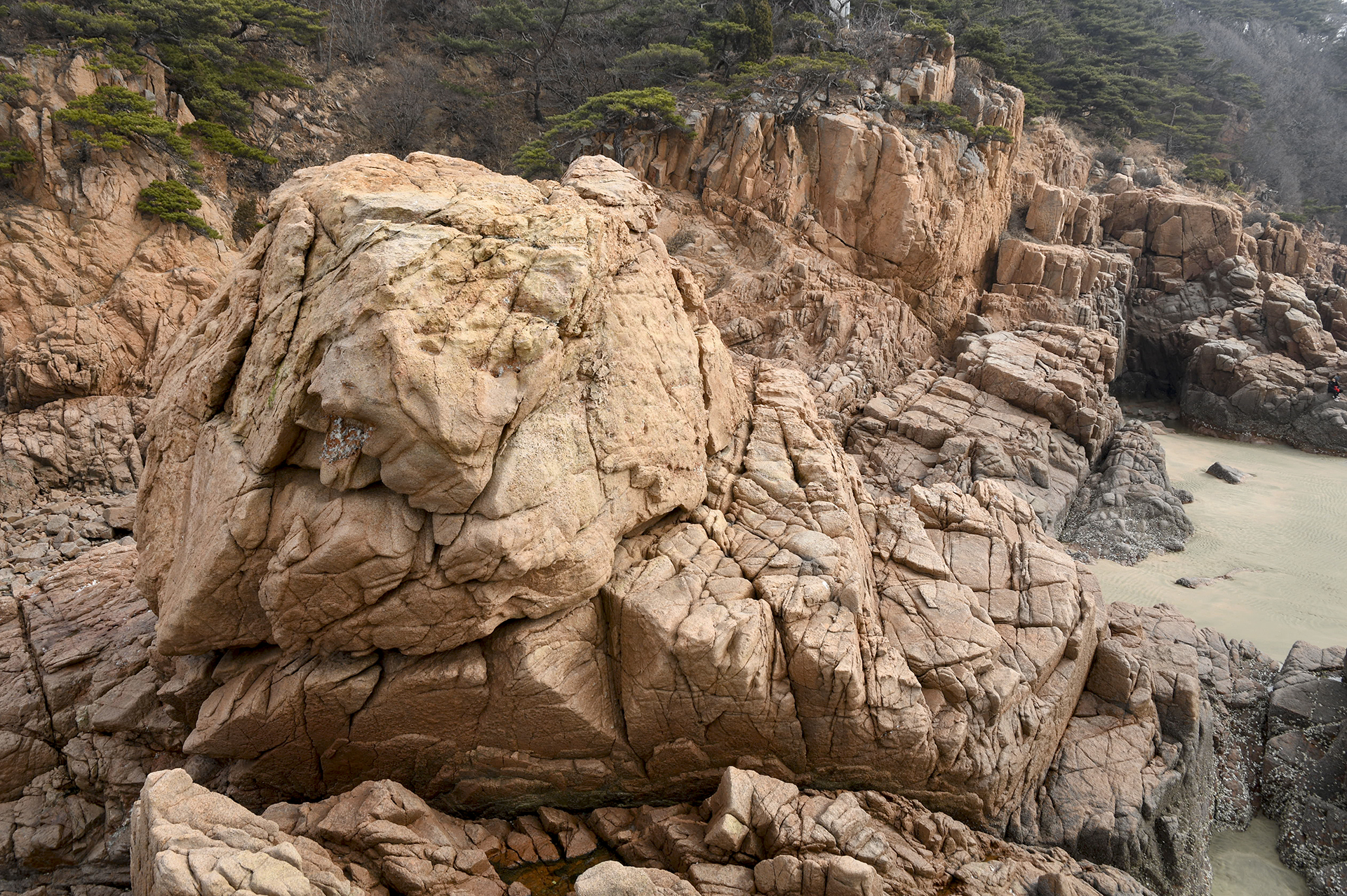 바위틈 사이에서 나무뿌리처럼 자라는 듯한 모습의 바위가 하나의 조각품을 보는 듯하다.