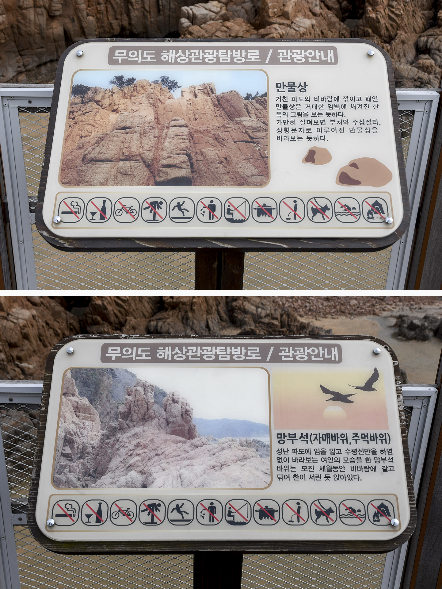 거친 파도와 비바람에 깎이고 패인 만물상은 거대한 암벽에 새겨진 한폭의 그림을 보는 듯하다. 가만히 살펴보면 부처와 주상절리, 상형문자로 이루어진 만물상을 바라보는 듯하다.