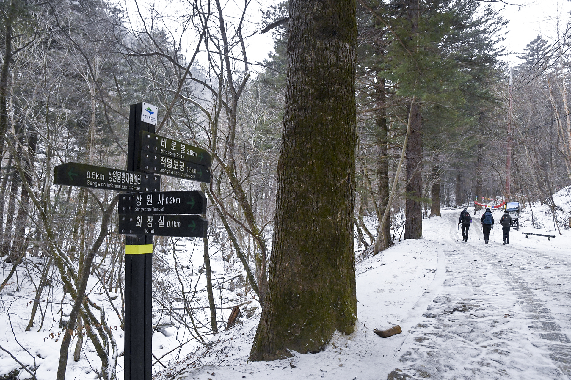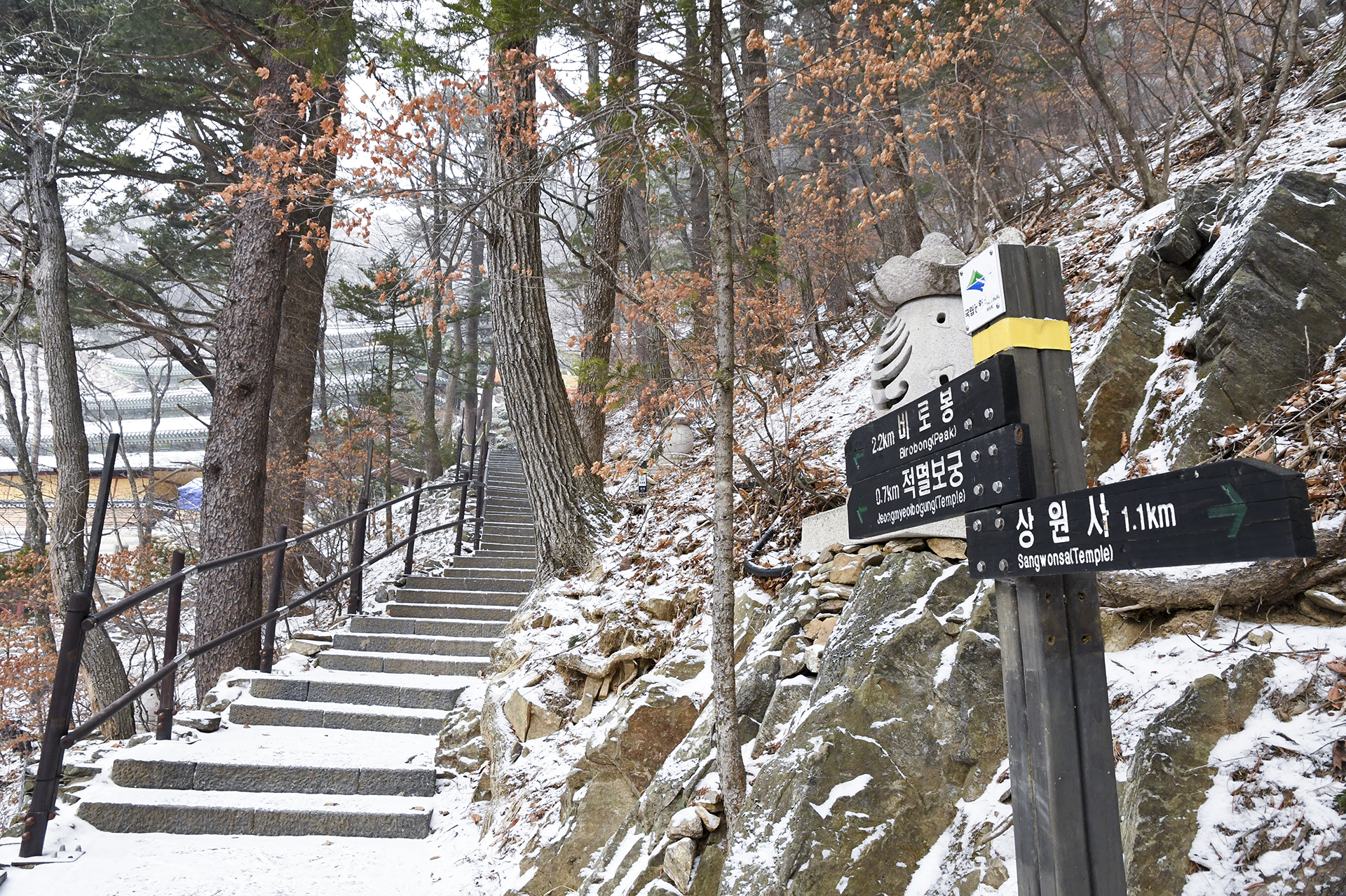 비로봉으로 가기 위해서는 적멸보궁 직진 방향 큰 임도를 따라 걸으면 되지만 잠시 상원사에 들렀다 가기로 한다.