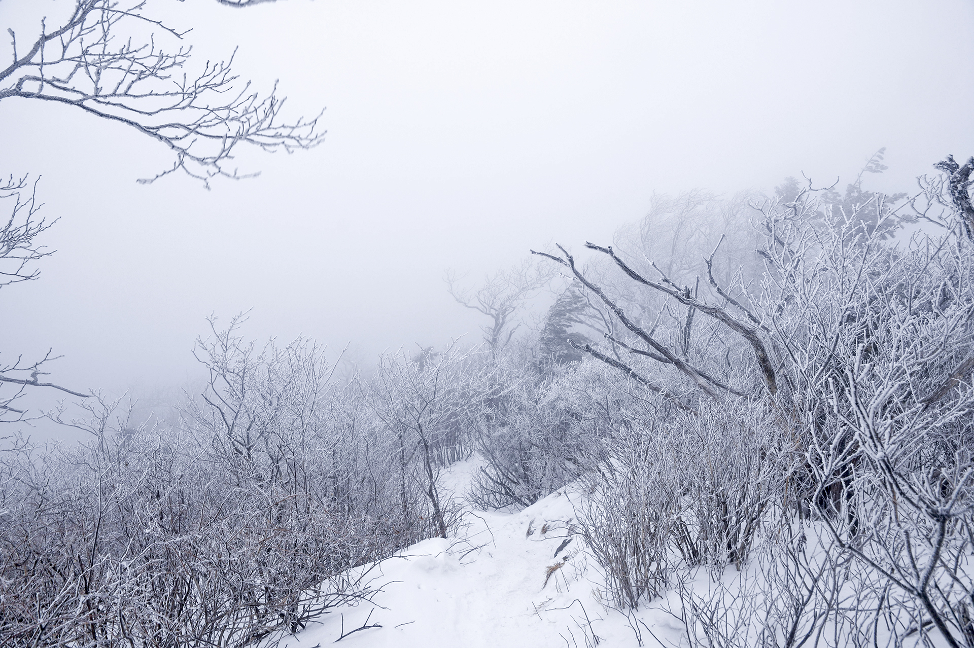안개 물방울을 얼리고 있는 강한 바람을 반겨야 할지, 말아야 할지...