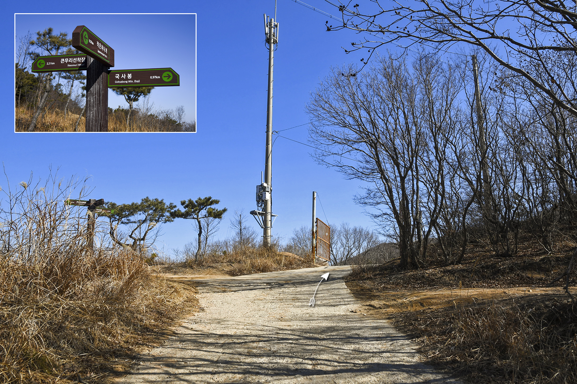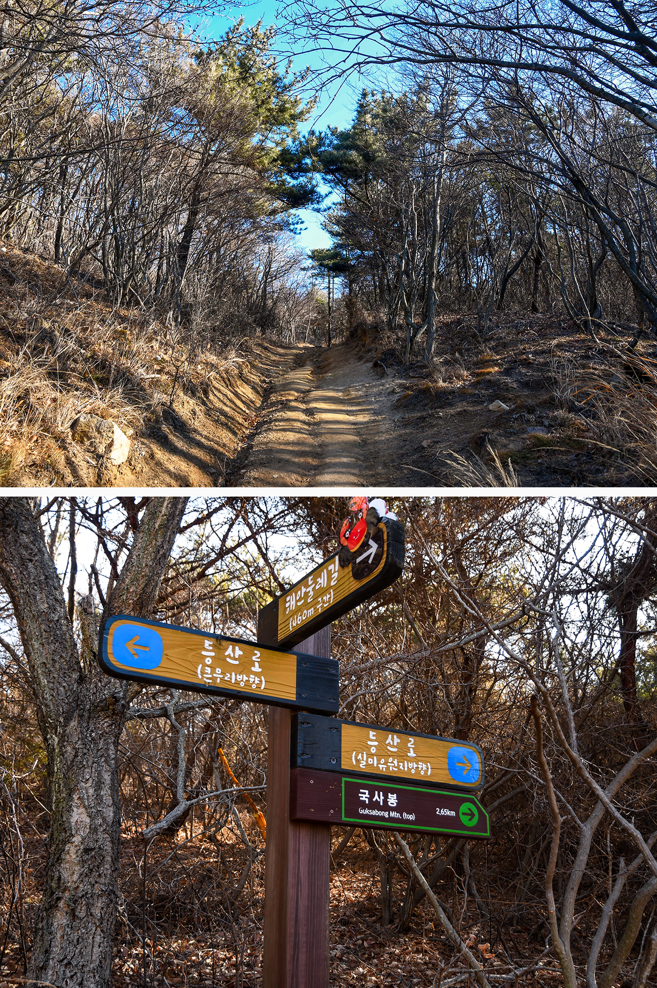 왕복이 아니라면 등산로든 마을길이든 일단 국사봉 방향 이정표를 따라 시멘트 포장된 오르막길을 올라야 한다.