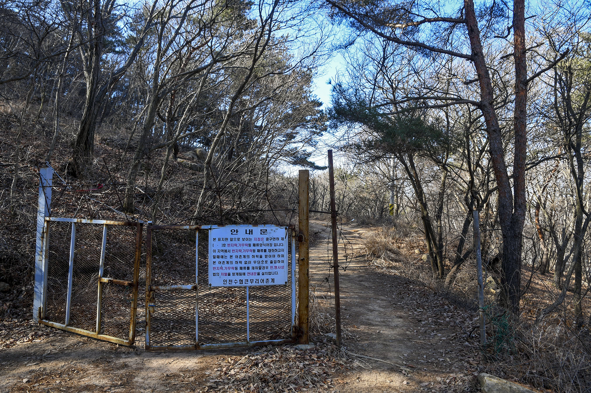 패류양식어장의 무단 채취를 금지한다는 안내문이 붙은 철문 옆을 지나간다.