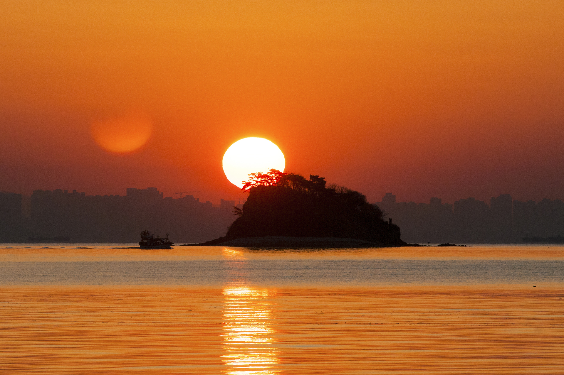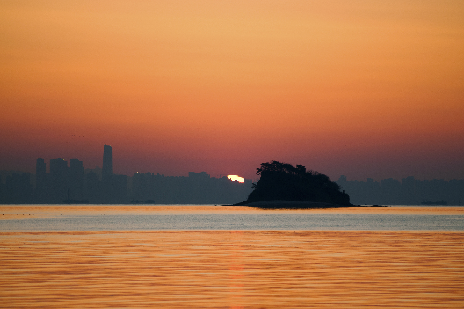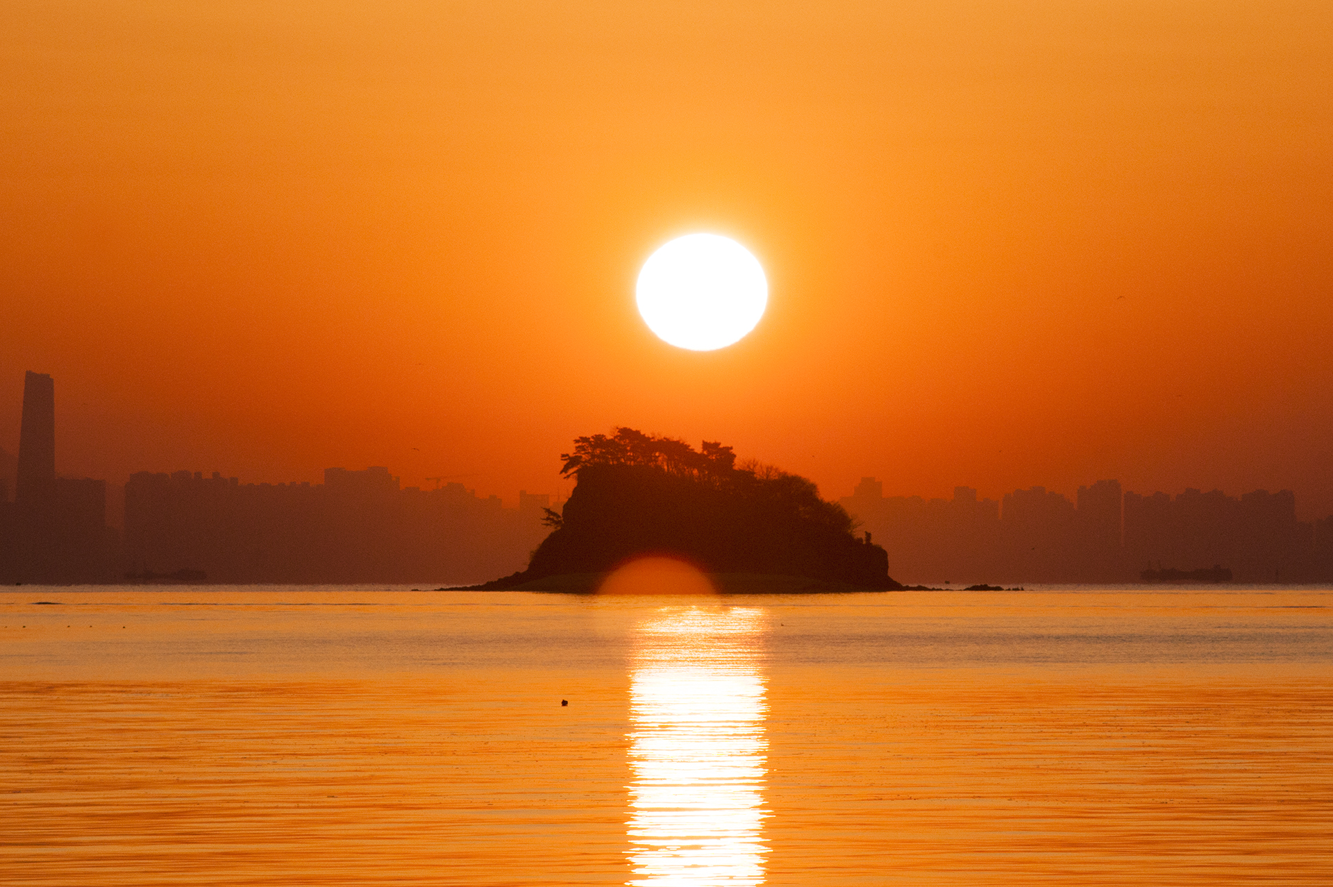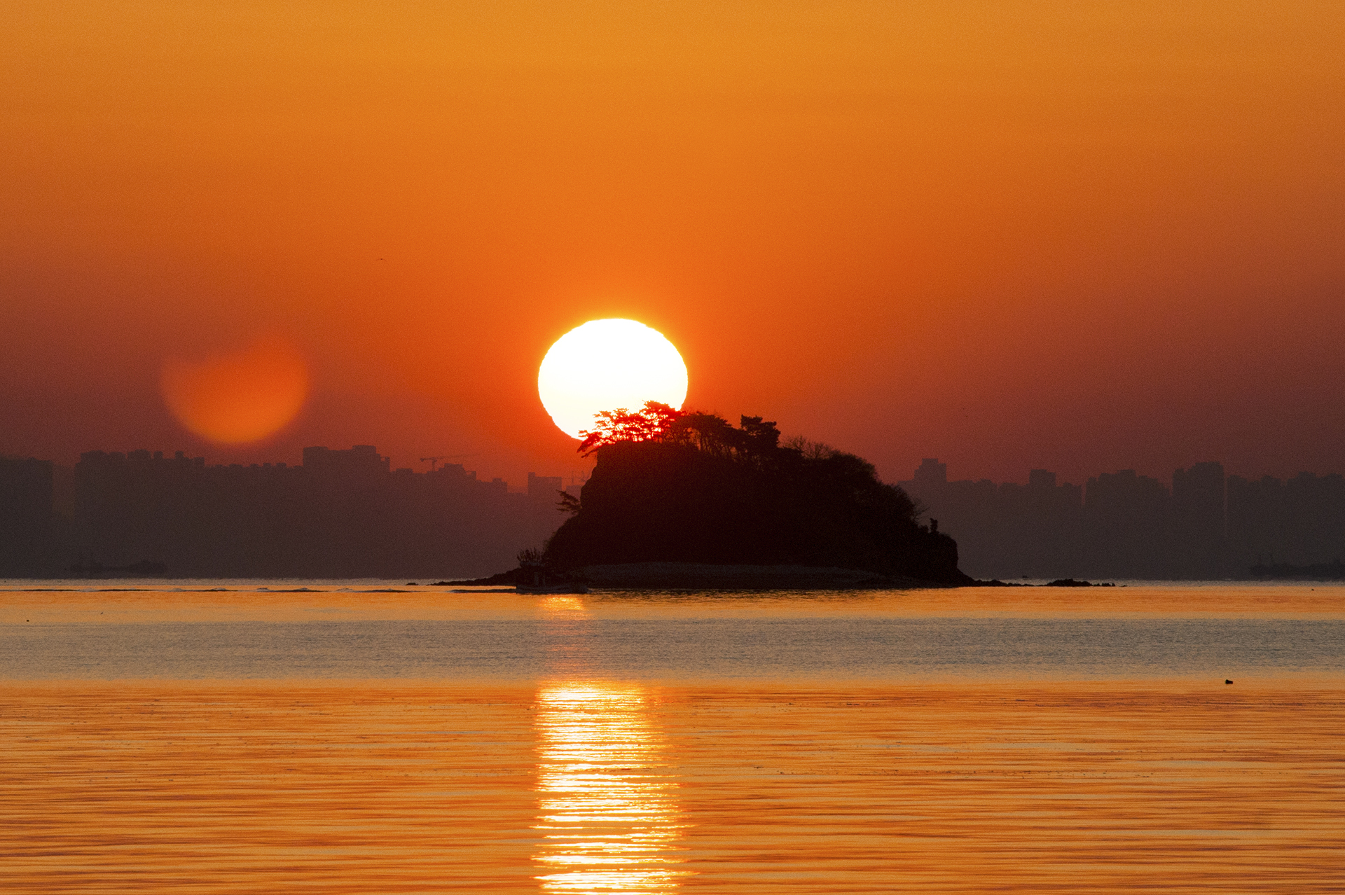 섬 위로 해가 올라서는 중이다.