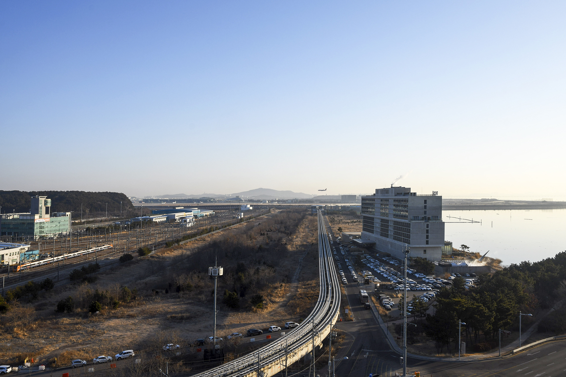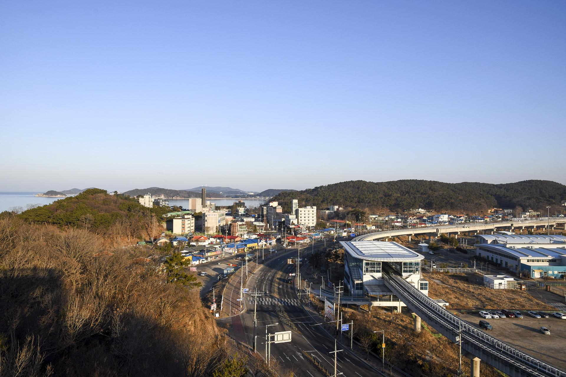 우측에 높이 172m의 낮은 오성산이 길게 늘어져 있고, 그 앞으로 자기부상열차 철도가 보인다.