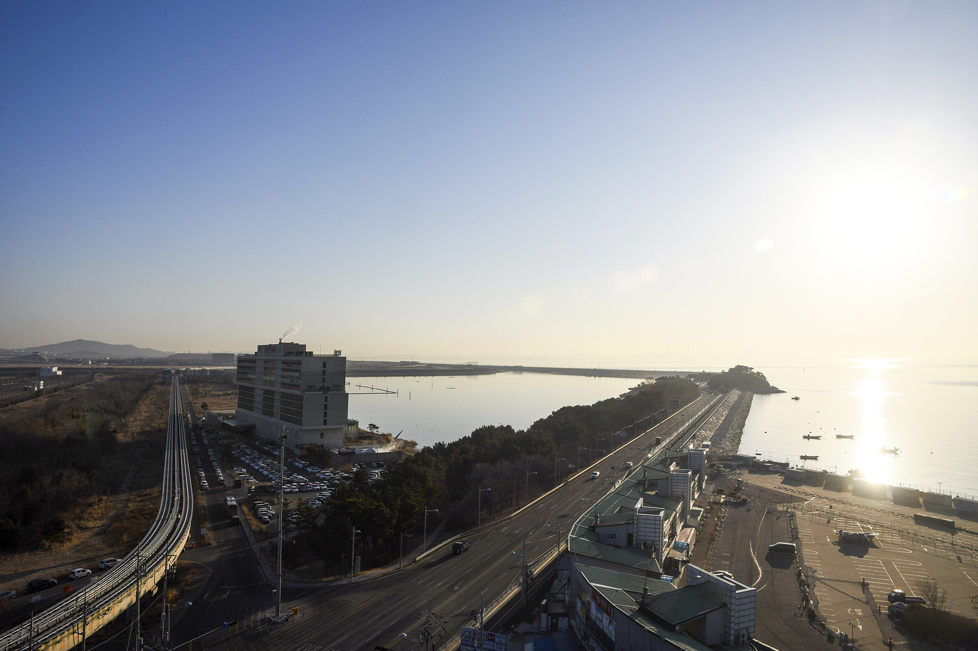 영종대교나 인천대교 방향으로 가는 도로가 바다에 인접해 길게 연결되어 있다.