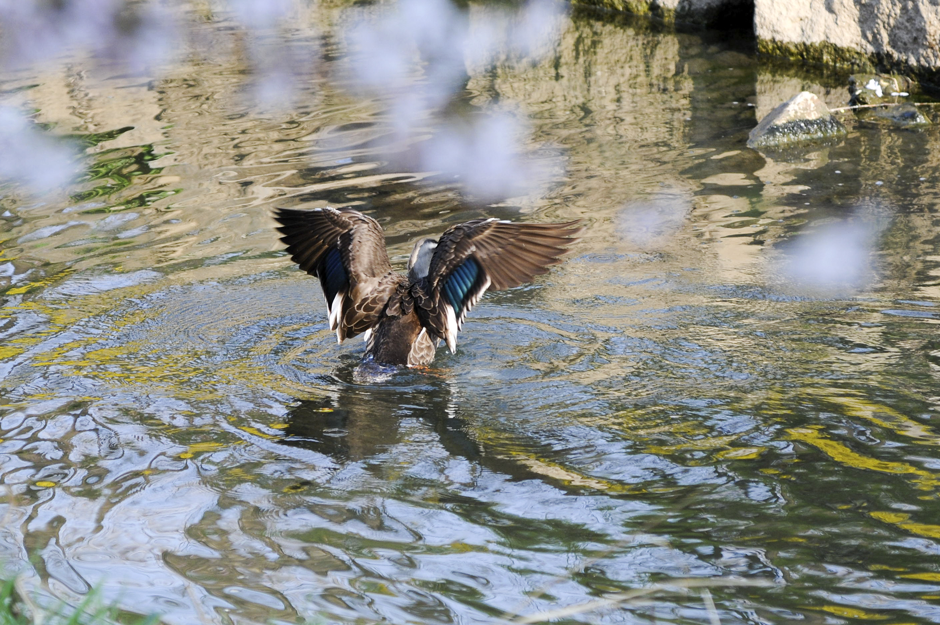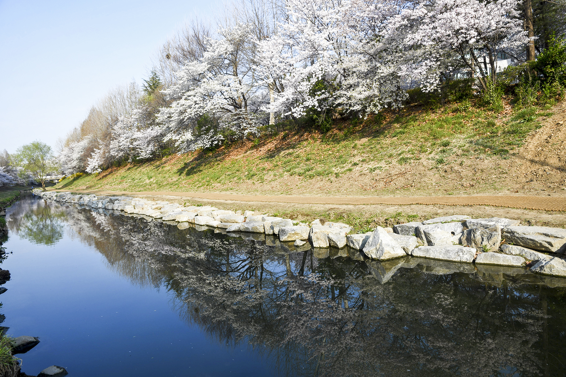 물이 잔잔해 벚꽃 반영이 아름답게 담긴다.