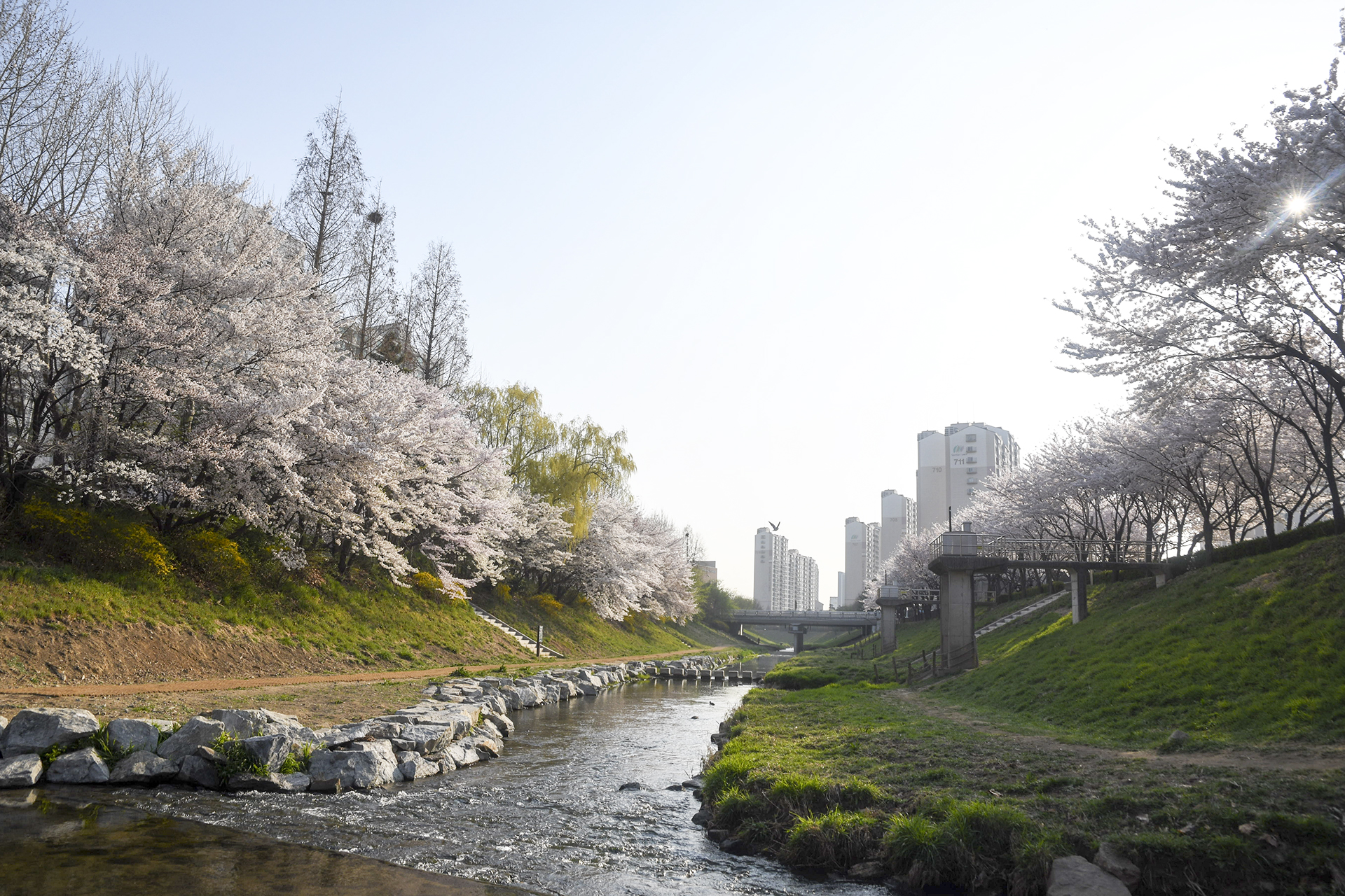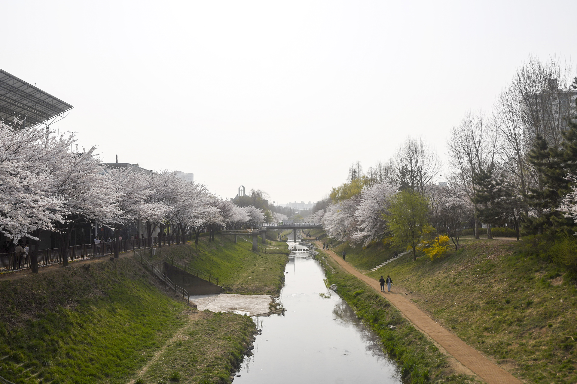 다리 위에서 바라본 굴포천 풍경으로 인천 벚꽃 소식를 전해본다.