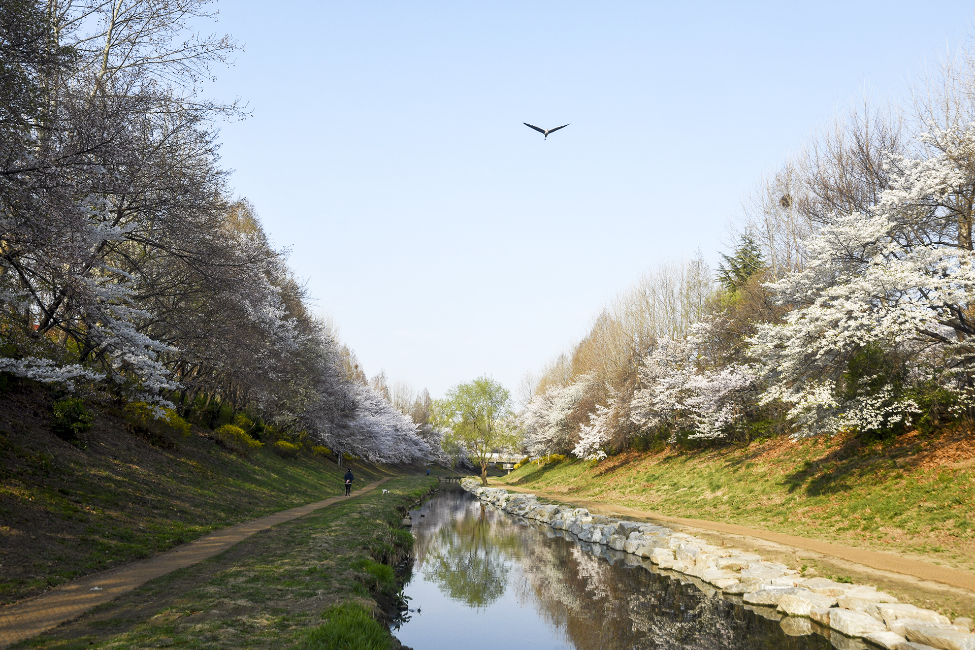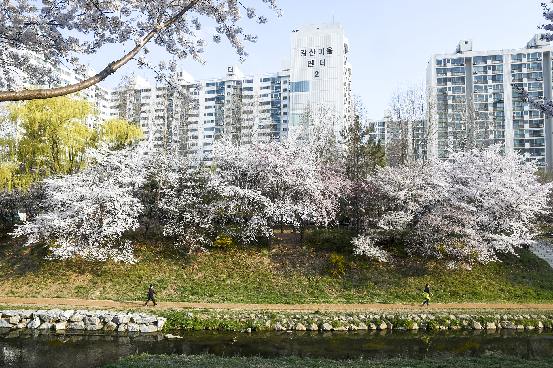 하천으로 가지가 크게 휘어진 벚나무가 아름답다.