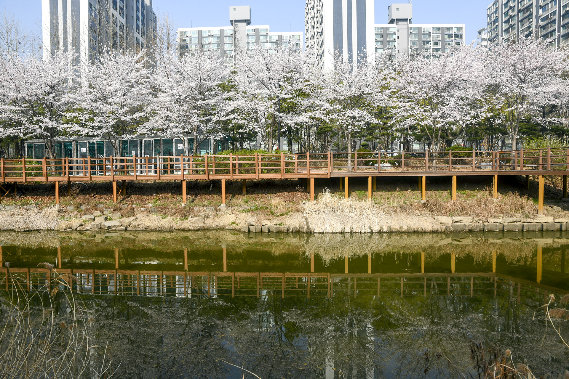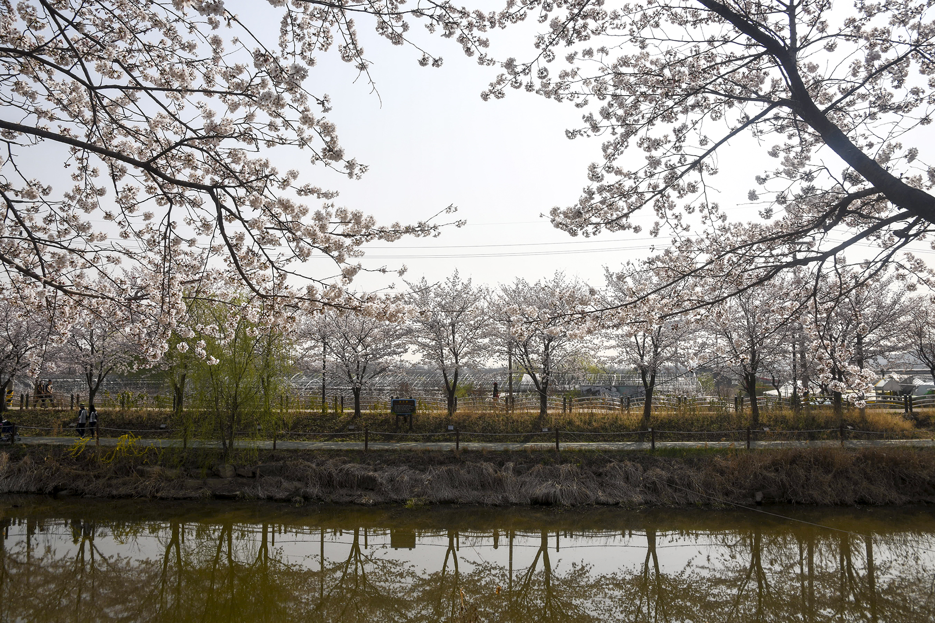 수량이 적어 정면으로는 벚꽃의 반영을 담을수가 없어 비스듬한 샷으로 담아본다.
