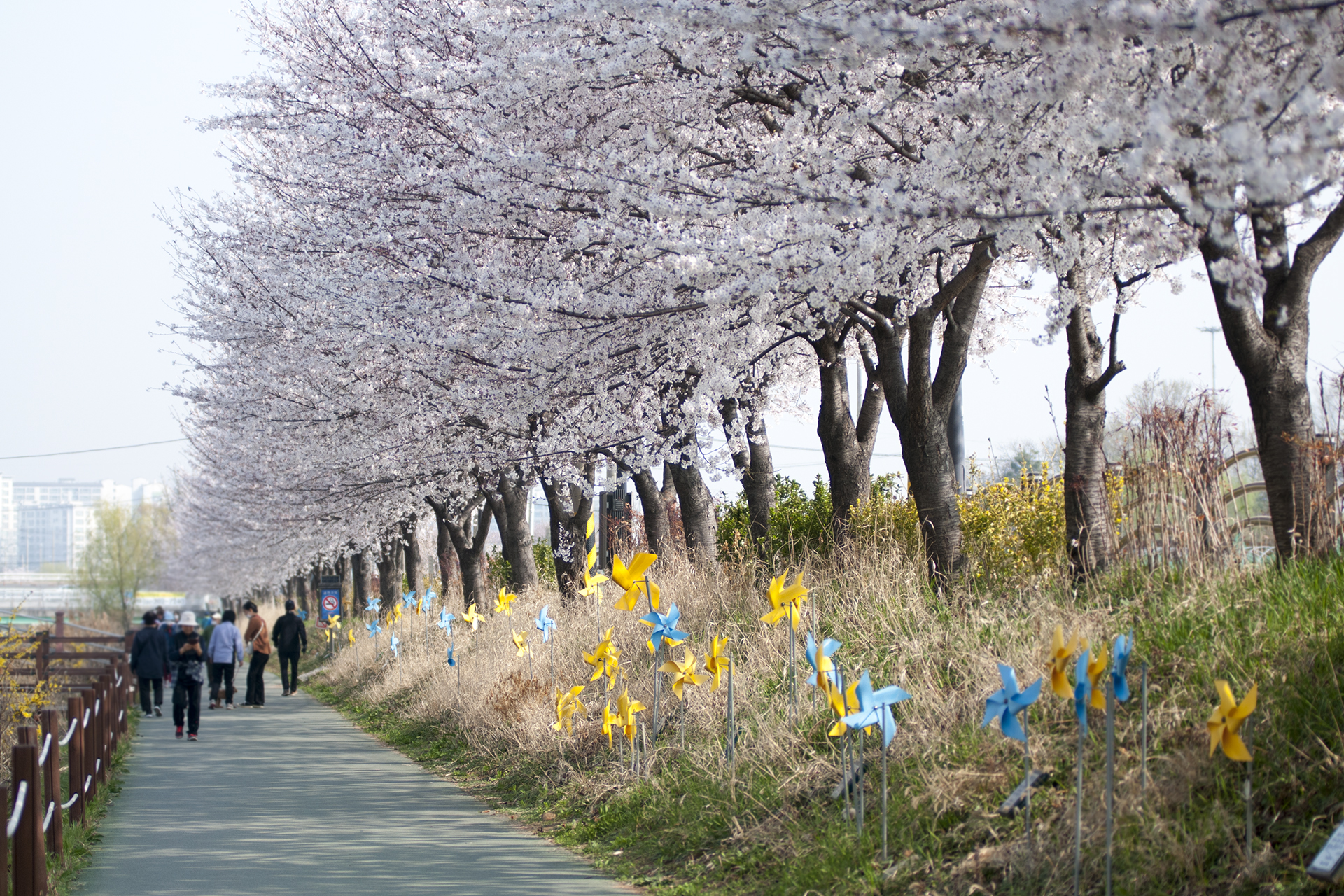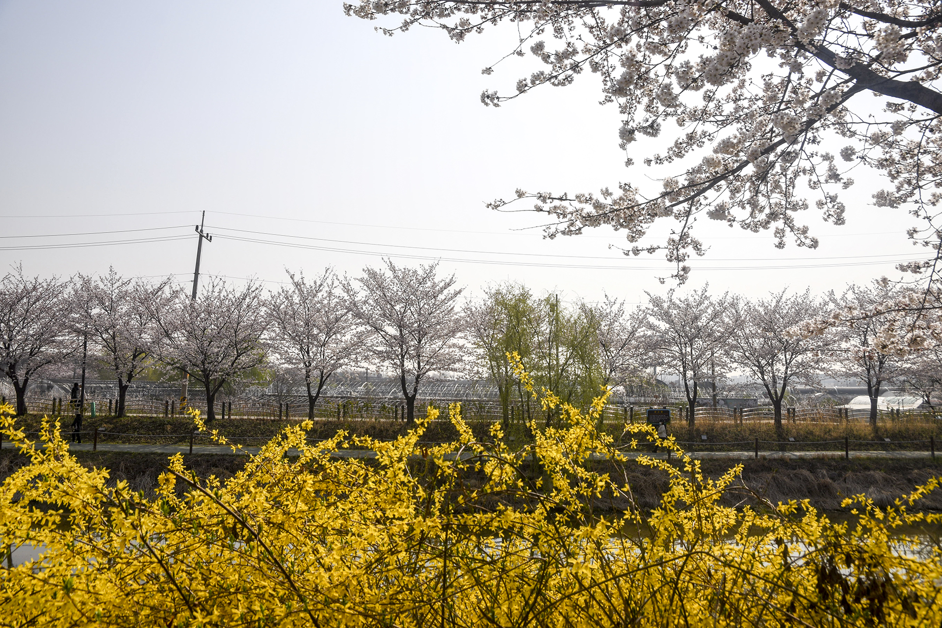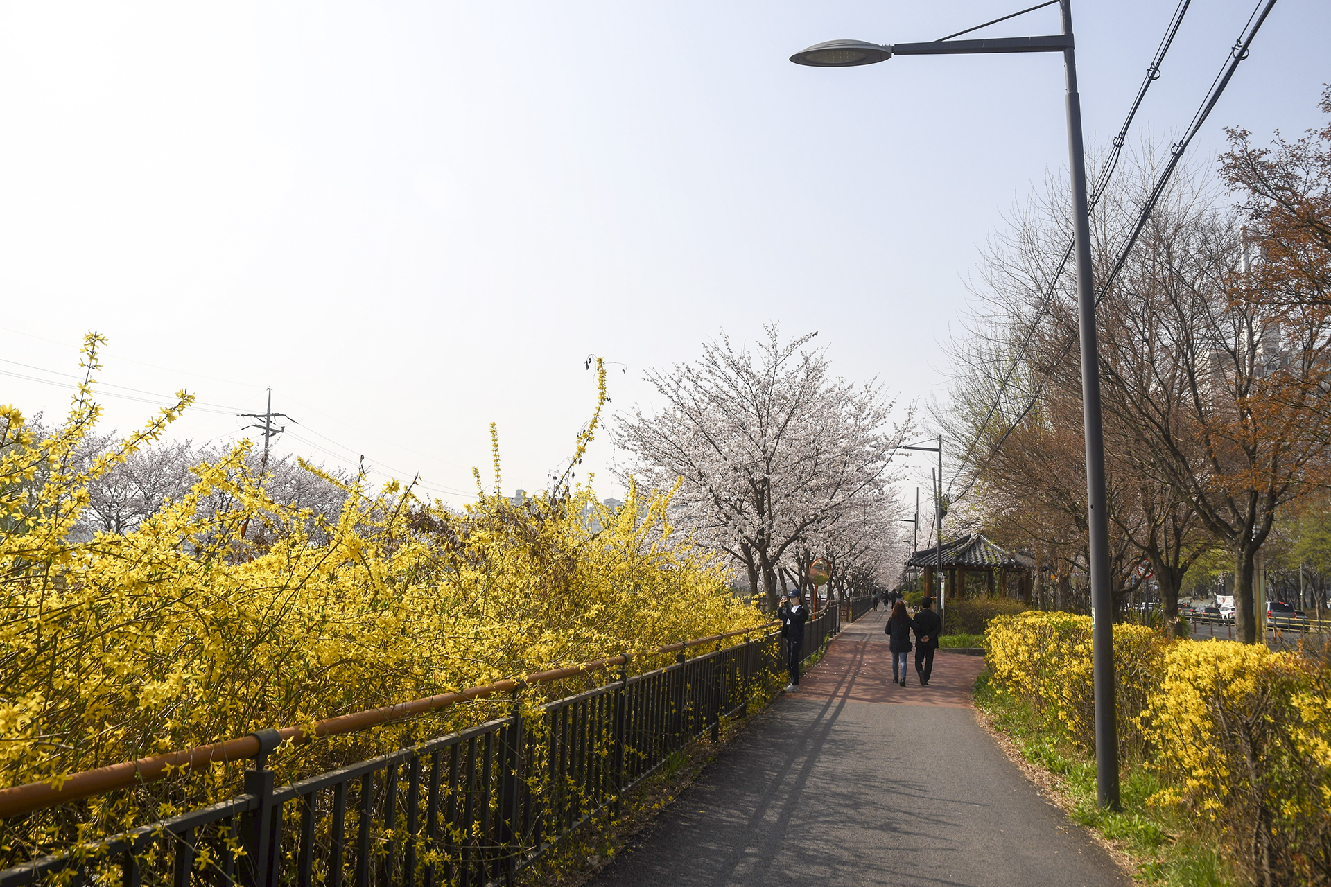 벚꽃의 행렬이 끝나고 개나리가 마무리를 지어주는 지점으로, 이 길을 계속 걸어가면 아라뱃길과 만나게 되어 있다.