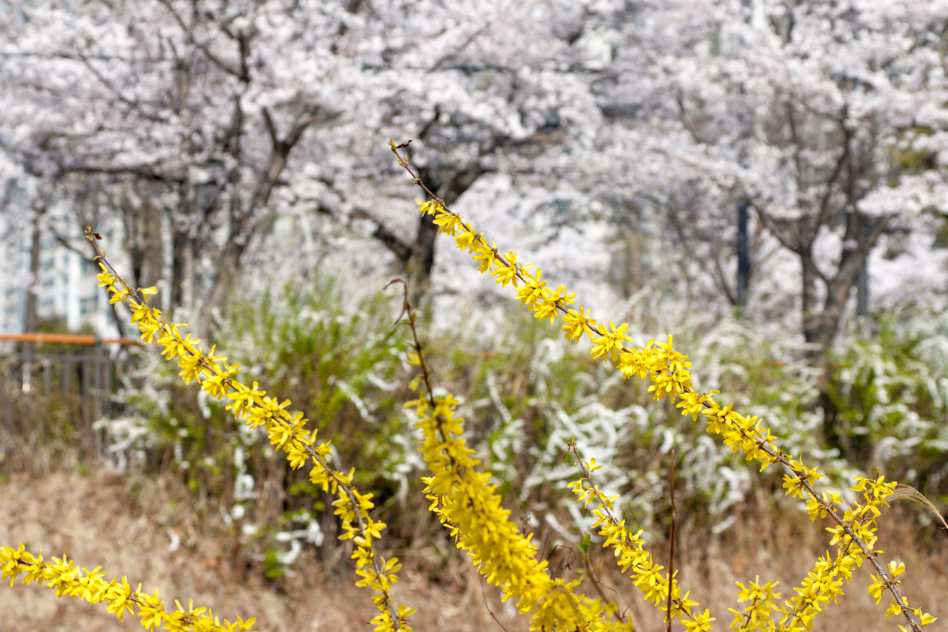 건너편에는 벚꽃 아래 조팝나무가 하얀 꽃을 피우고 있다.