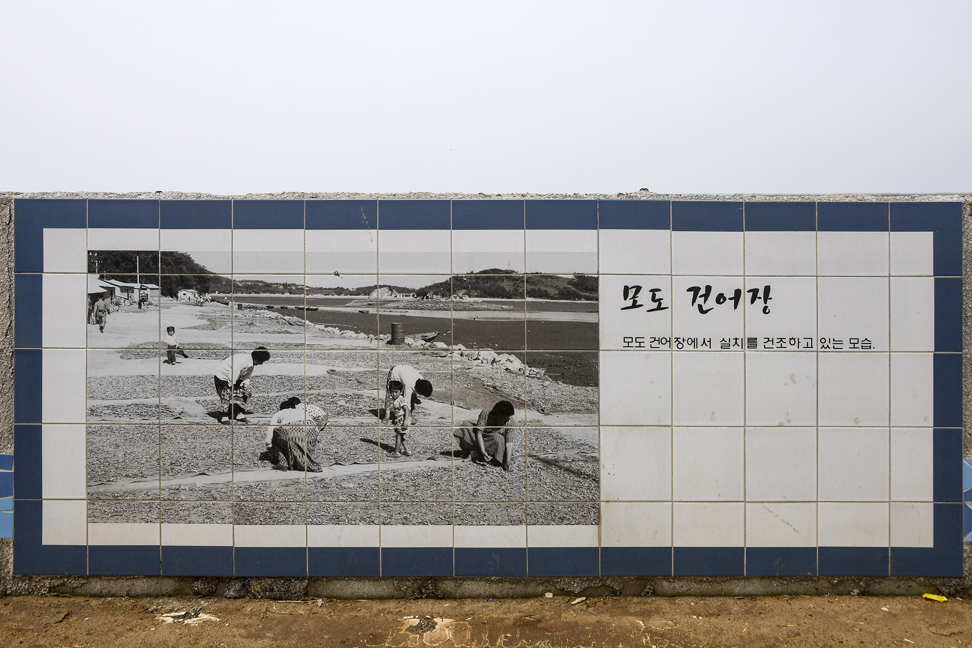 방파제 담장에는 실치를 건조중인 모도 건어장의 옛 모습을 볼 수 있다.