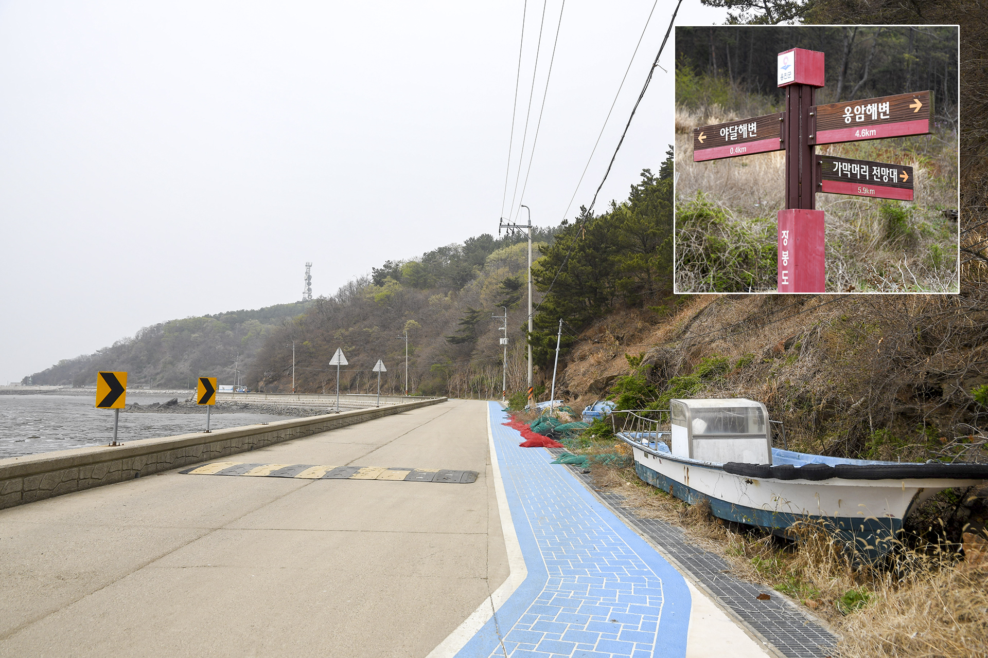 국사봉으로 올라가는 등산로와, 한들해변으로 가는 갈림길,, 이곳에서도 계속 장봉2리 방향 마을로 향했다.