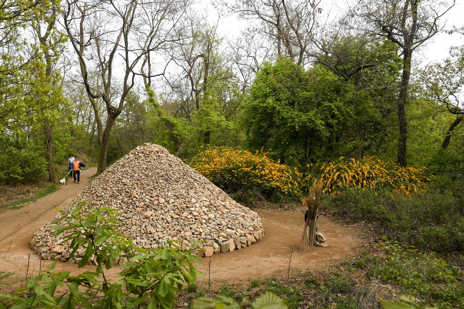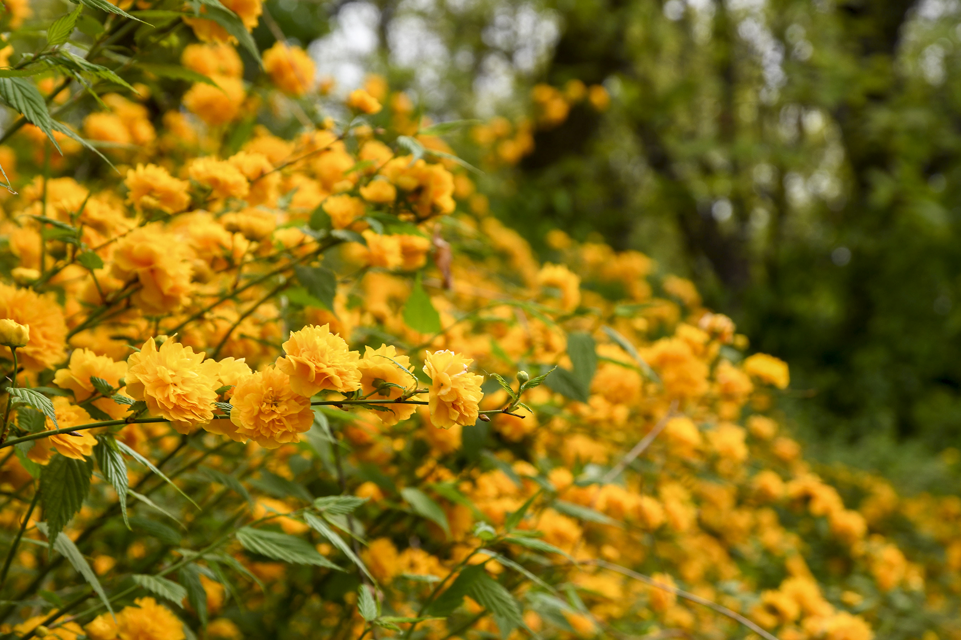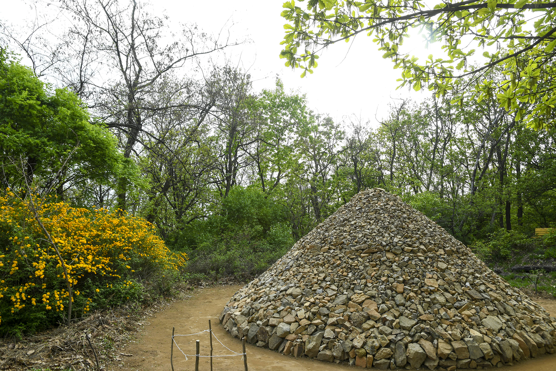 돌탑 뒷편에는 황매화가 활짝 피어 곁을 오가는 산객들의 눈길을 사로잡는다.