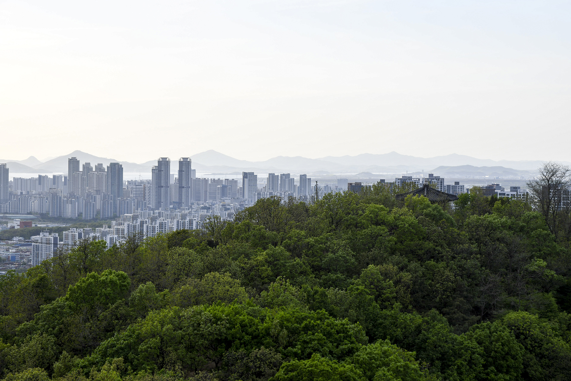 숲에 둘러싸인 원적정과 도심의 높은 건물들이 대비를 이룬다.
