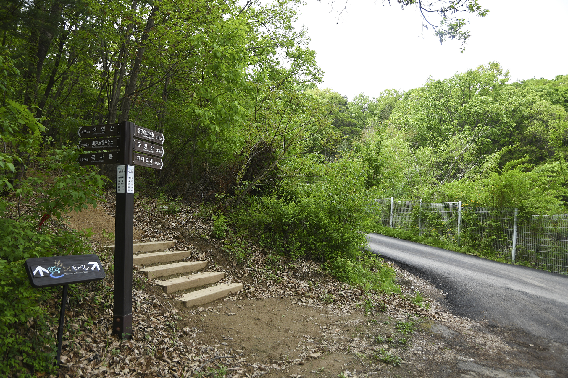 계단을 따라 내려가면 도수1리로 이어지는 길과 만나게 되는데, 내려가는 중에는 우측의 이정표가 나무에 가려 보이지 않을수 있다.
