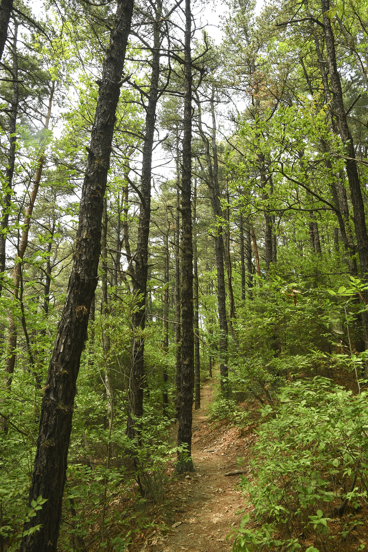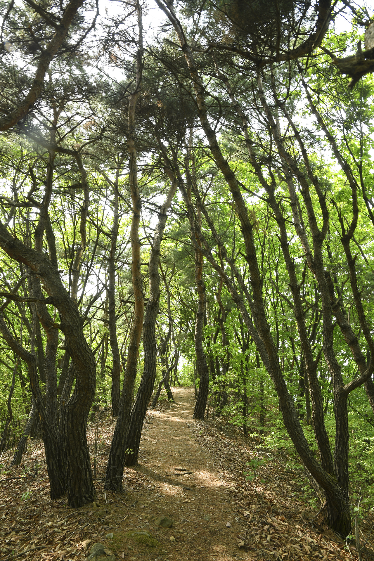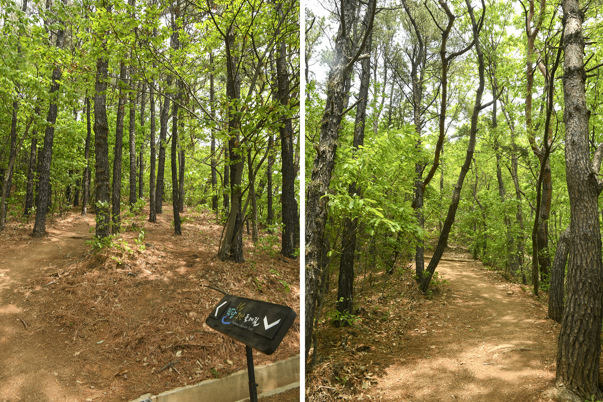 좁다란 길에 소나무가 제법 많지만 다른 잡목들도 많이 섞여 있는 숲이다.
