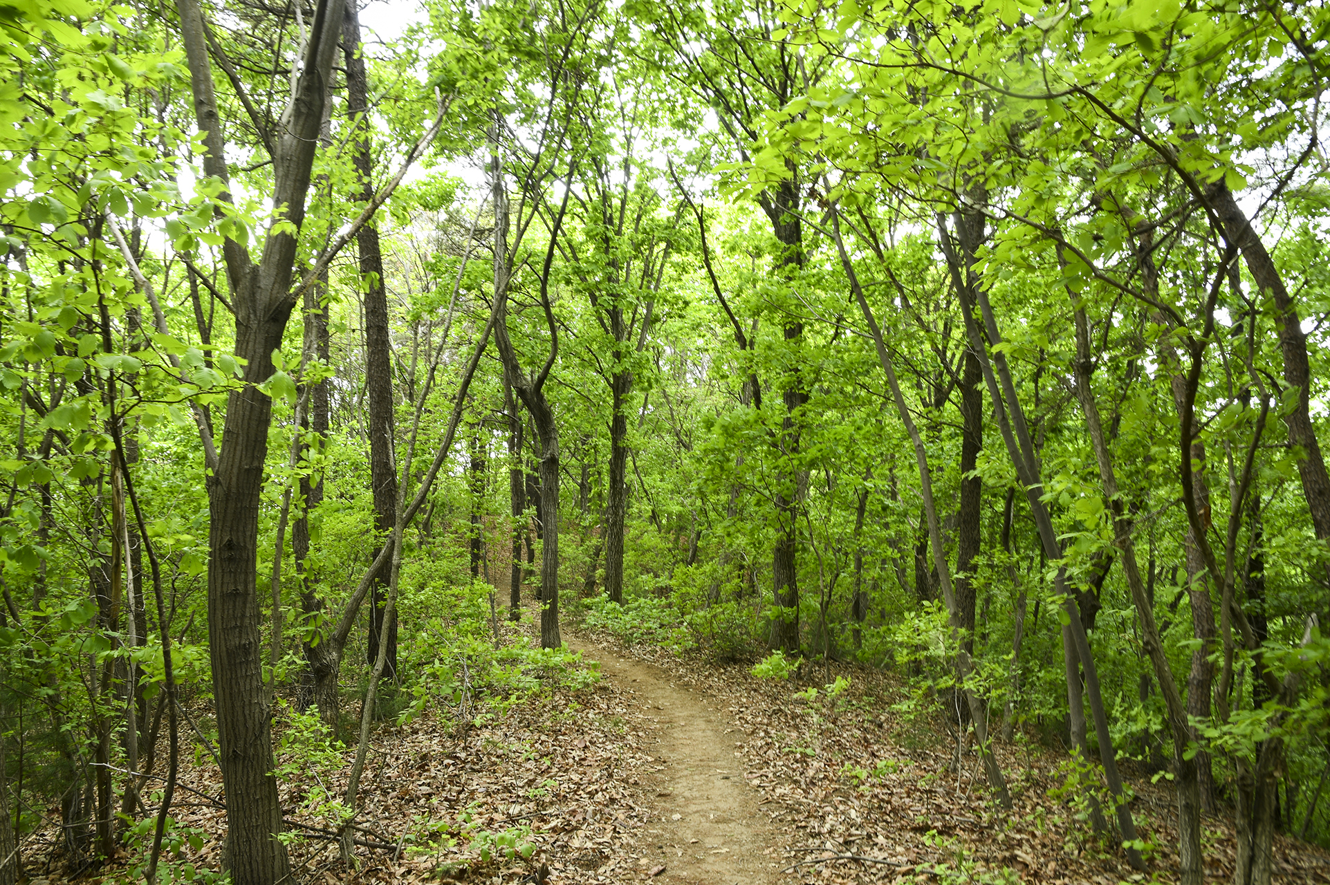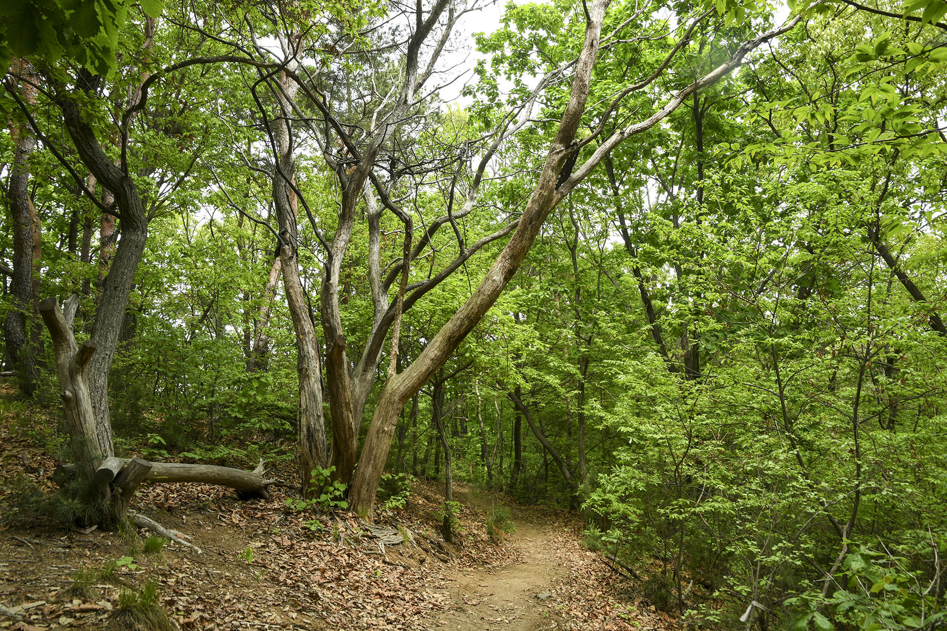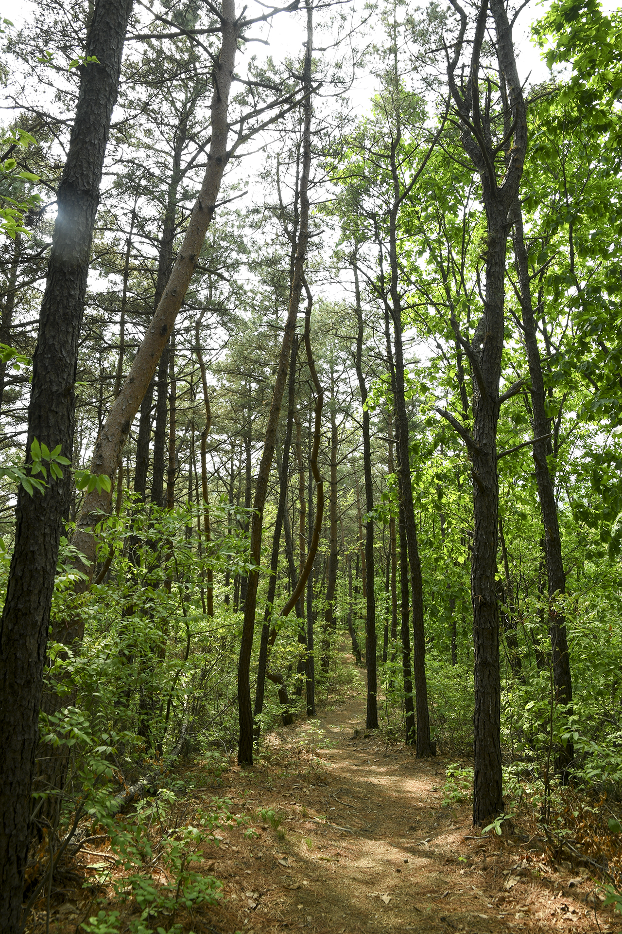 좁다란 길에 소나무가 제법 많지만 다른 잡목들도 많이 섞여 있는 숲이다.