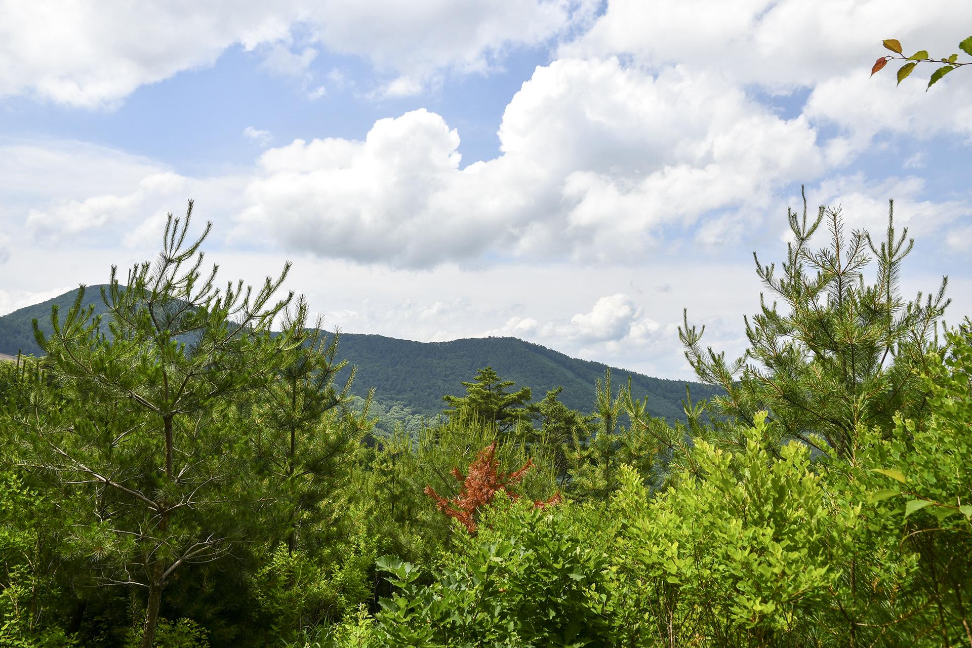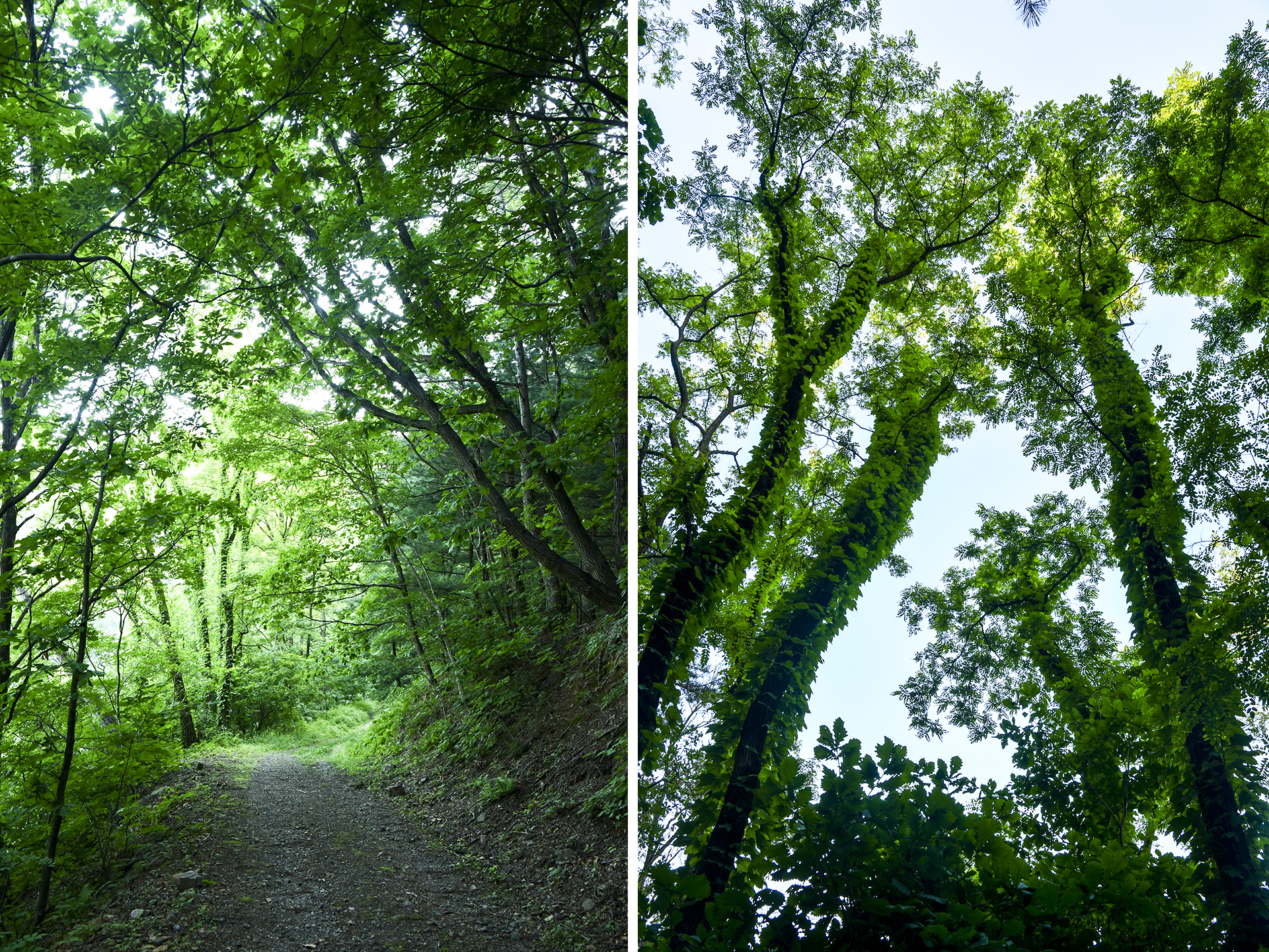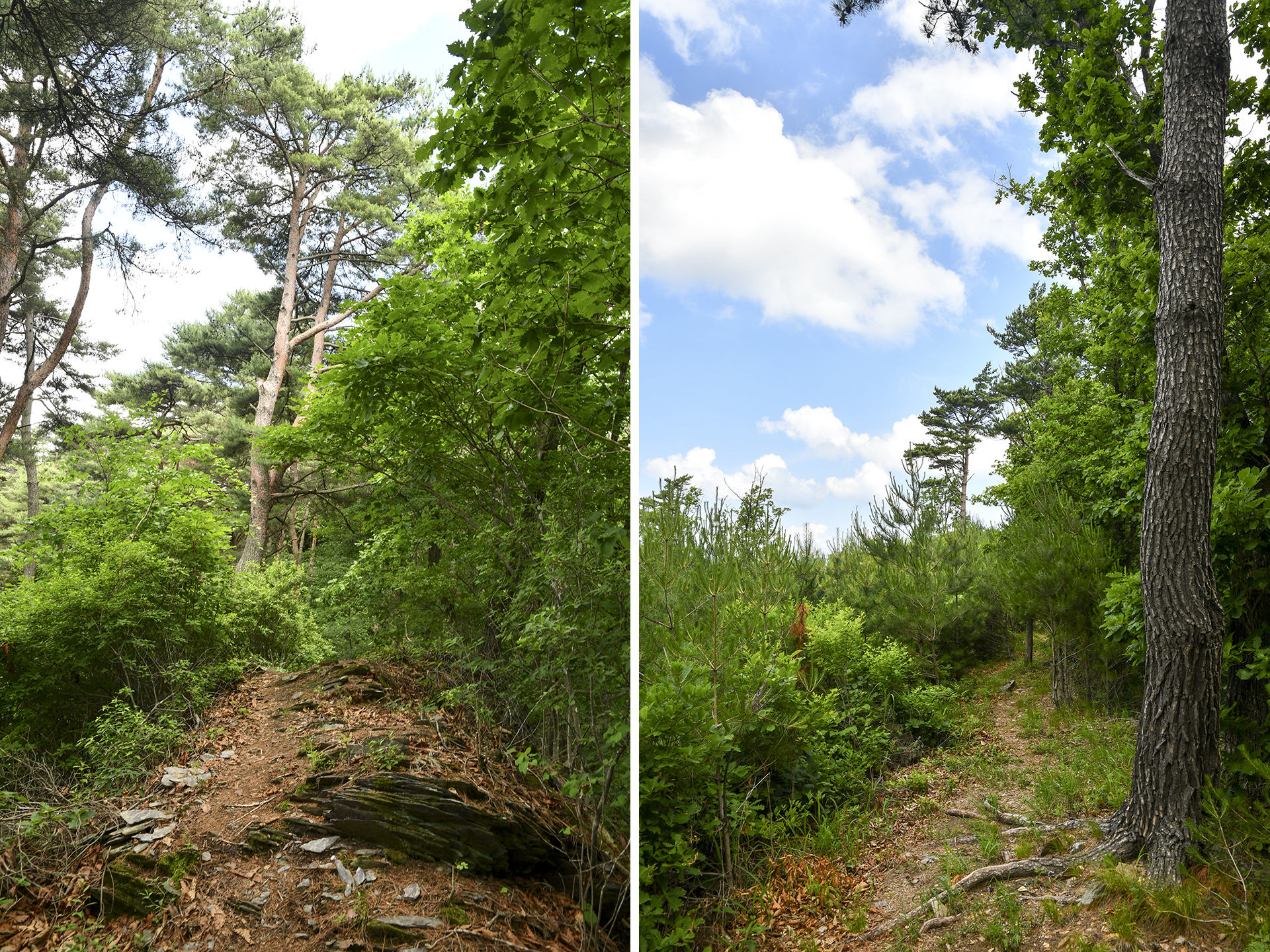 활짝 열린 하늘에는 뭉게구름이 가득하고, 길은 대체로 전망이 트이지 않는 숲속으로 이어지는 중이다.
