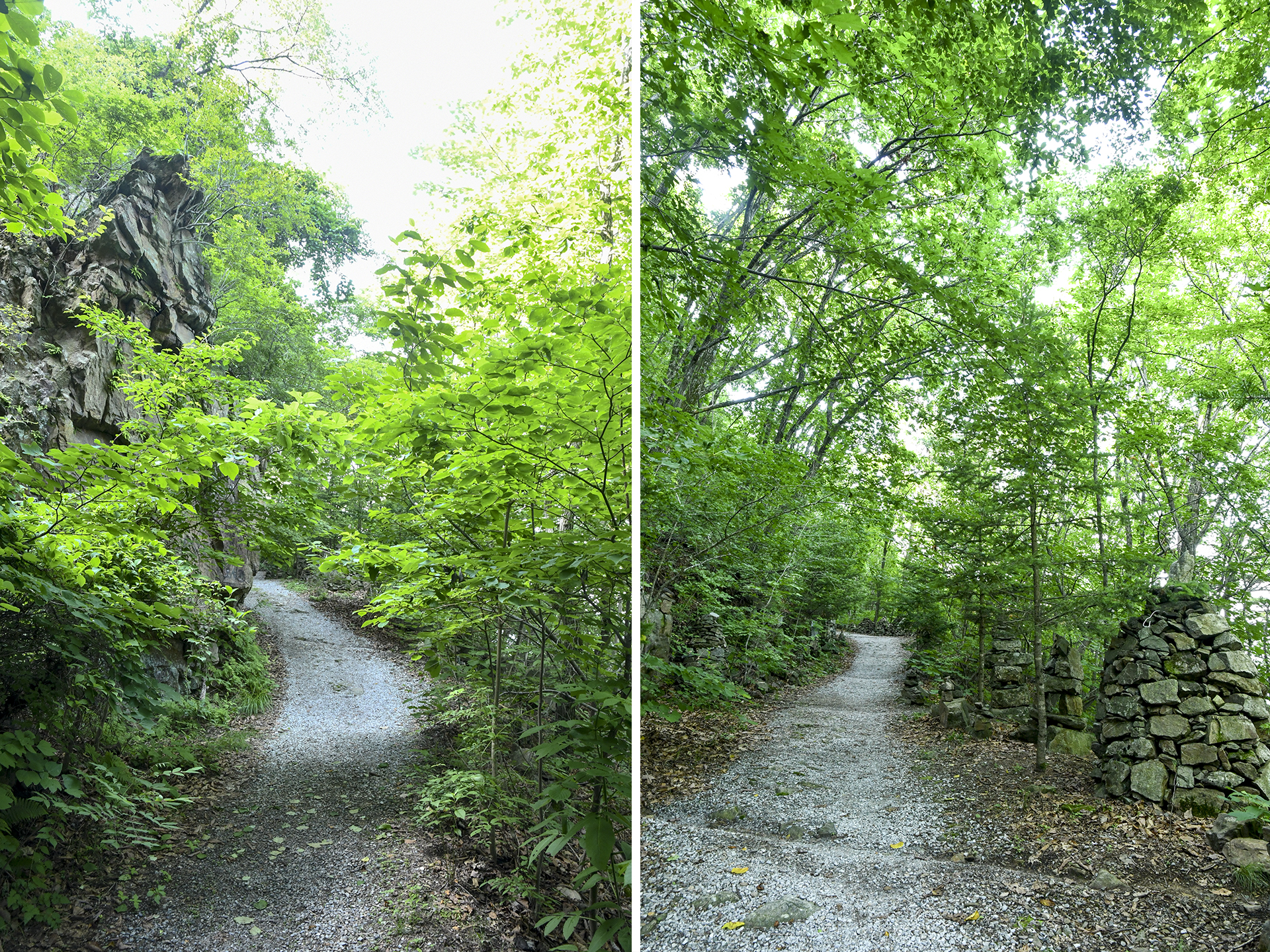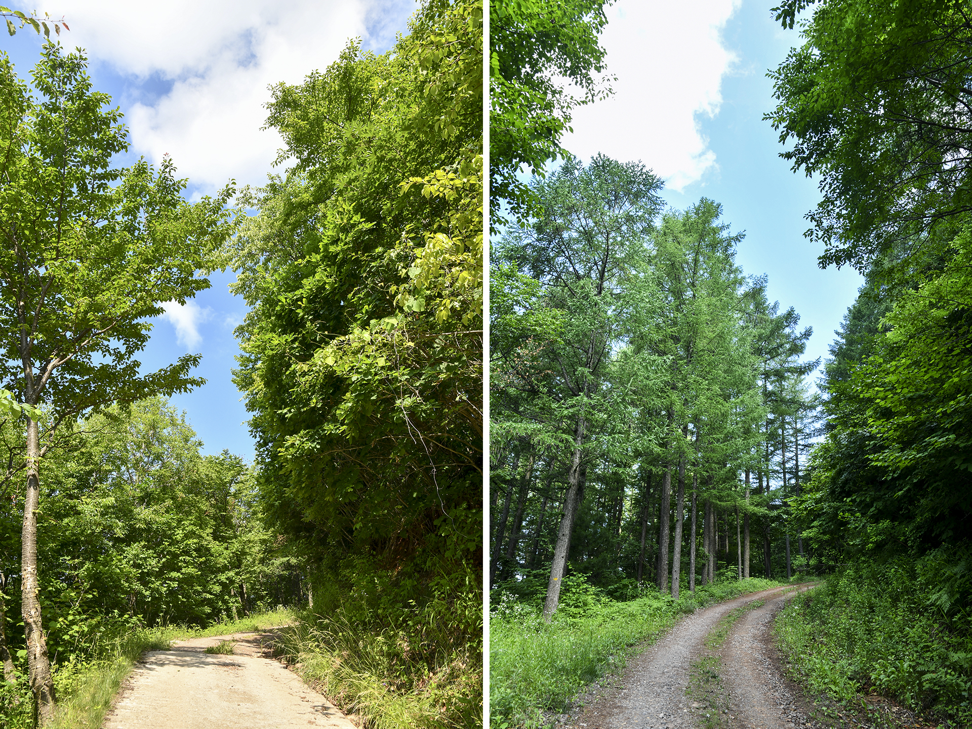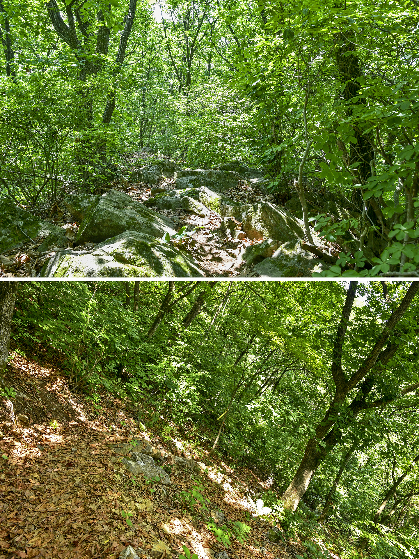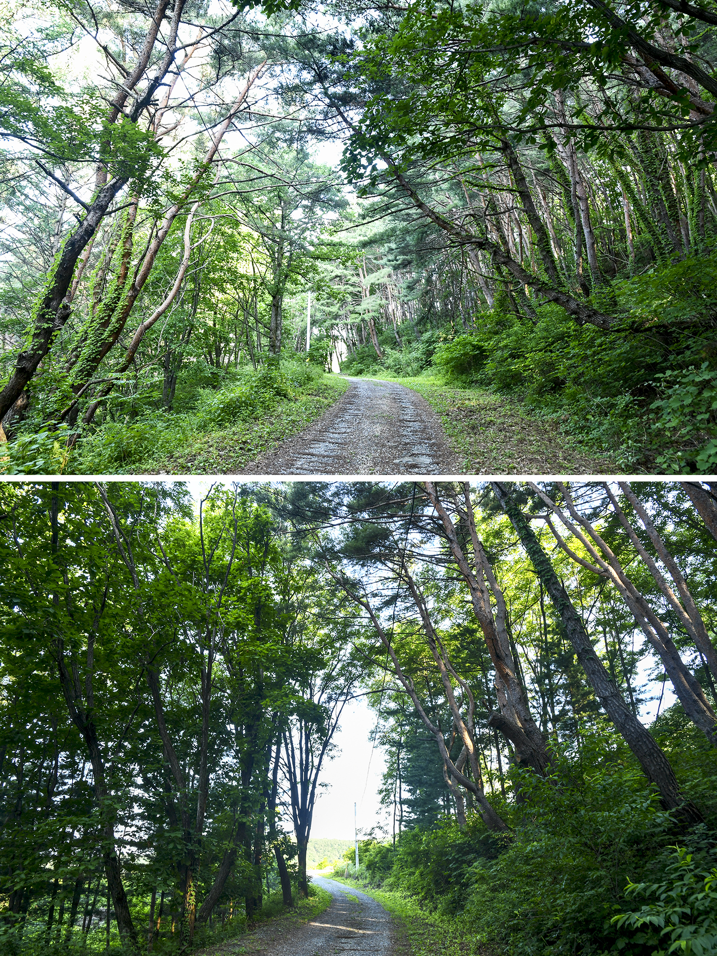 활짝 열린 하늘에는 뭉게구름이 가득하고, 길은 대체로 전망이 트이지 않는 숲속으로 이어지는 중이다.