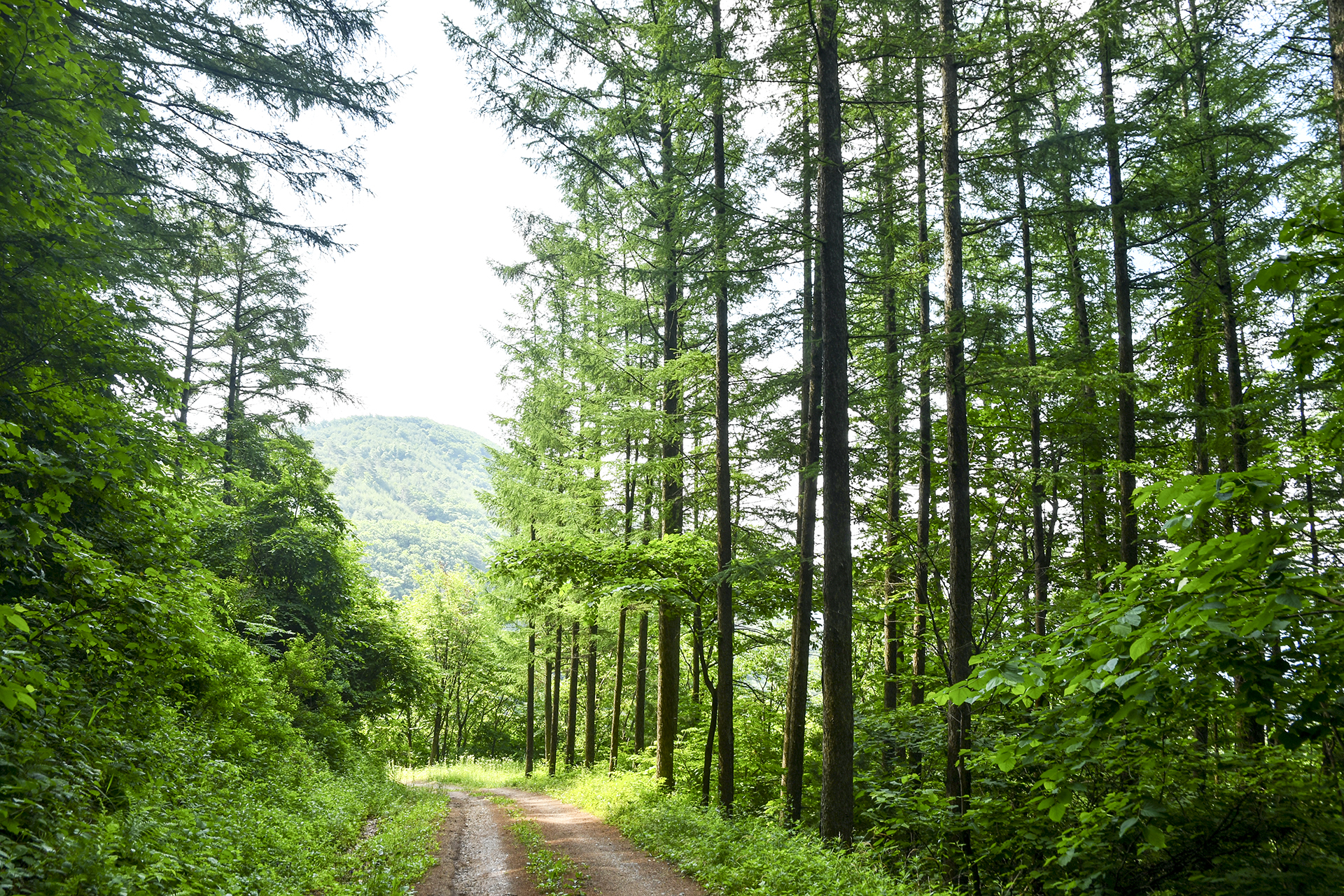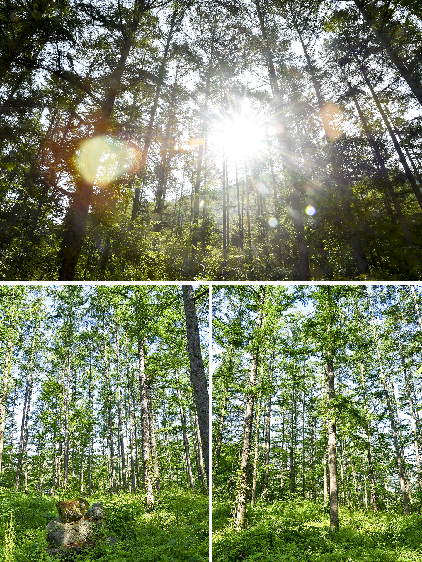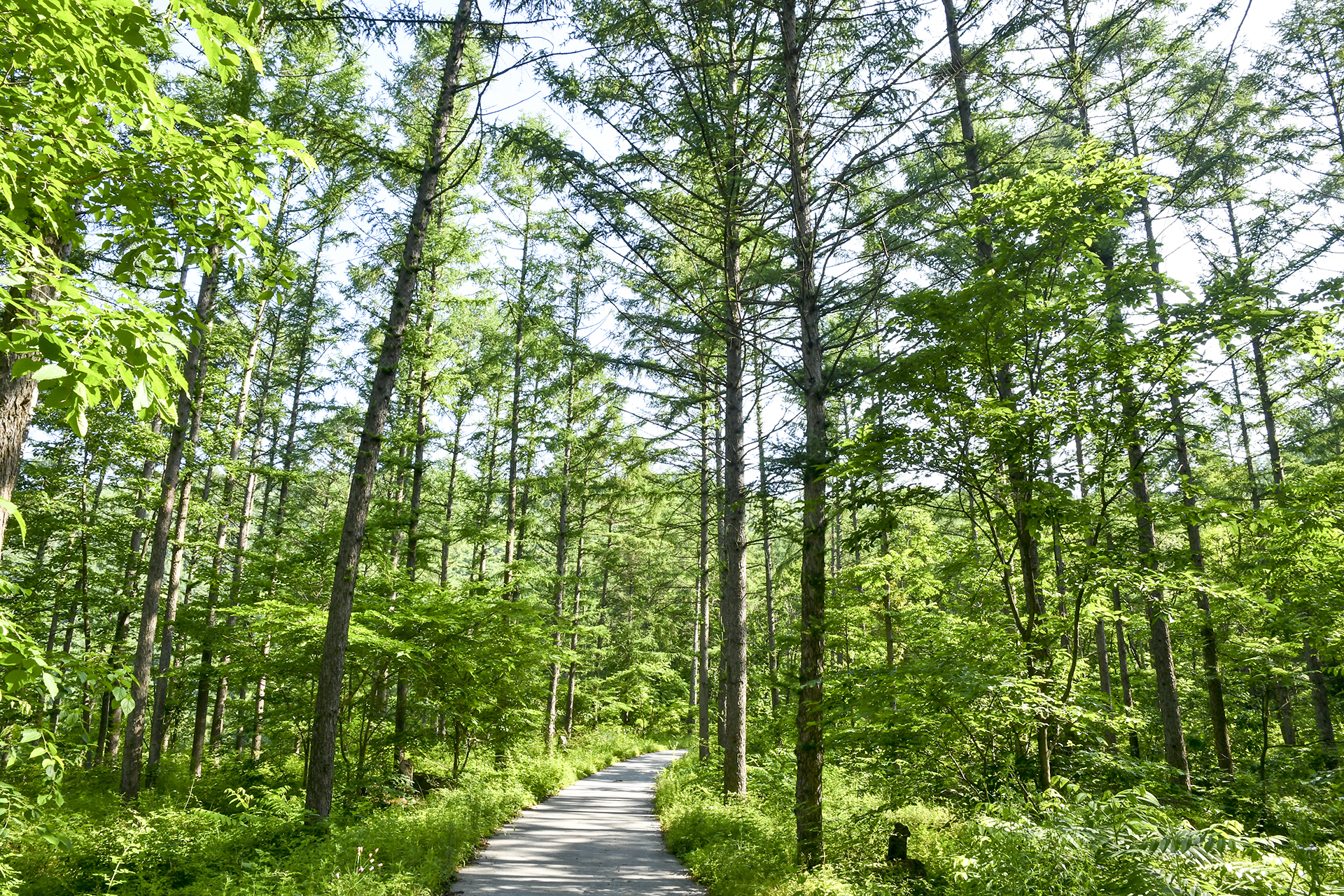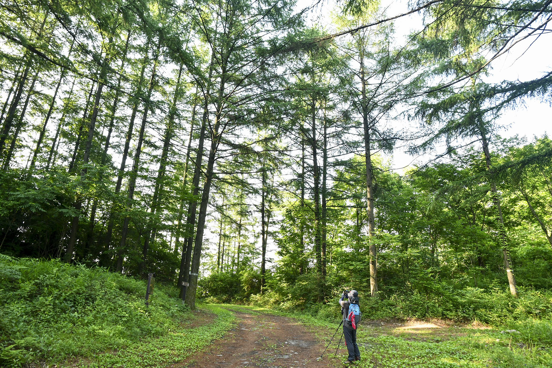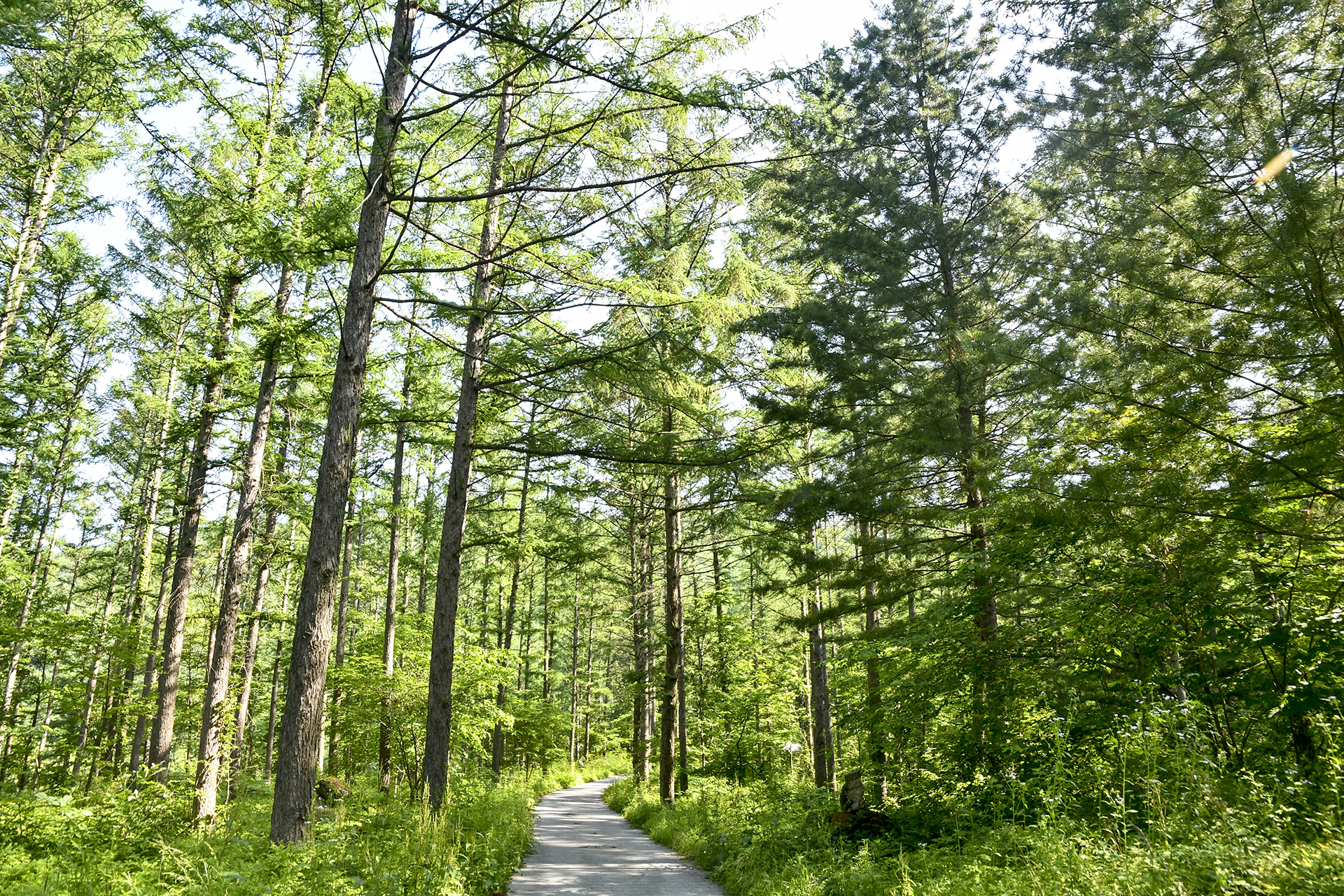 하늘 높이 솟은 낙엽송은 겨울 풍경과는 사뭇 다른 모습으로 또다른 멋을 보여준다.