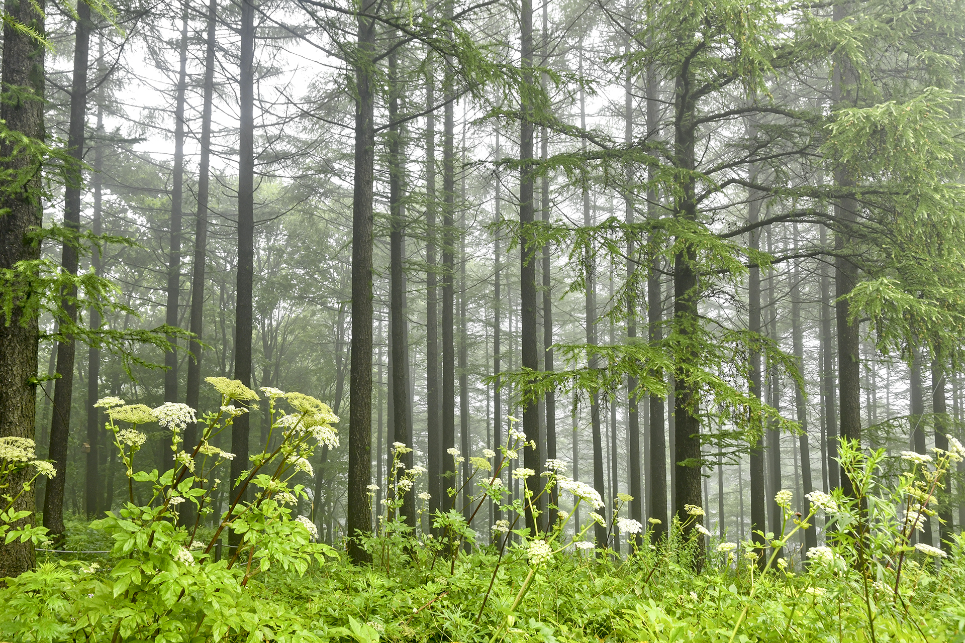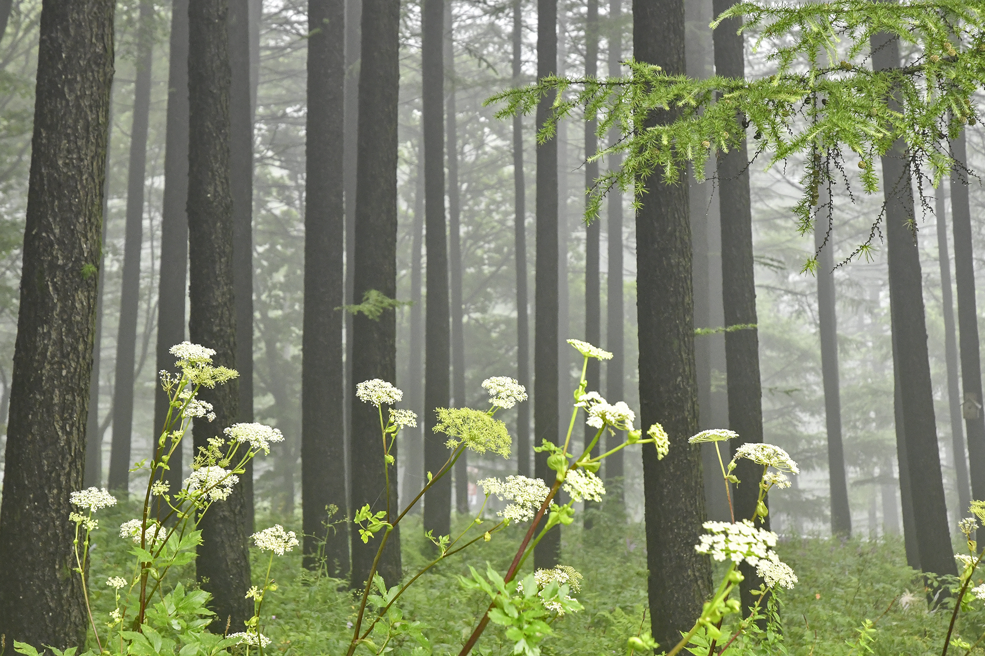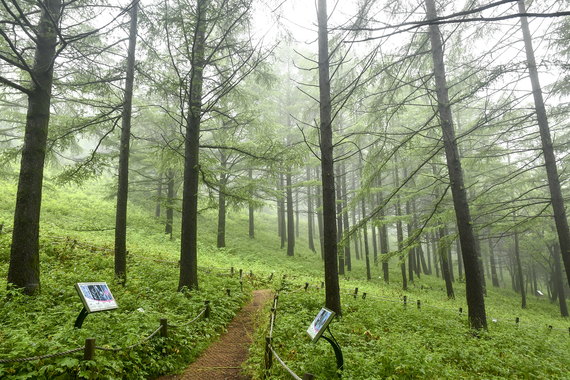 산상의 화원 입구에서 바라보는 낙엽송 숲은 그야말로 예술이다.