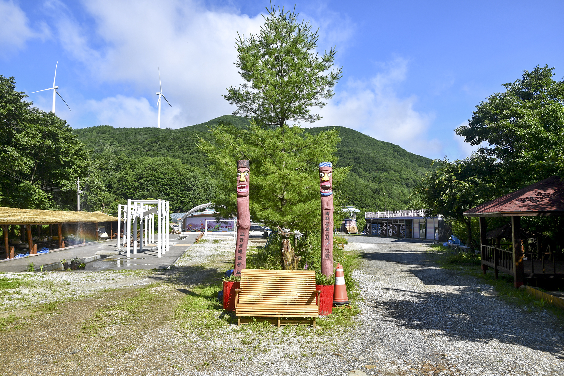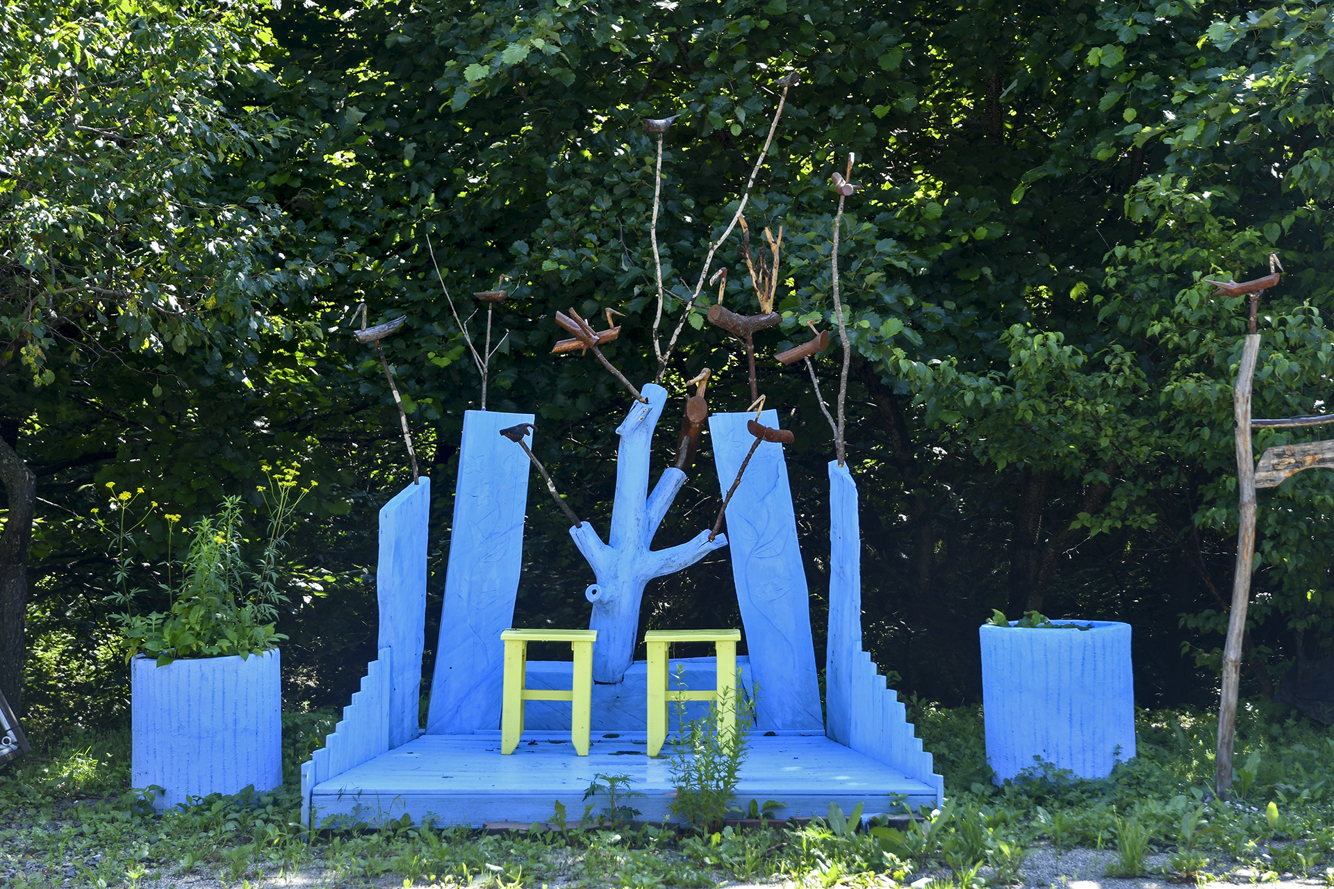 두개의 의자가 눈에 띄는 공연장의 모습, 솟대가 길을 안내하고 있다.
