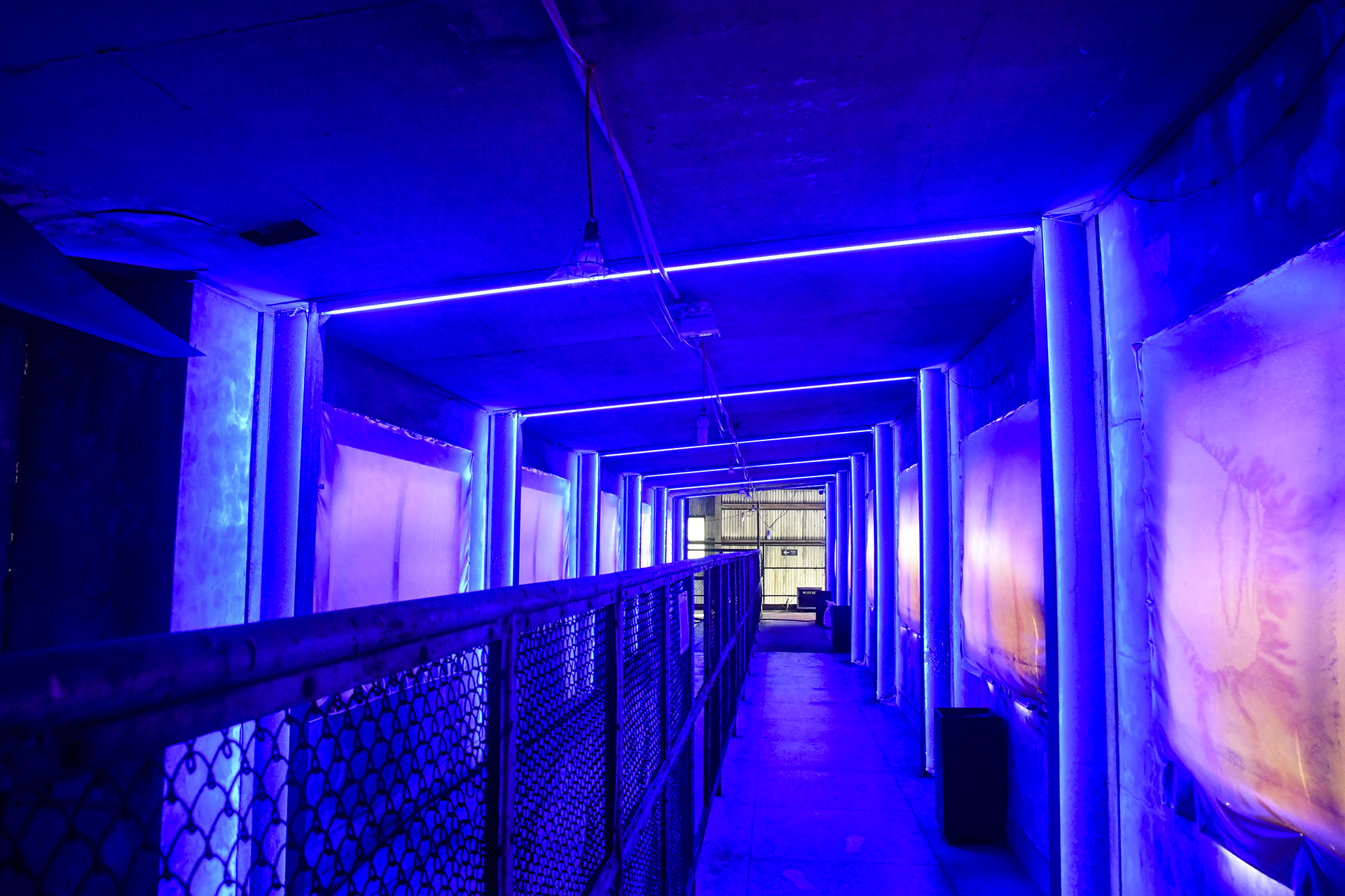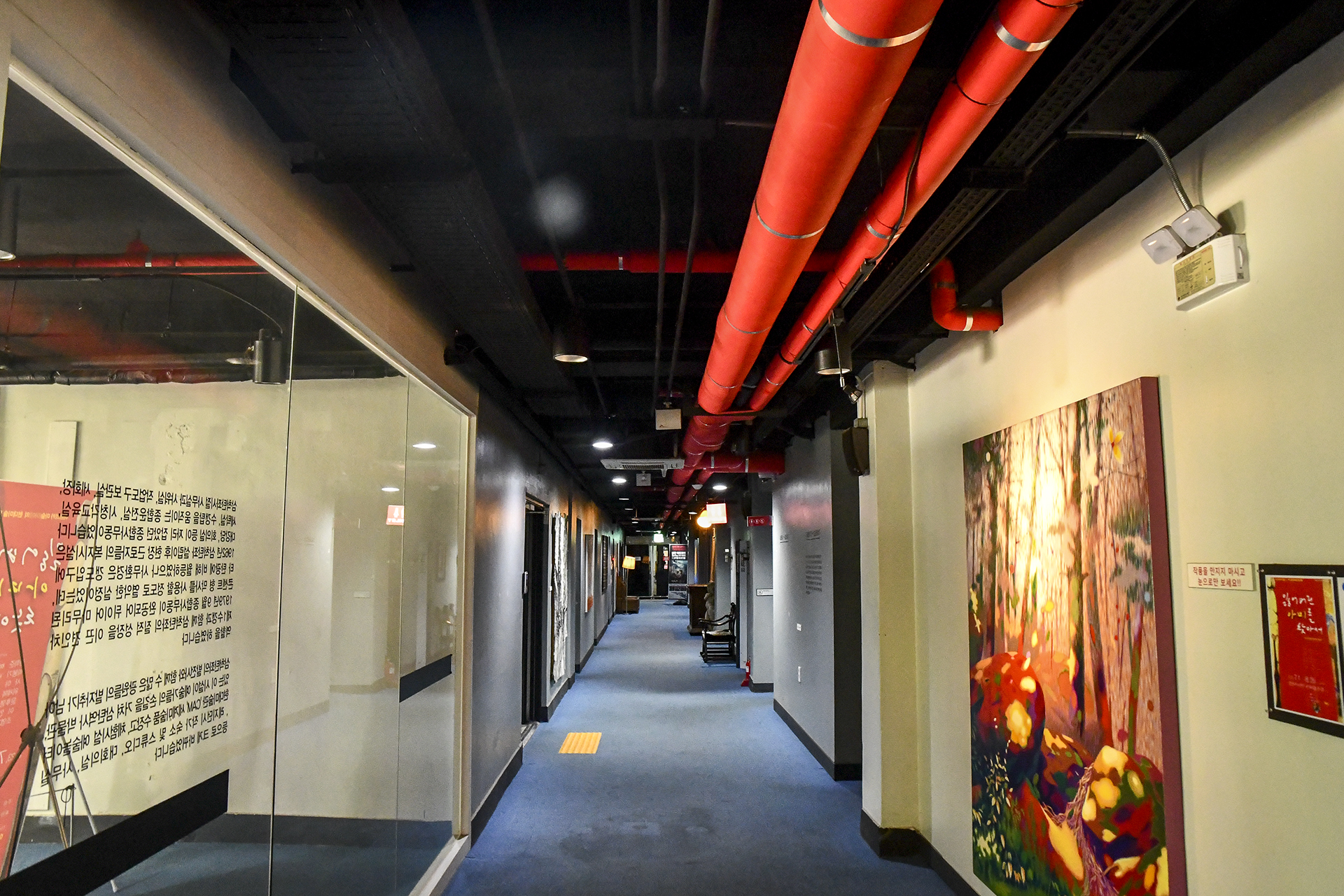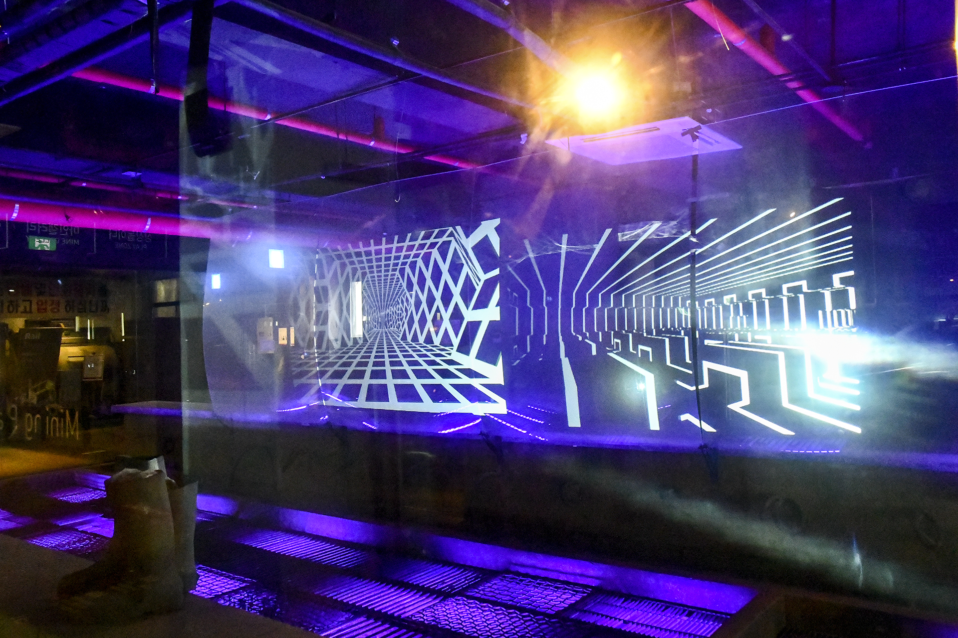 예술놀이터의 화려한 빔이 어두웠던 복도를 현란한 빛으로 밝혀준다.