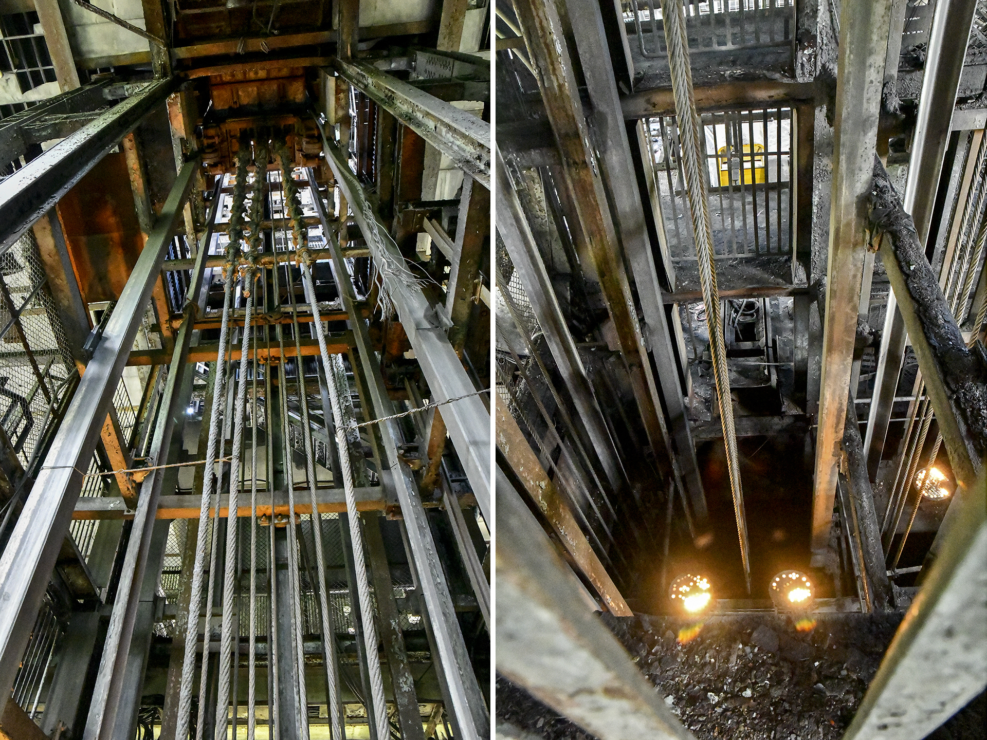 수직갱은 출발지인 조차장이 위치한 해발 832m 지점부터 해발 500m 지점까지는 초속 8m의 속도로, 이후부터는 초속 11m로 주행을 하며 4분에 1회씩 20톤의 석탄을 끌어올리고 광원들을 1회에 400명씩 지하 작업현장으로 운송하던 탄광의 엘리베이터 시설이었다.