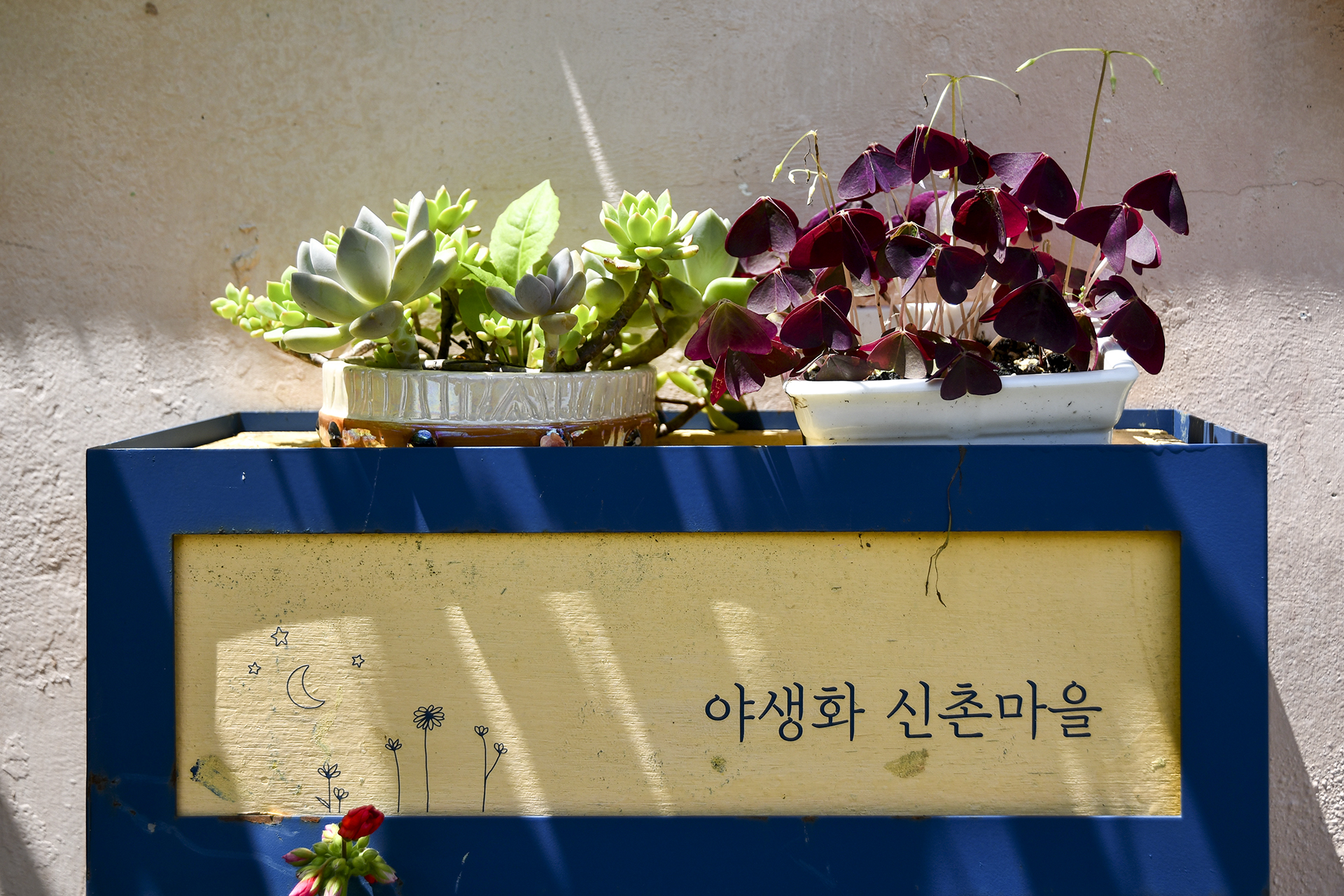 신촌 다육이 마을이라는 마을지번 명패가 걸려 있는데 신촌마을에서는 다양한 다육이를 볼 수 있다.