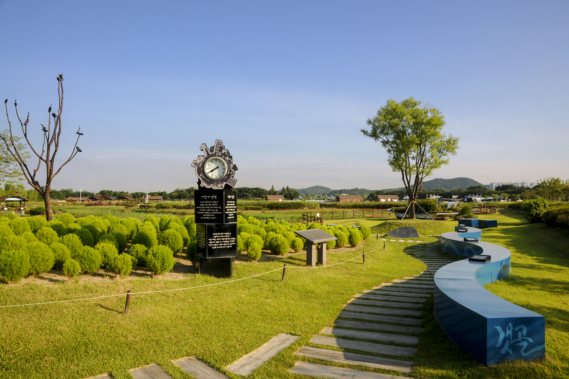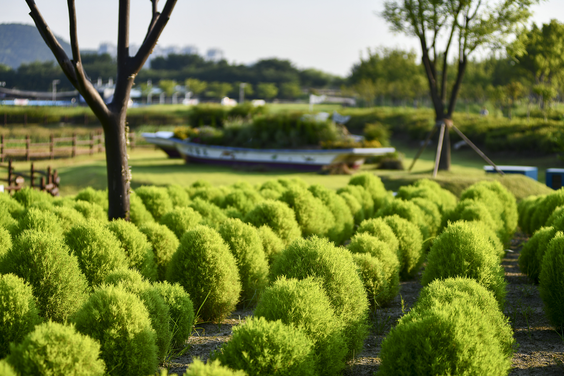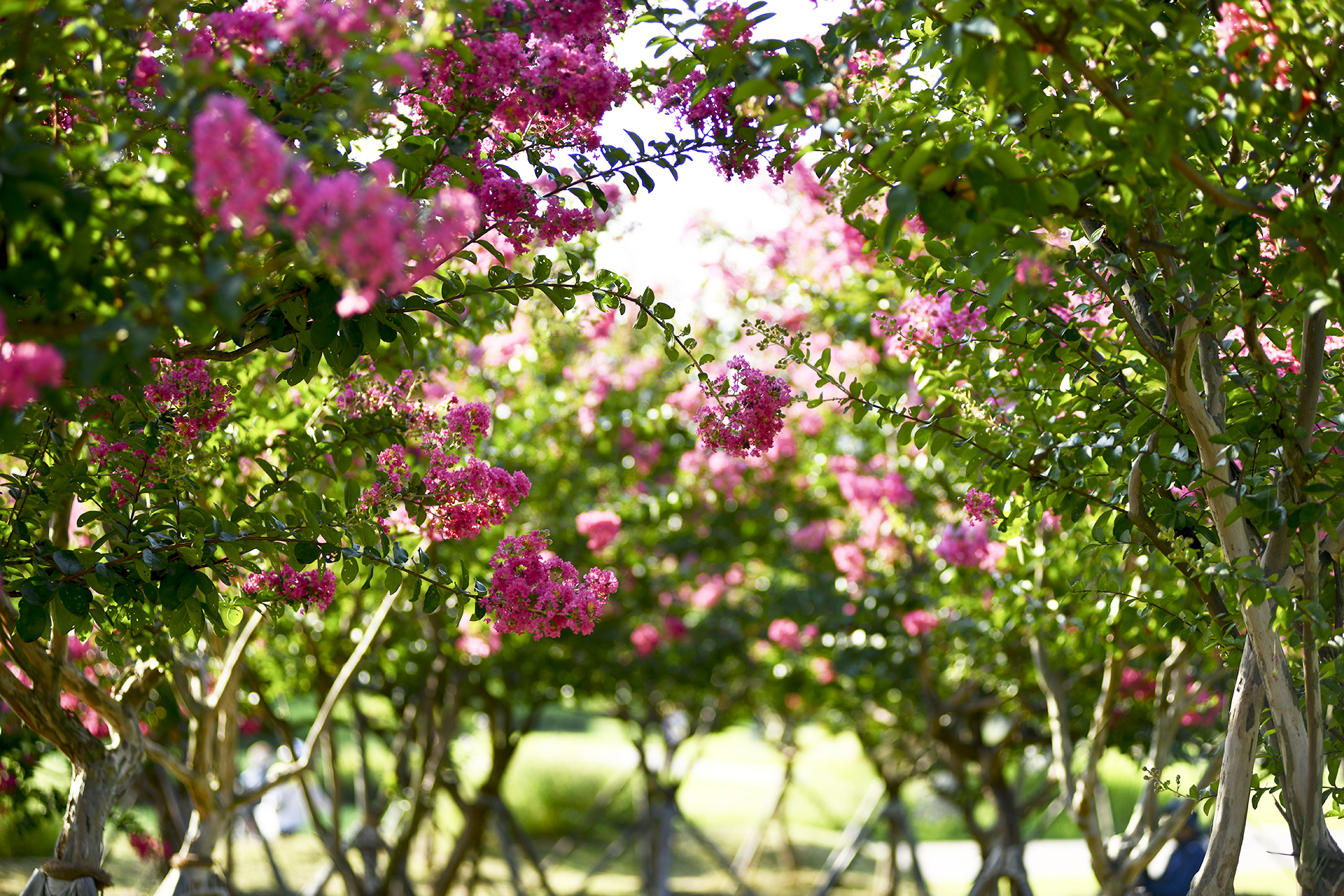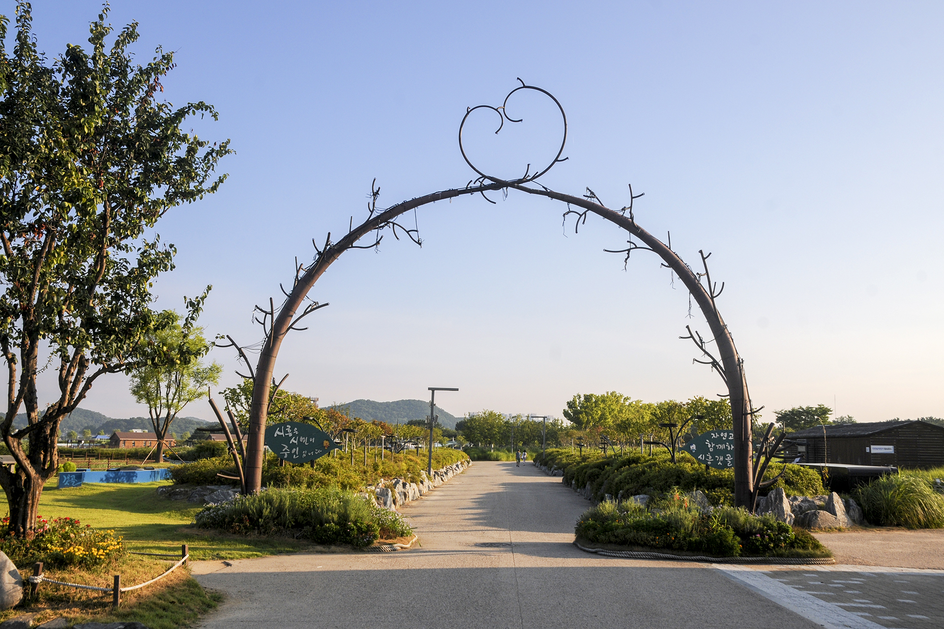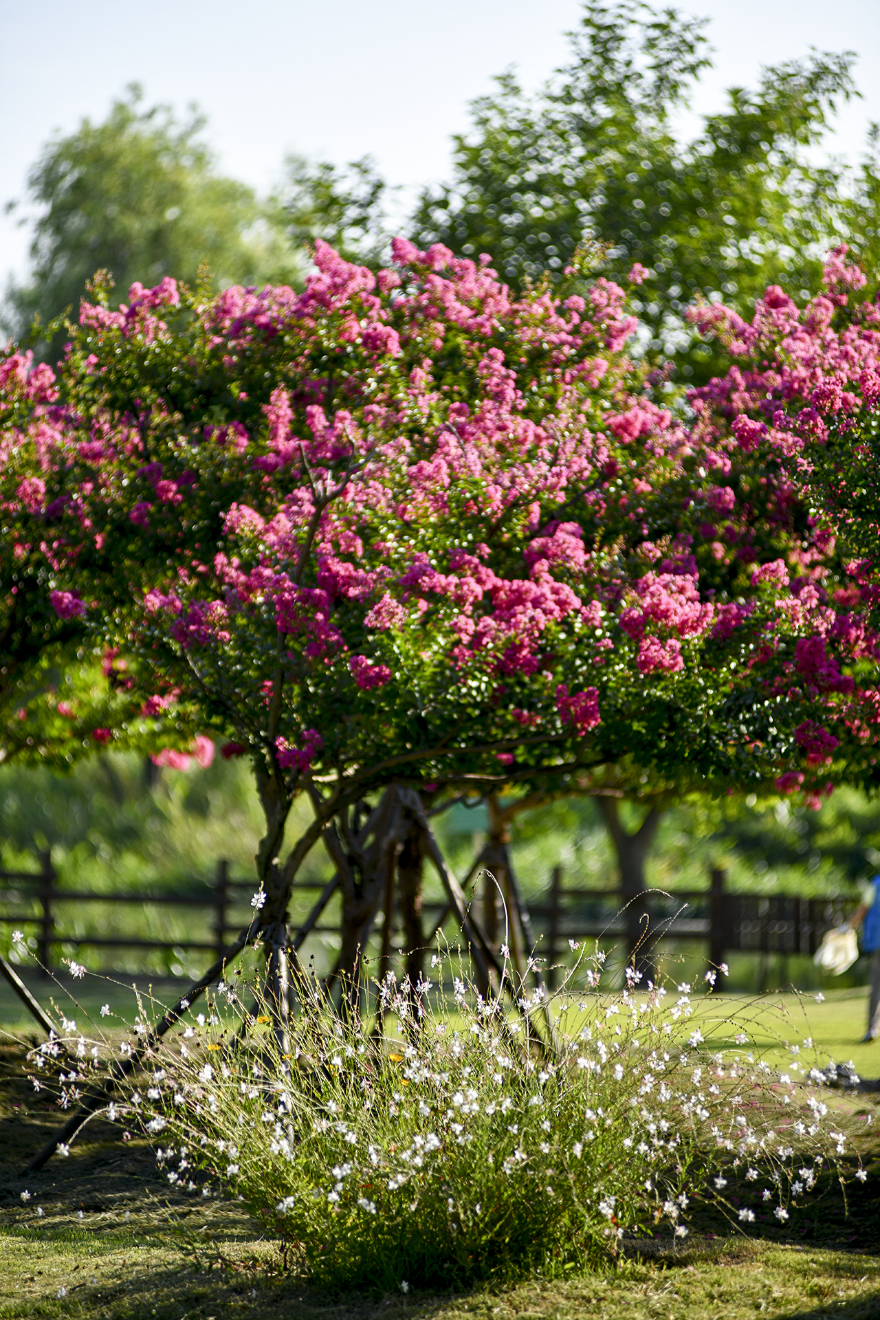 공원 입구의 아치, 왼쪽은 댑싸리, 직진은 배롱나무꽃, 오른쪽으로는 버베나 꽃밭이 있다.