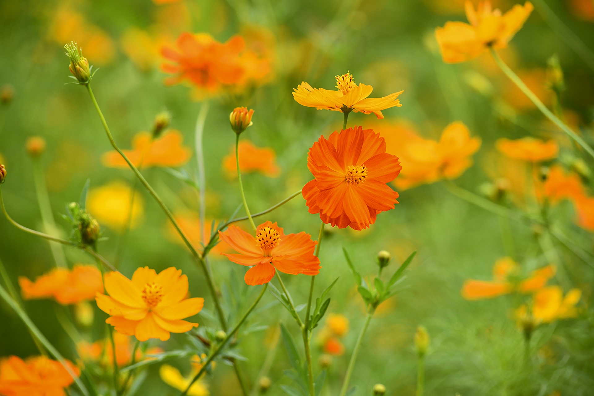 좌측에는 일반 코스모스, 여기저기에서 이제 피기 시작하는 중이다.