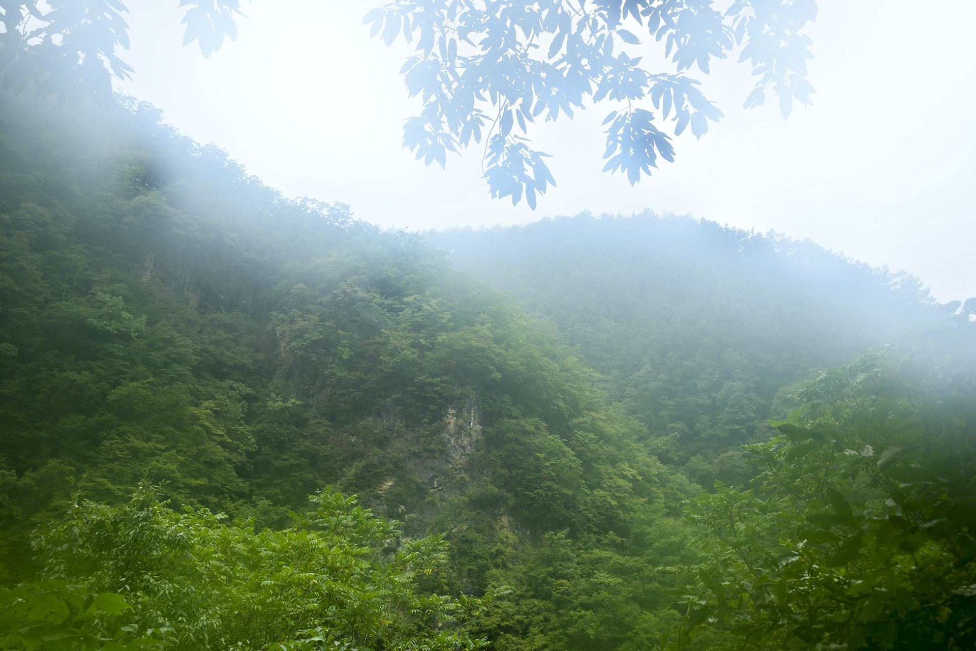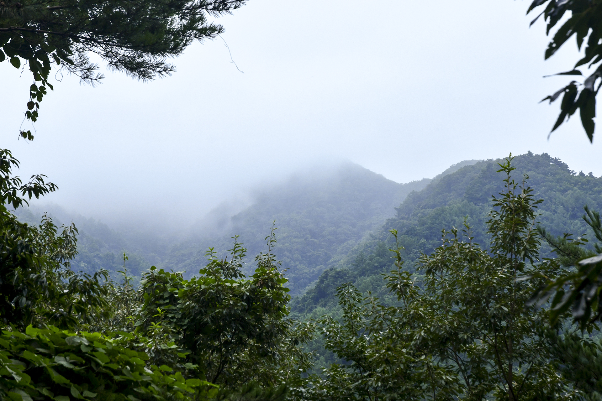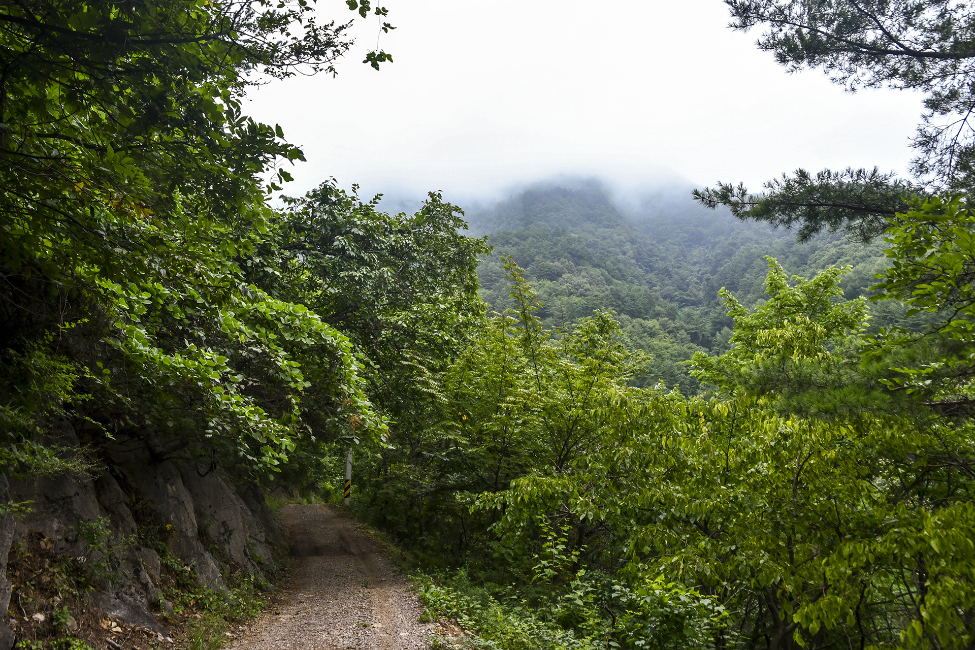 처음으로 주변 풍경이 트였다. 산꼭대기는 안개에 휘감겨 있고,