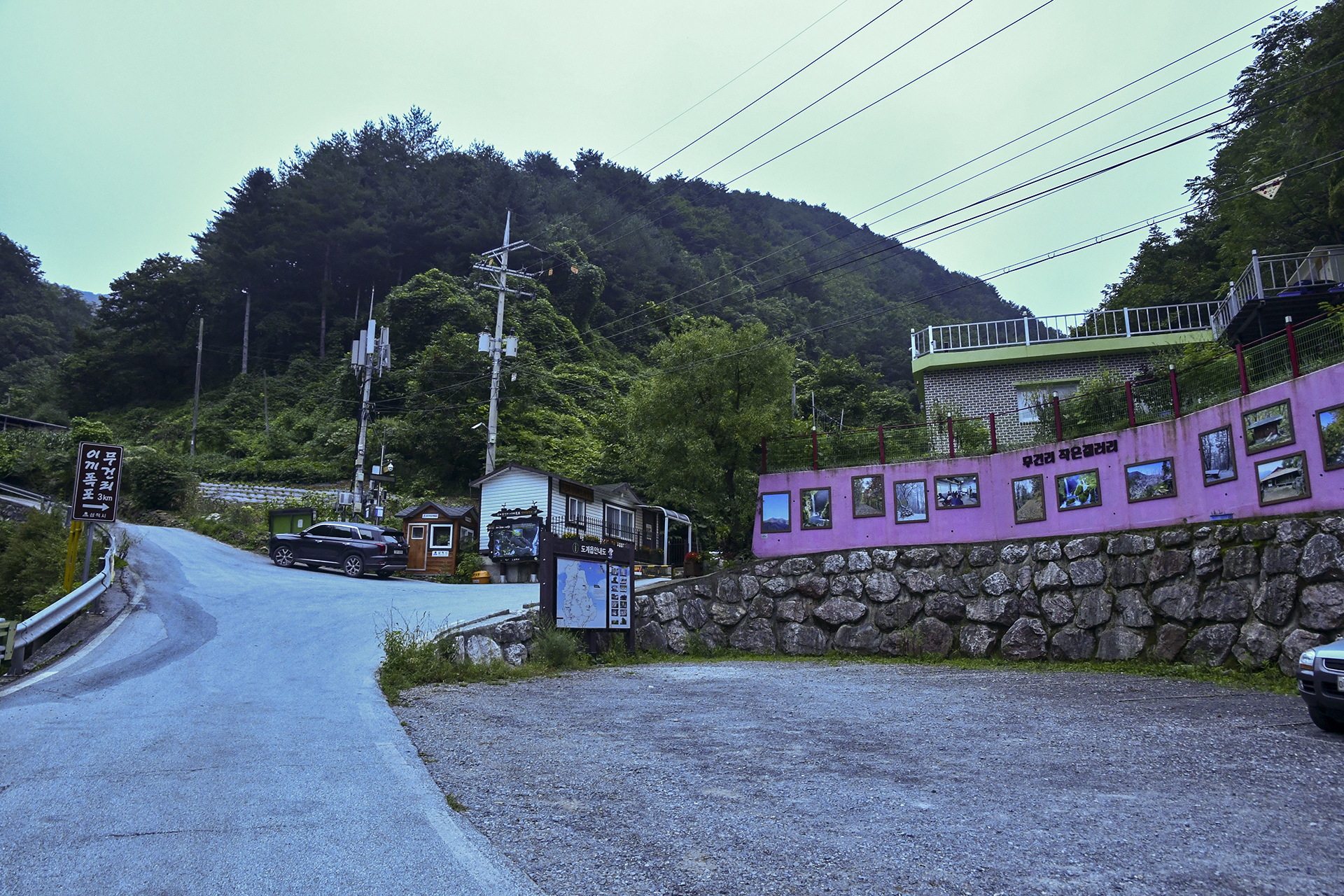 주차장 담장에는 무건리 작은갤러리가 있고, 육백산과 이끼폭포의 사진들이 전시되어 있다.
