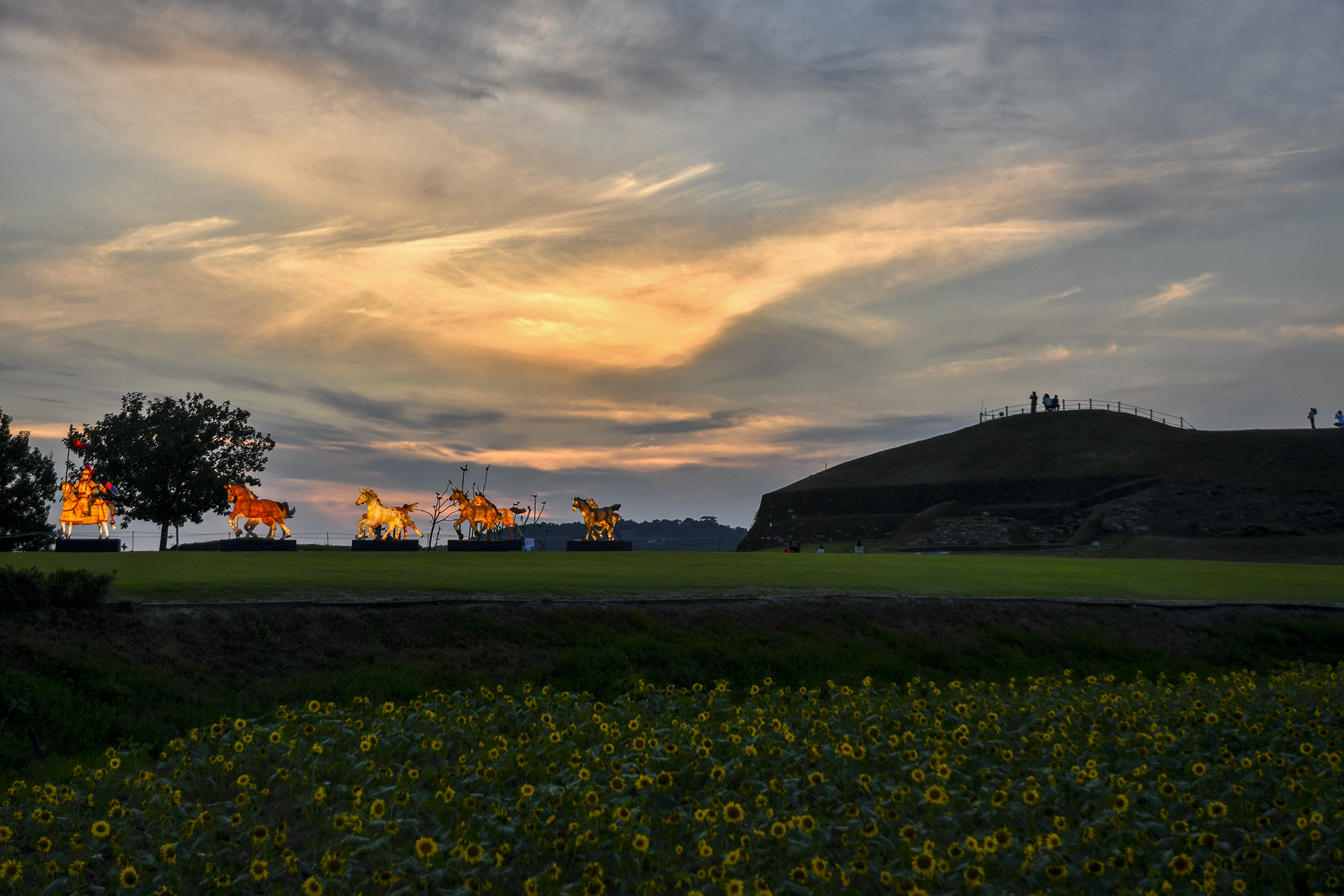 태양속에서 산다는 상상 속의 동물인 세 발 달린 까마귀, 삼족오 석상 위로 해가 내려 앉는다.