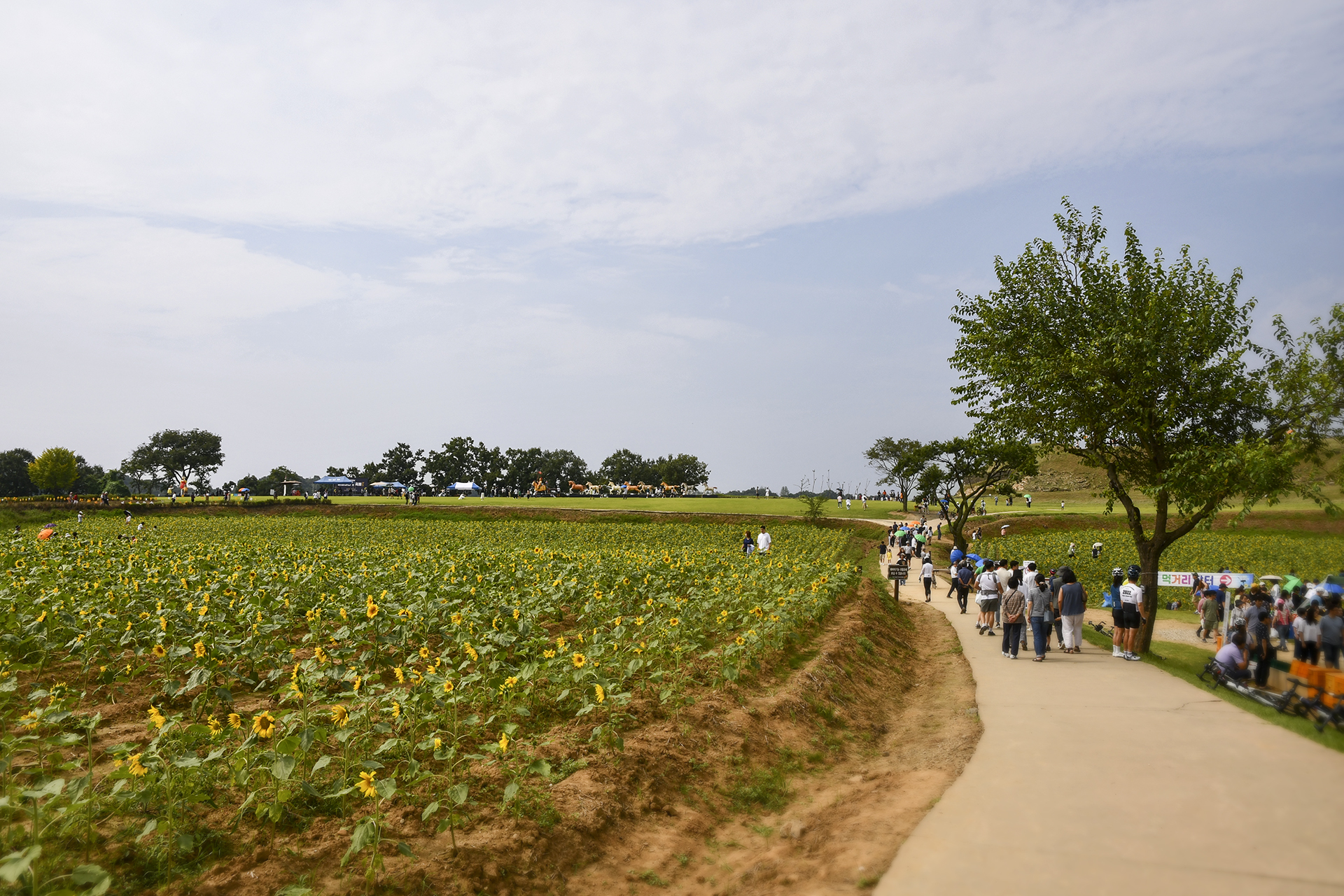 주 진입로로 들어서면 양쪽으로 해바라기가 활짝 피었고, 우측에는 행사천막이 설치되어 먹거리장터가 열리는 중이다.