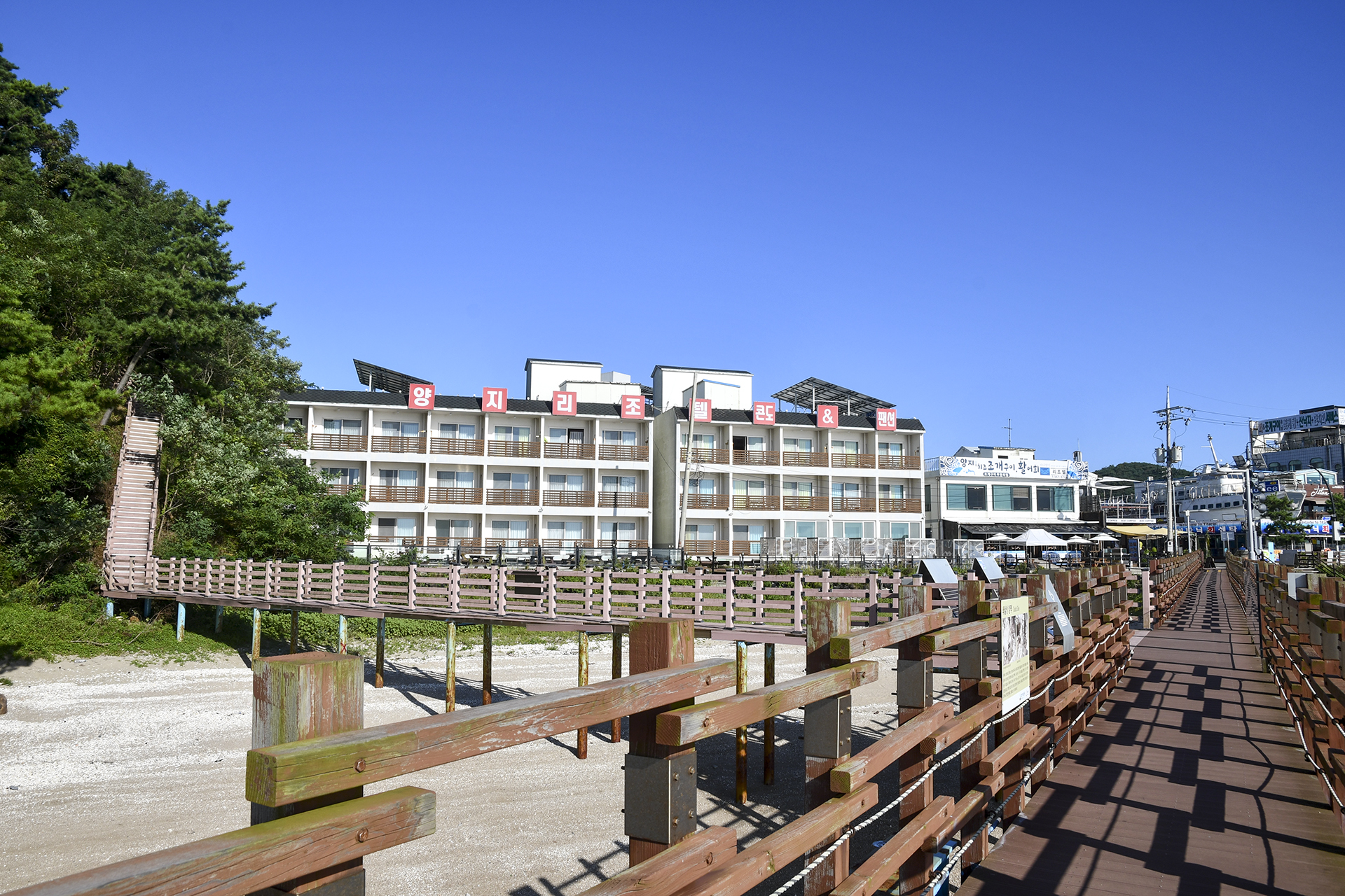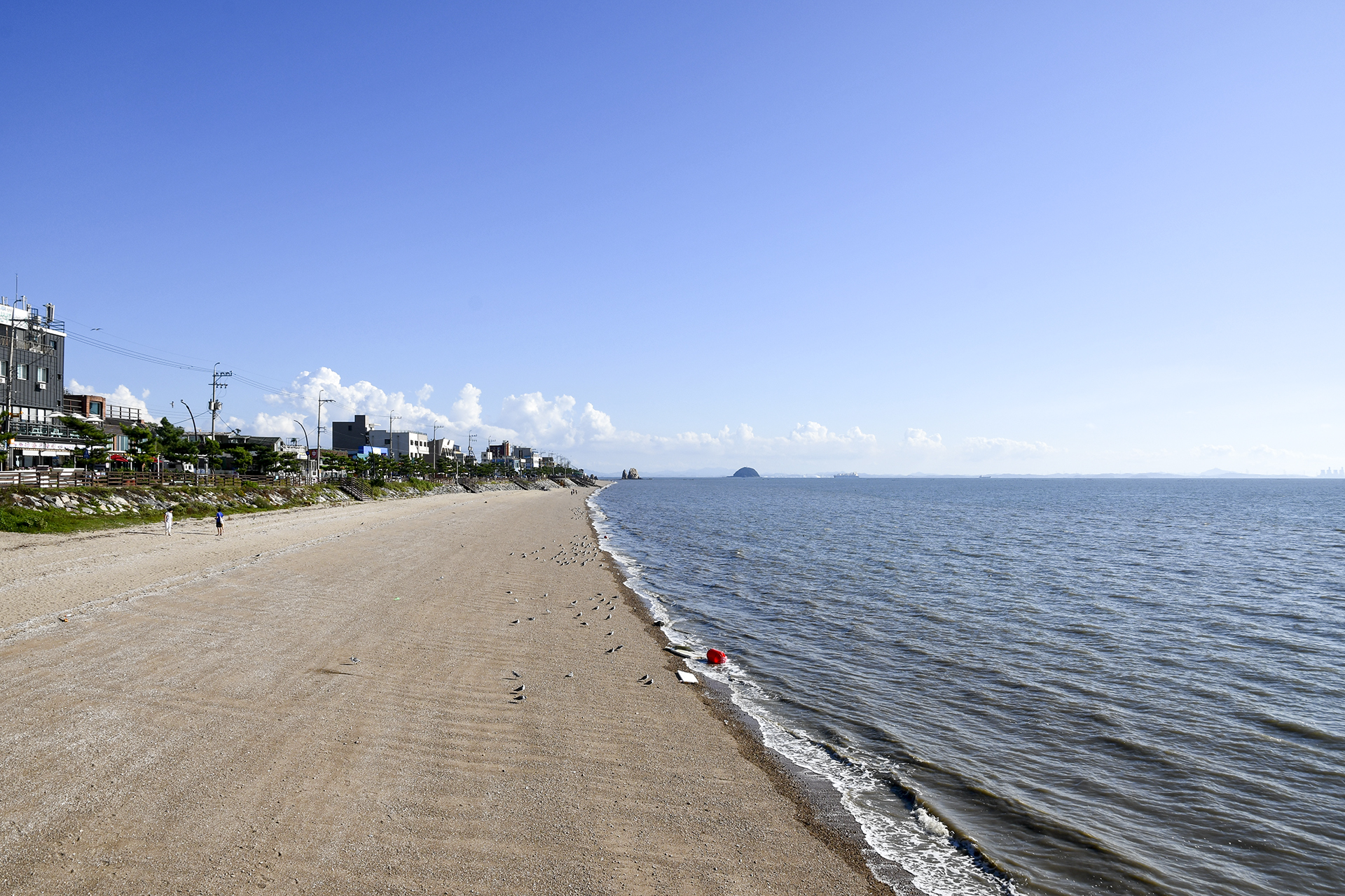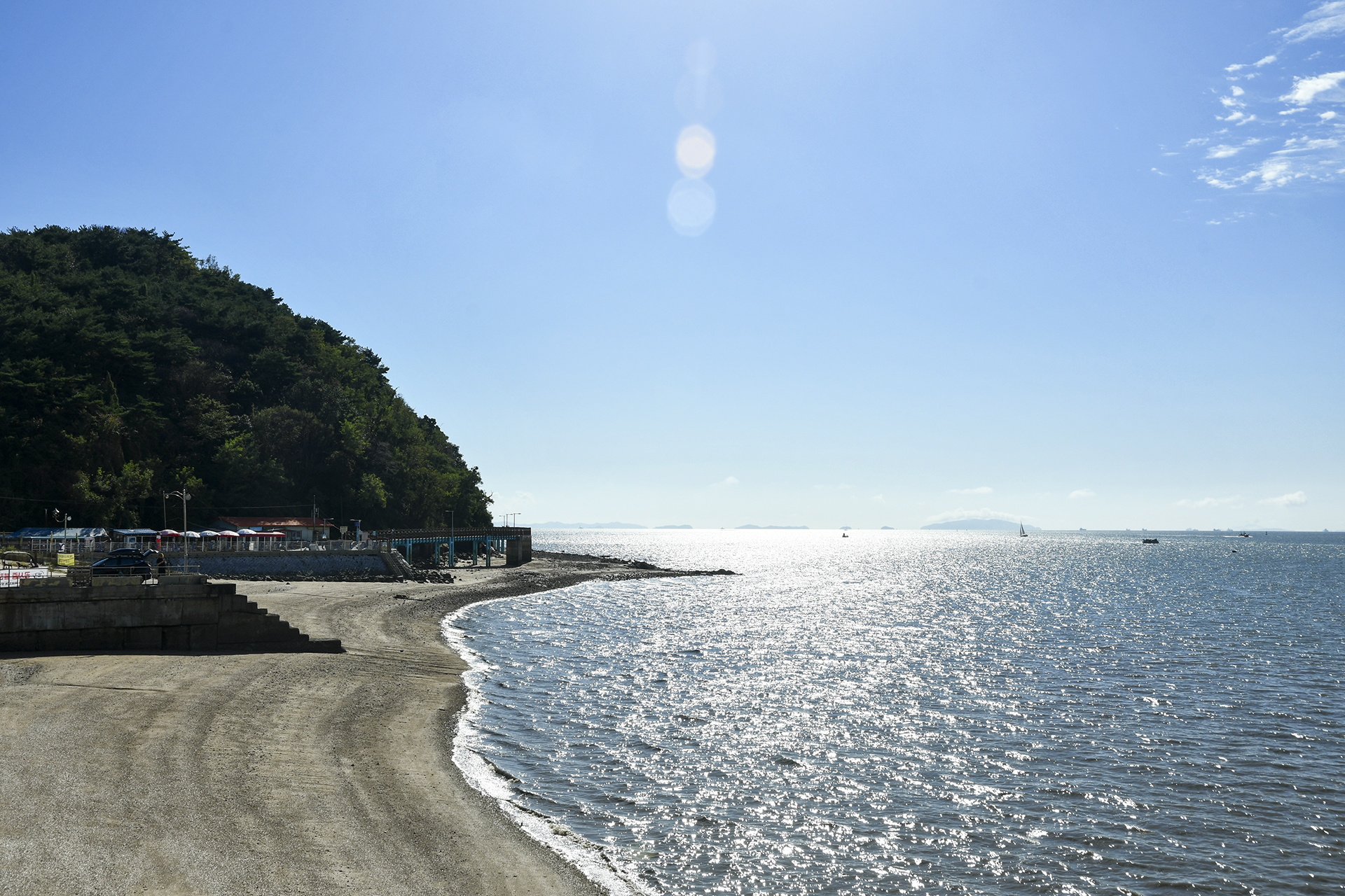 오른쪽으로 해수욕장의 모래 해변이 펼쳐져 있다.