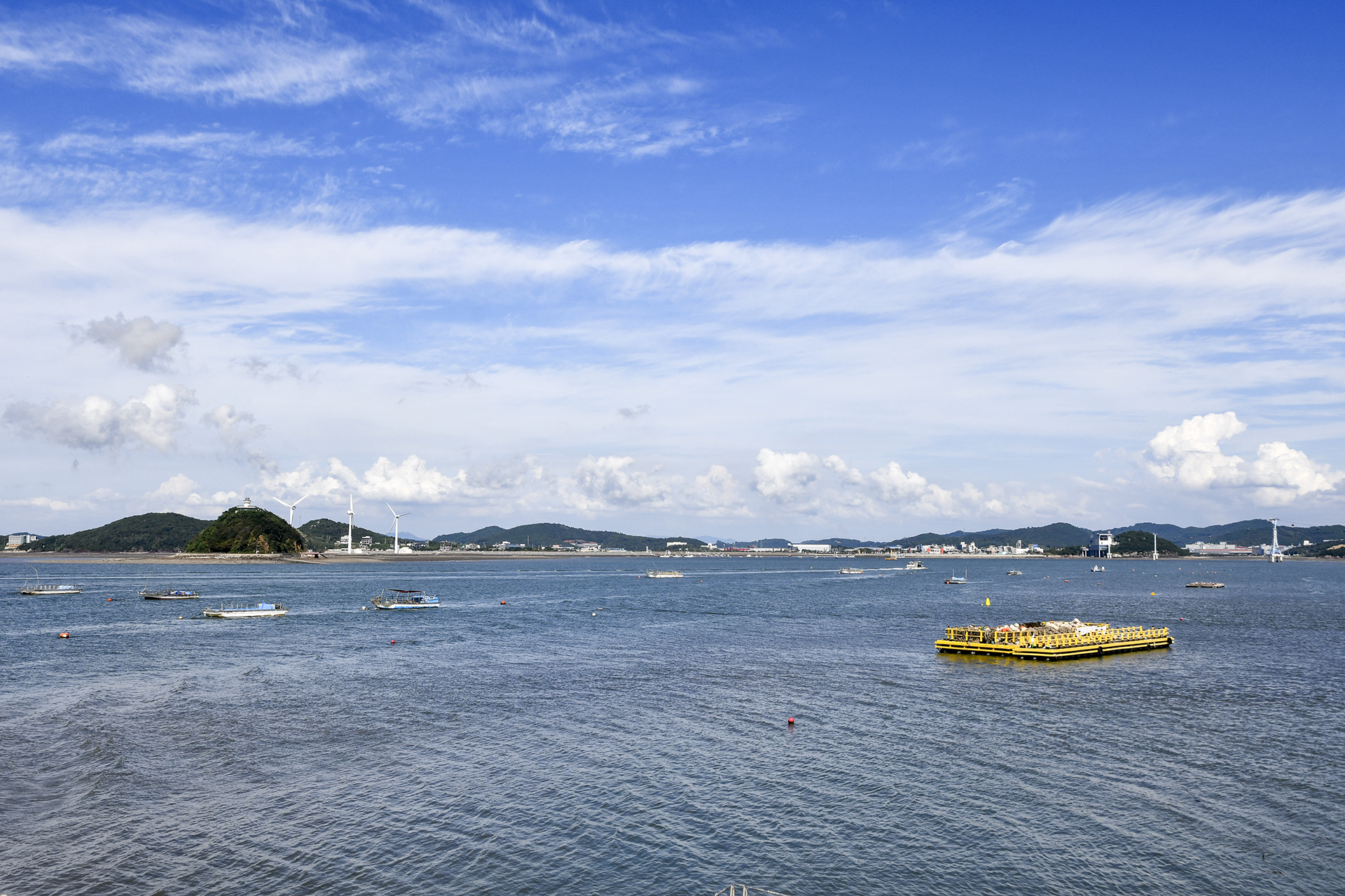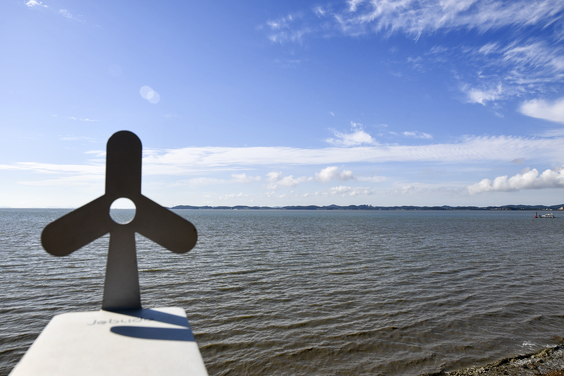 탄도항의 누에섬과 3기의 풍차가 가깝게 조망된다.