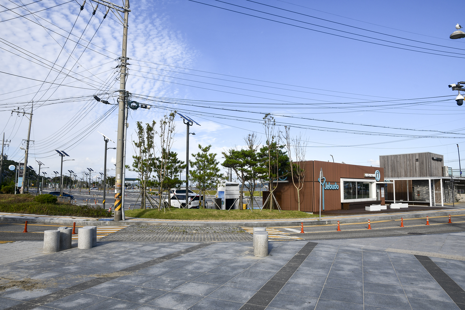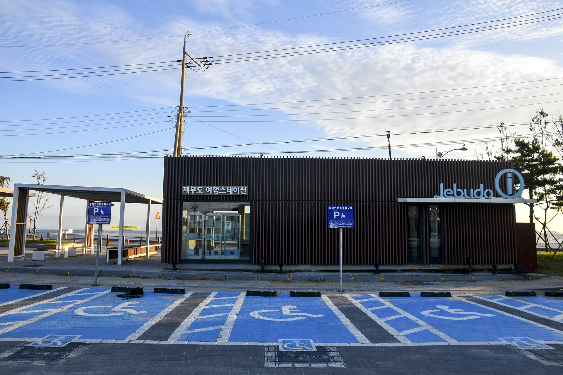 매바위 광장에 있는 제부도 여행스테이션과 뒤로 넓은 공영주차장이 있다.