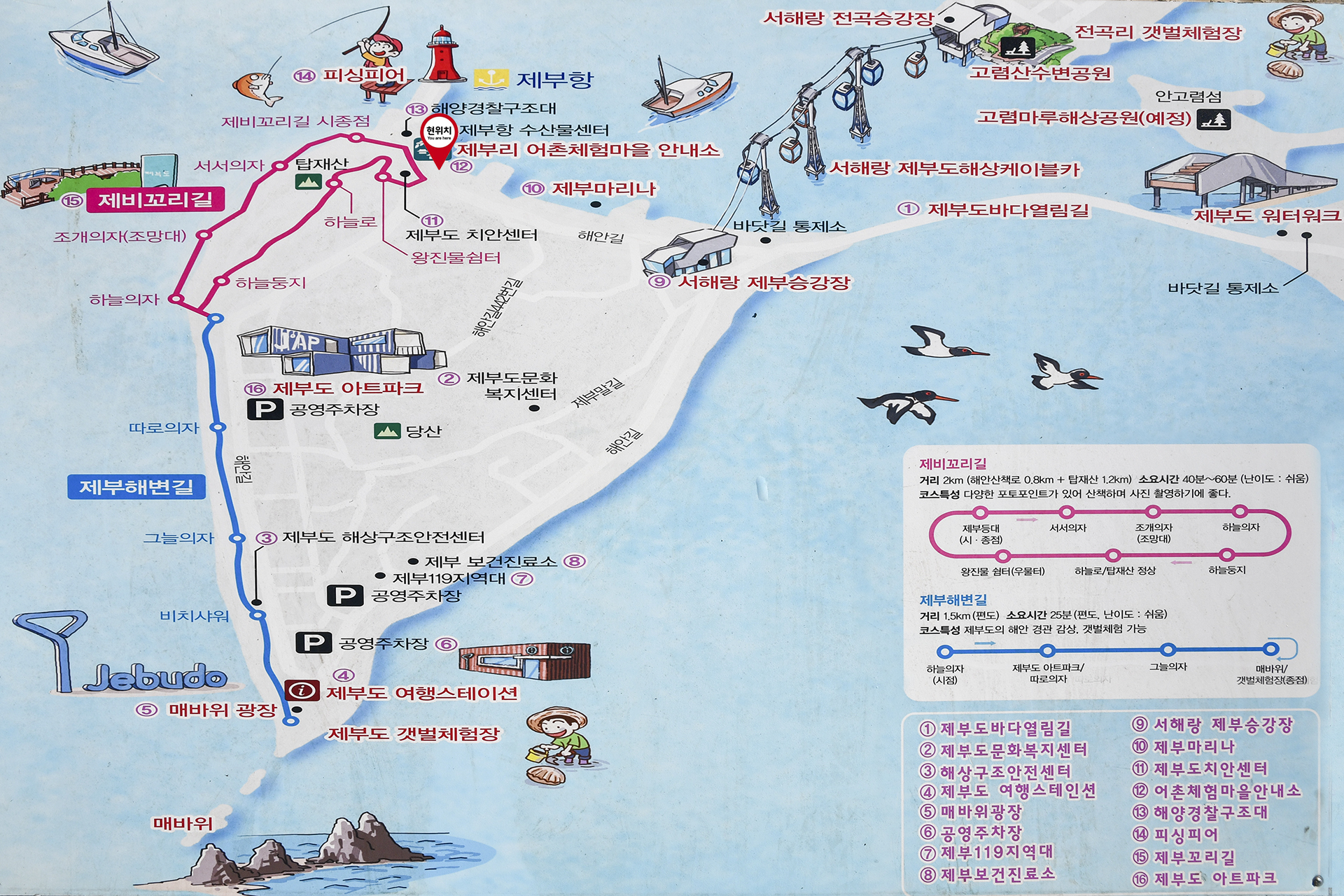 제부정류장(케이블카탑승장) - 선착장 - 제부아트파크 - 놀이동산 - 매바위광장 - 갯벌민박앞 - 캠핑장입구