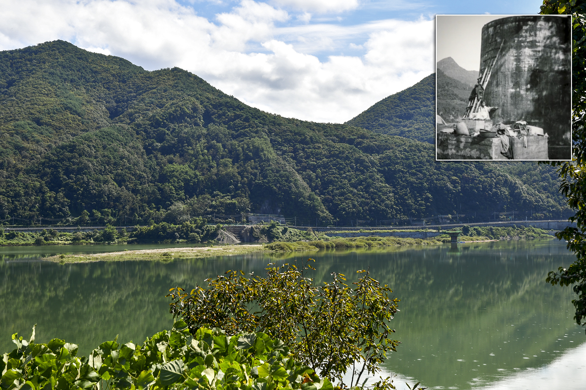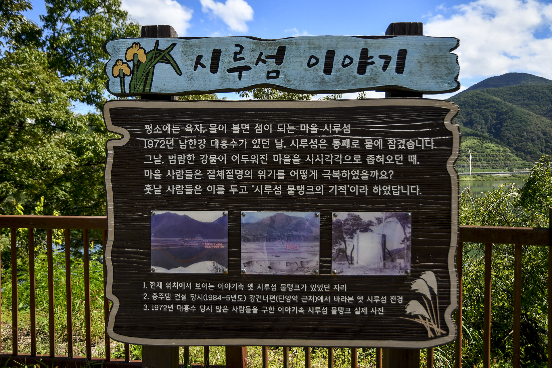 뒷편 남한강에는 가장 높은 부분만 모습을 드러낸 현재의 시루섬을 볼수 있다. 첨부사진은 당시 실제 물탱크의 모습.