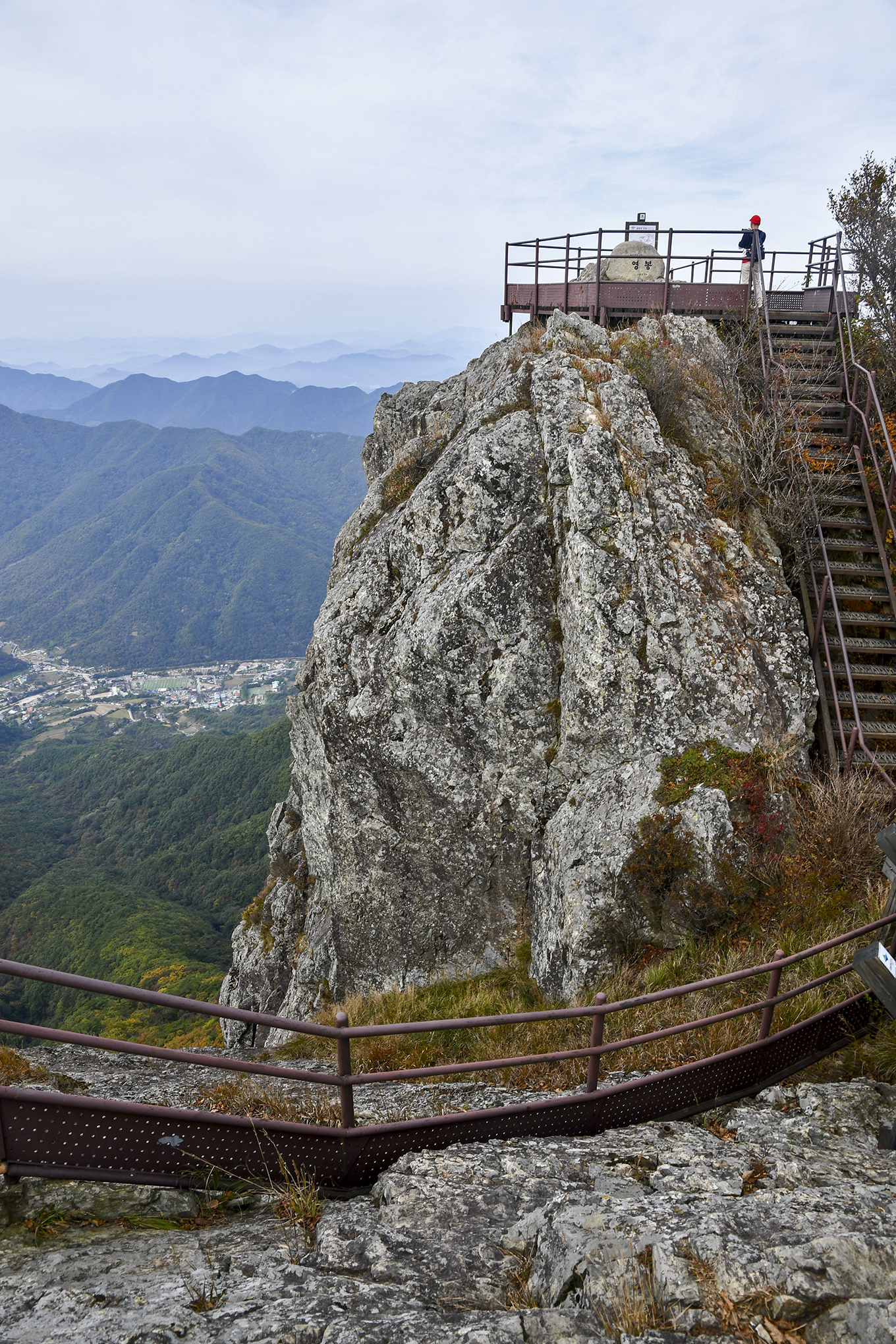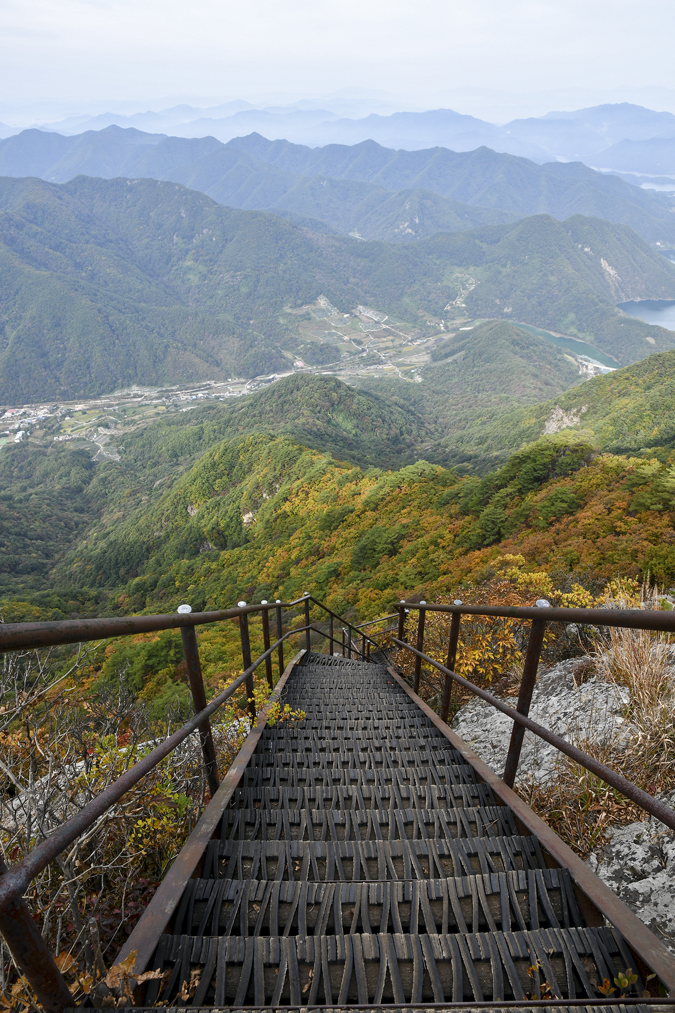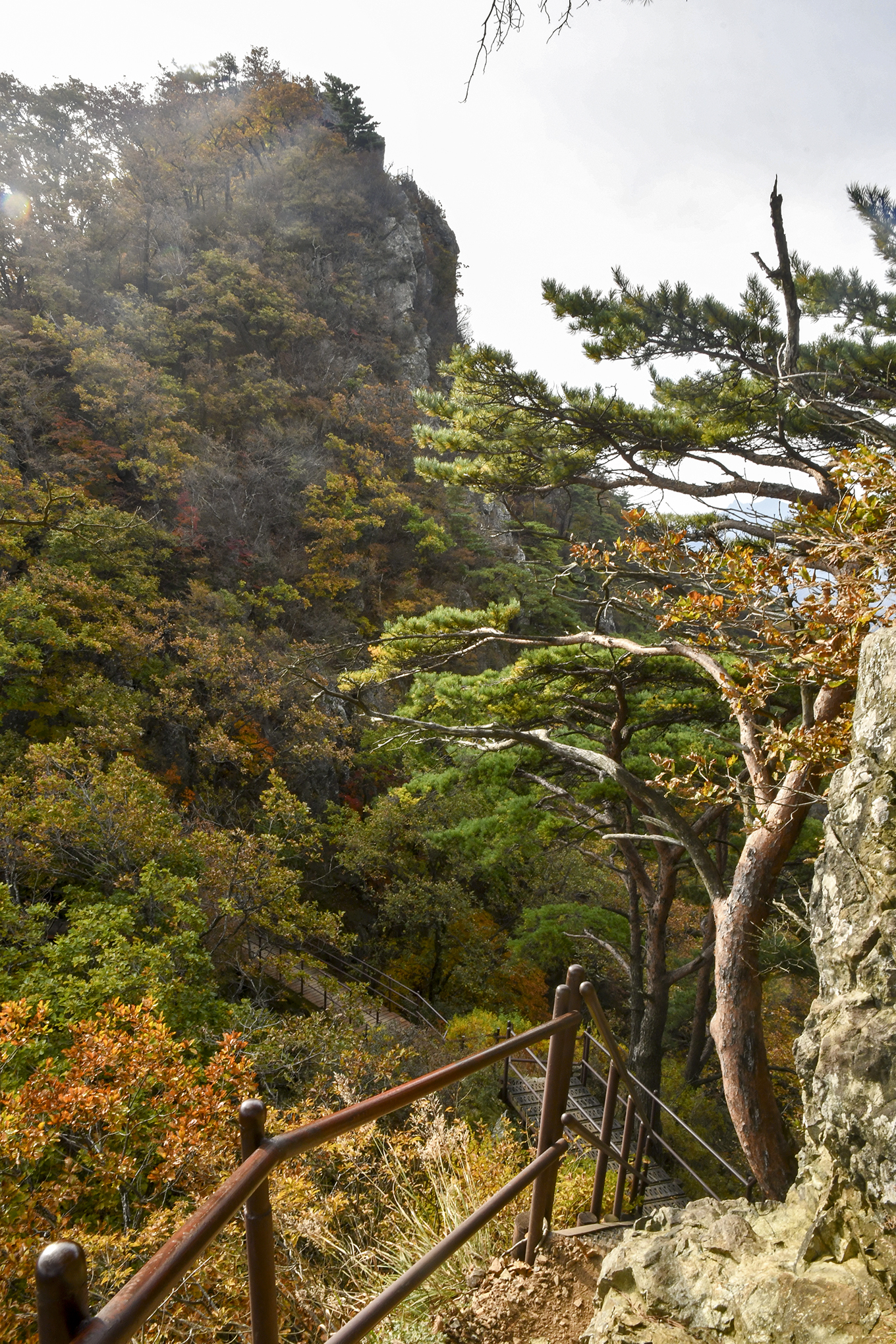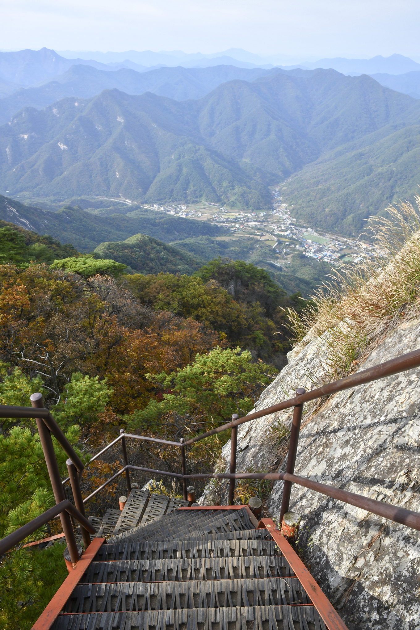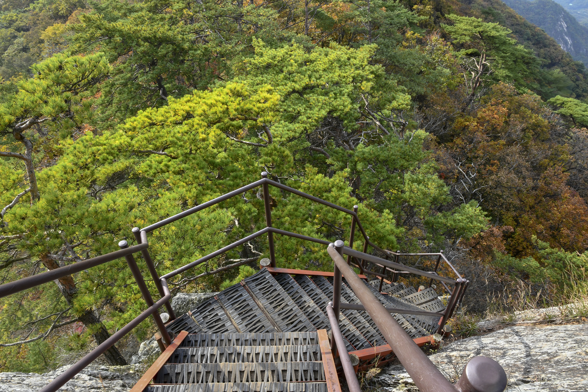 영봉을 이루는 암벽 높이만도 150m가 되는데, 그 기암 절벽 사이로 계단으로 이어 놓았다.