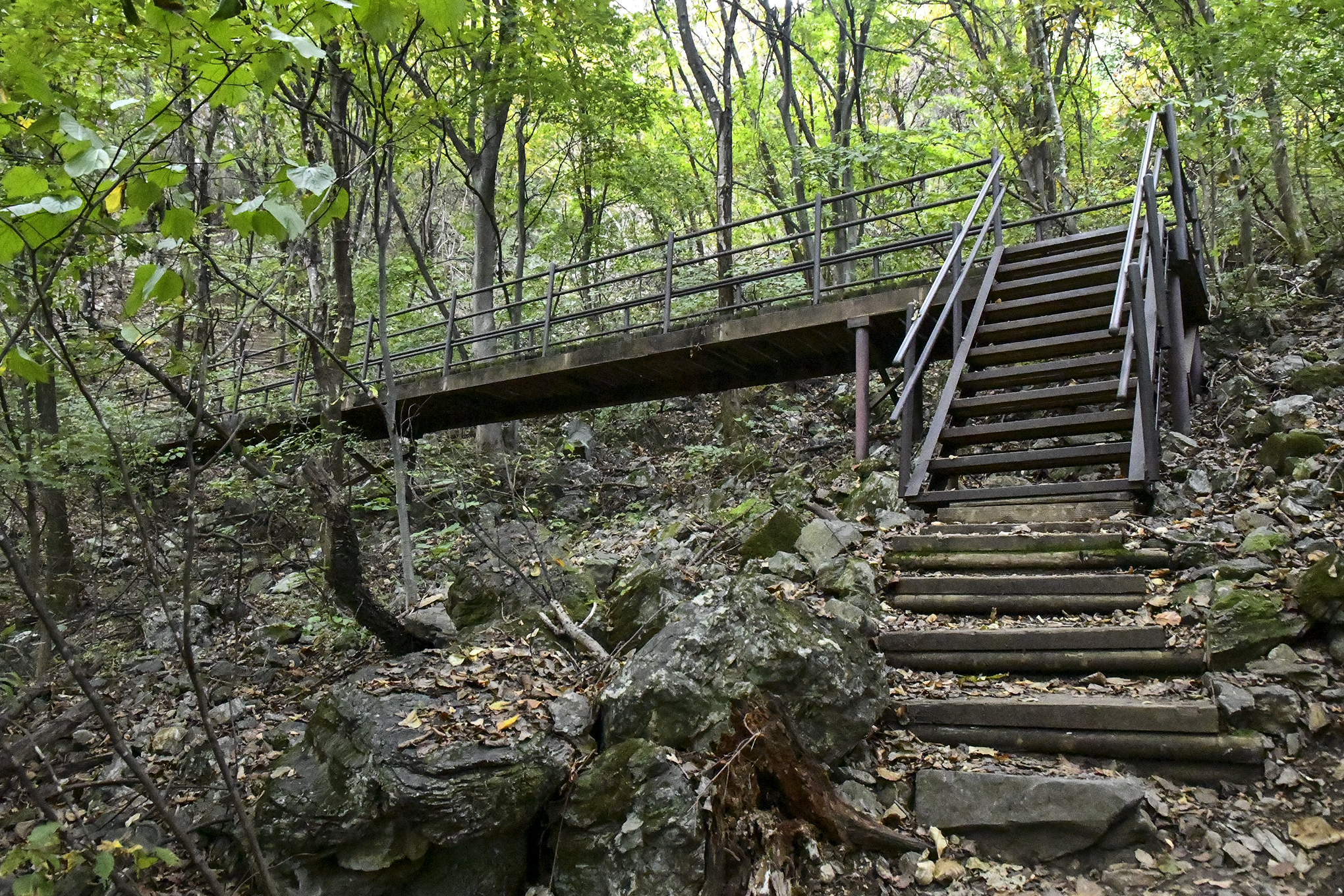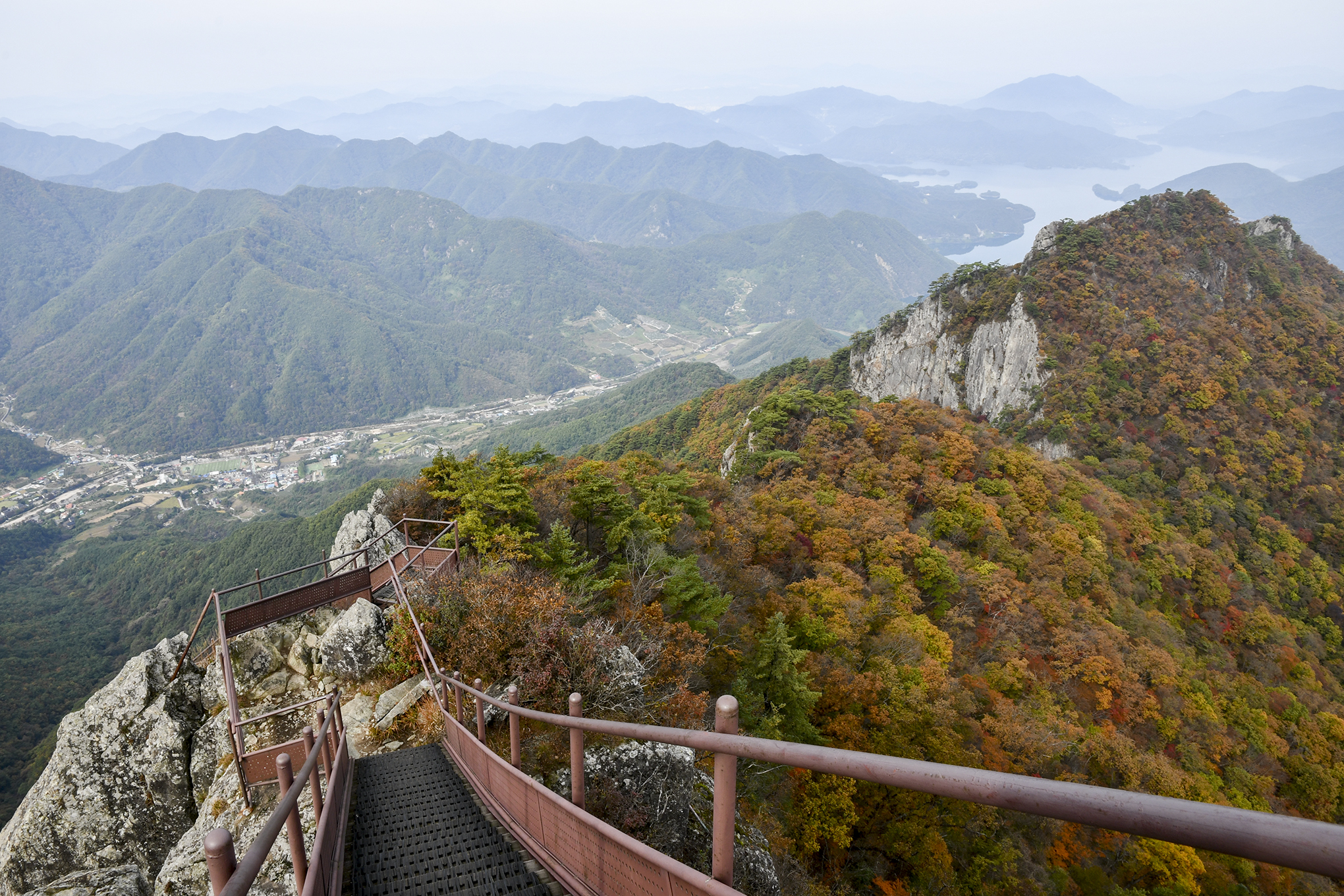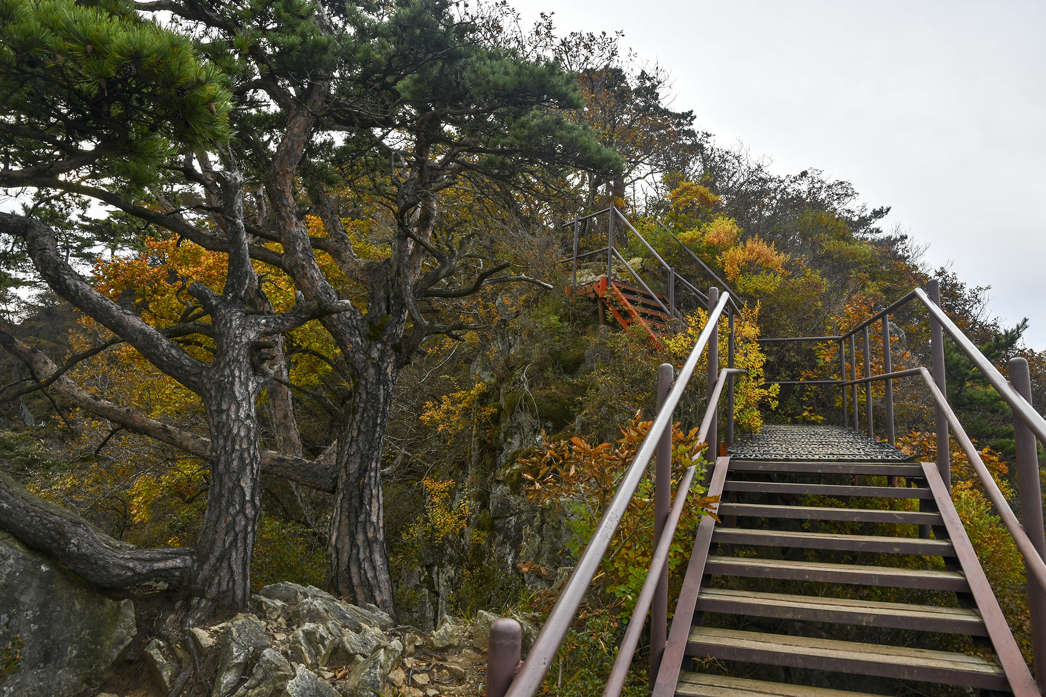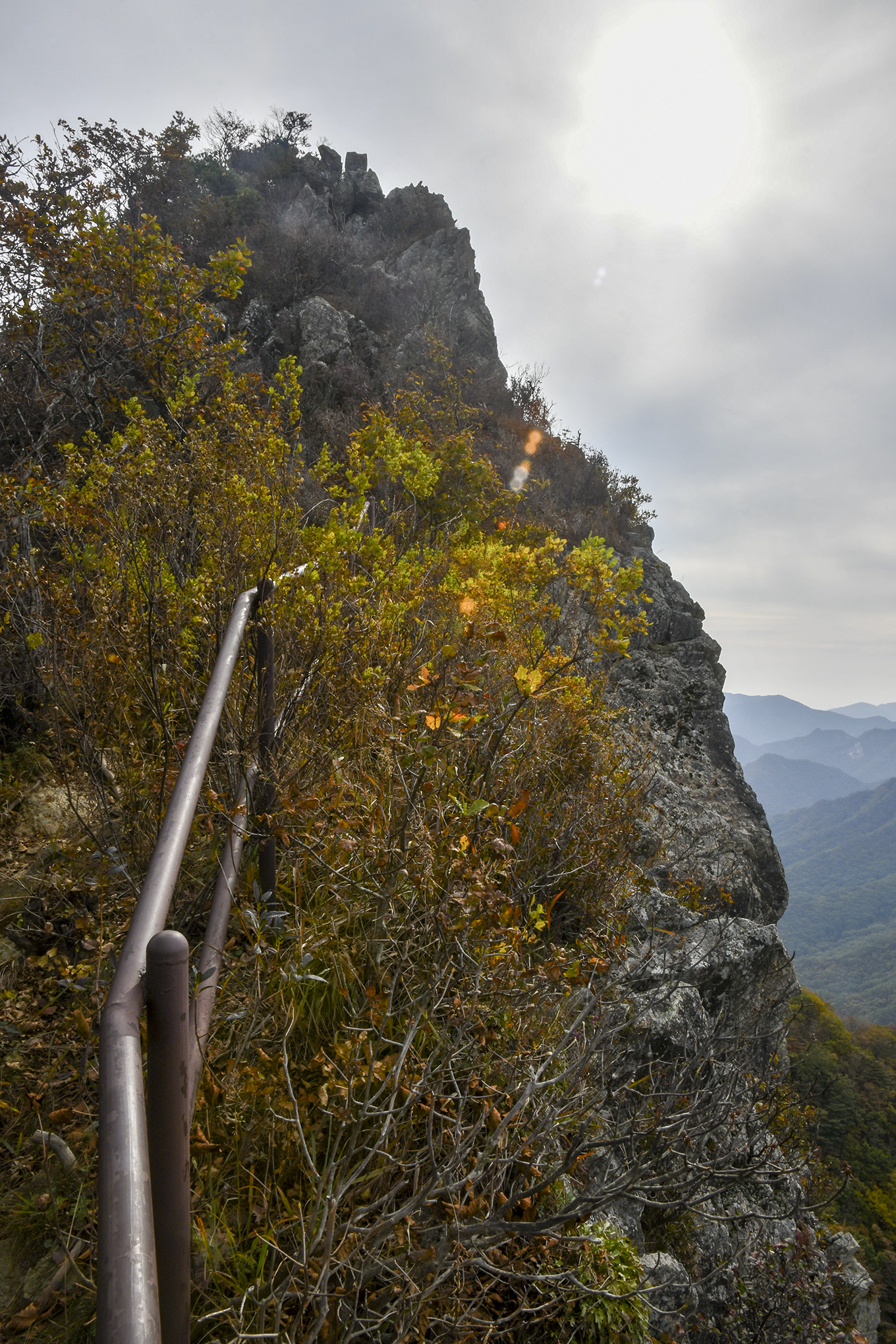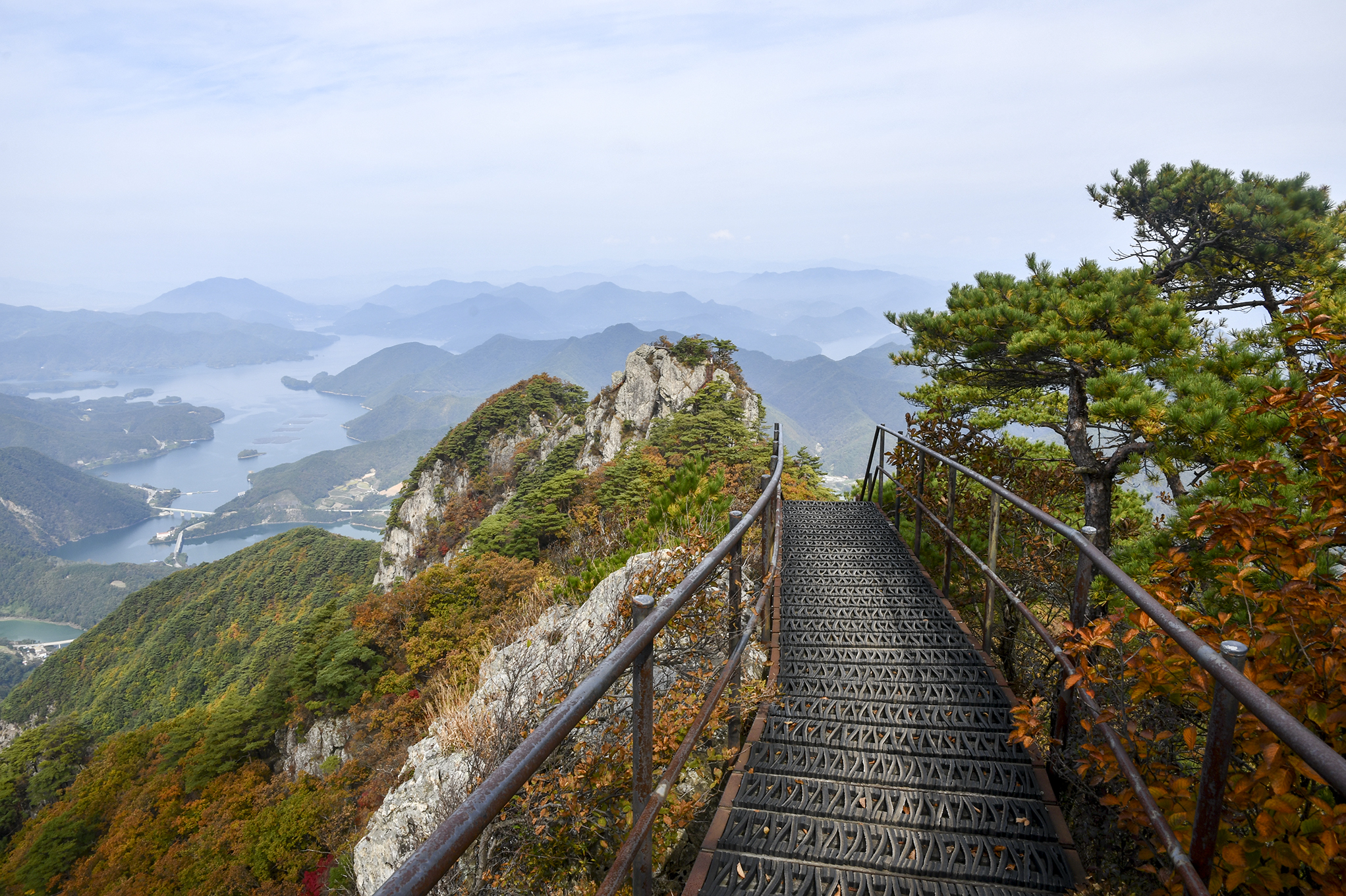 영봉을 이루는 암벽 높이만도 150m가 되는데, 그 기암 절벽 사이로 계단으로 이어 놓았다.