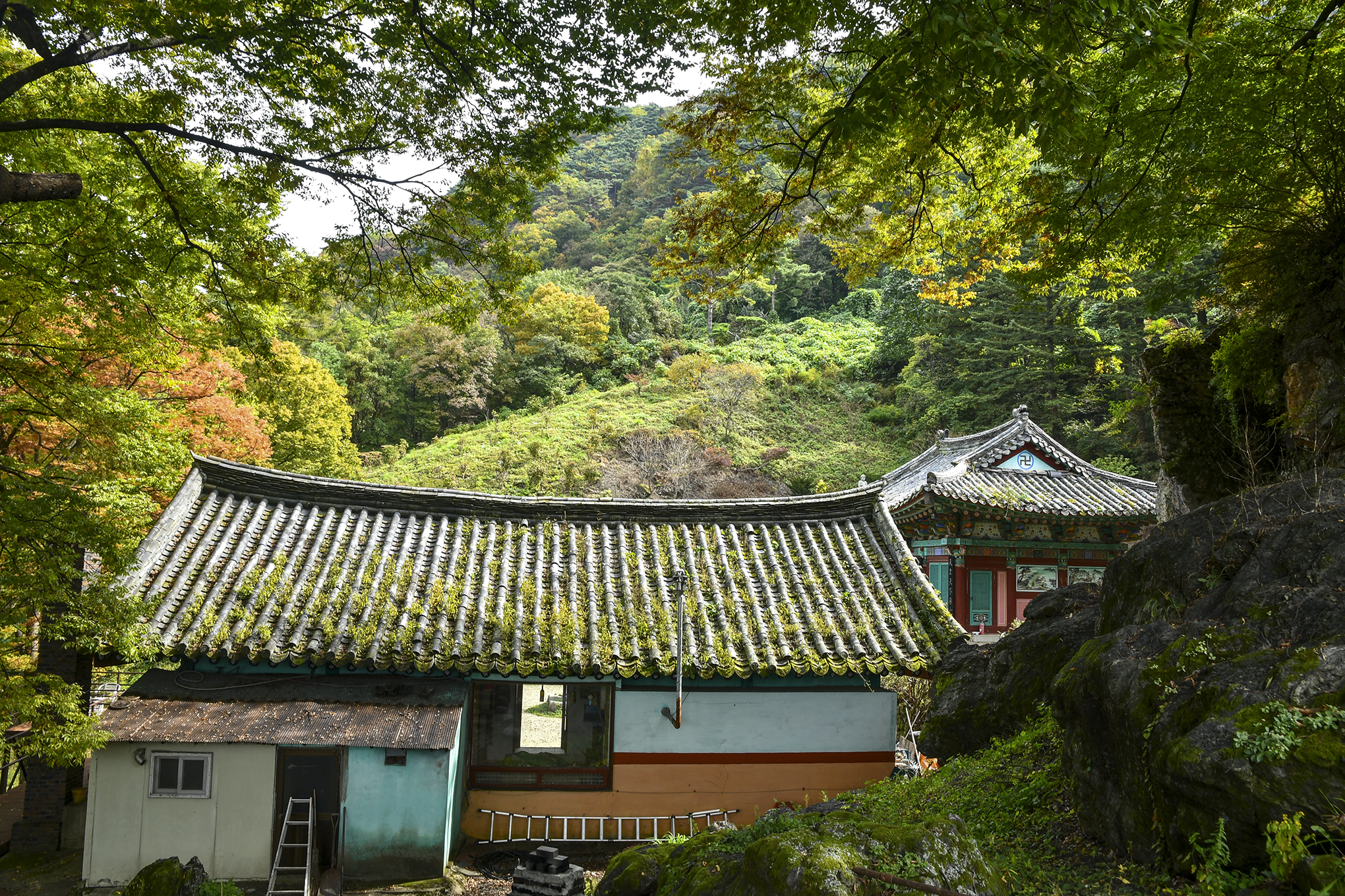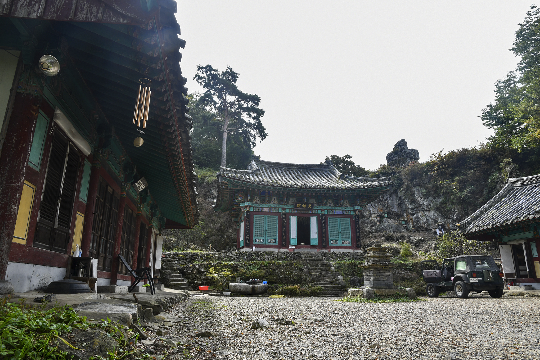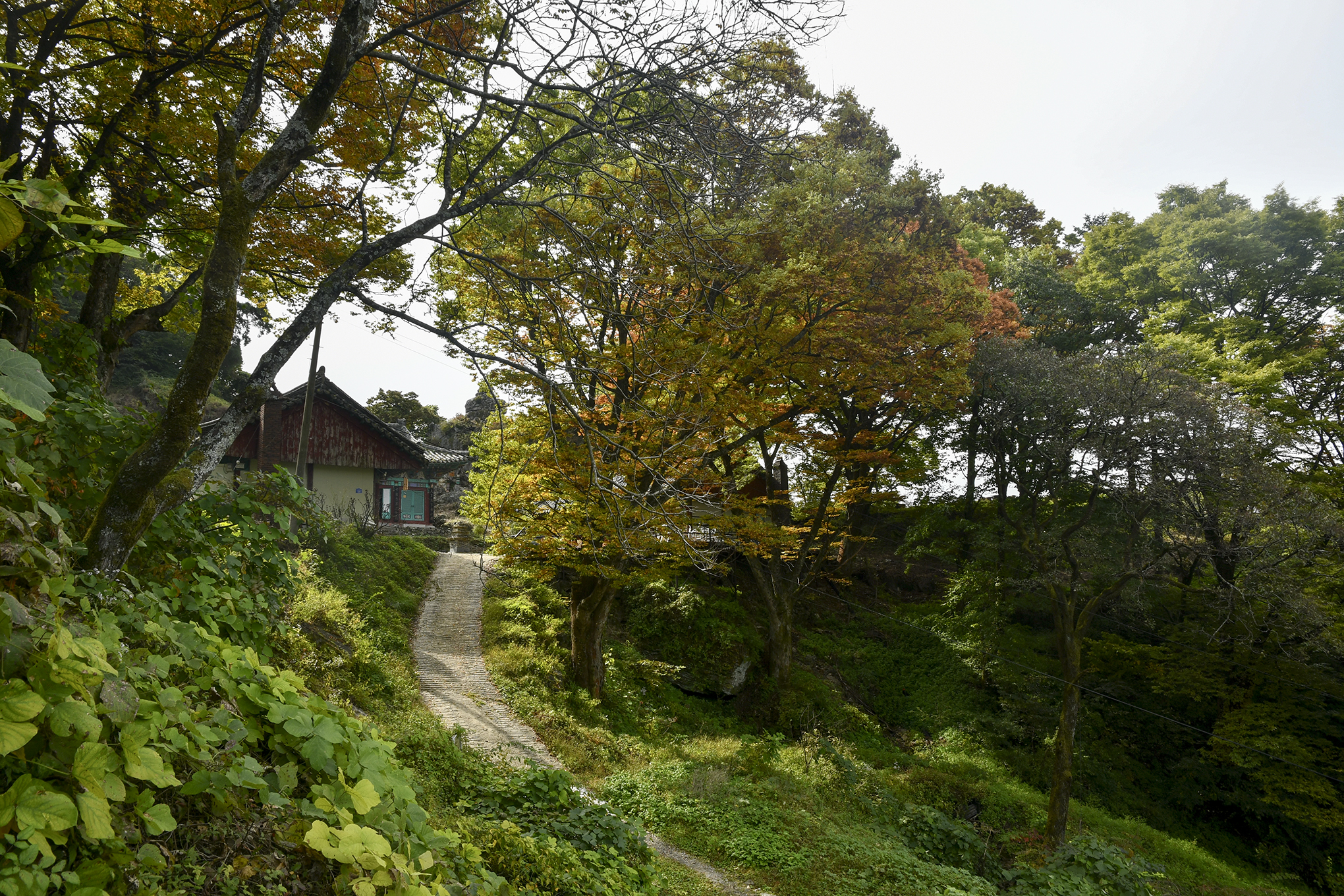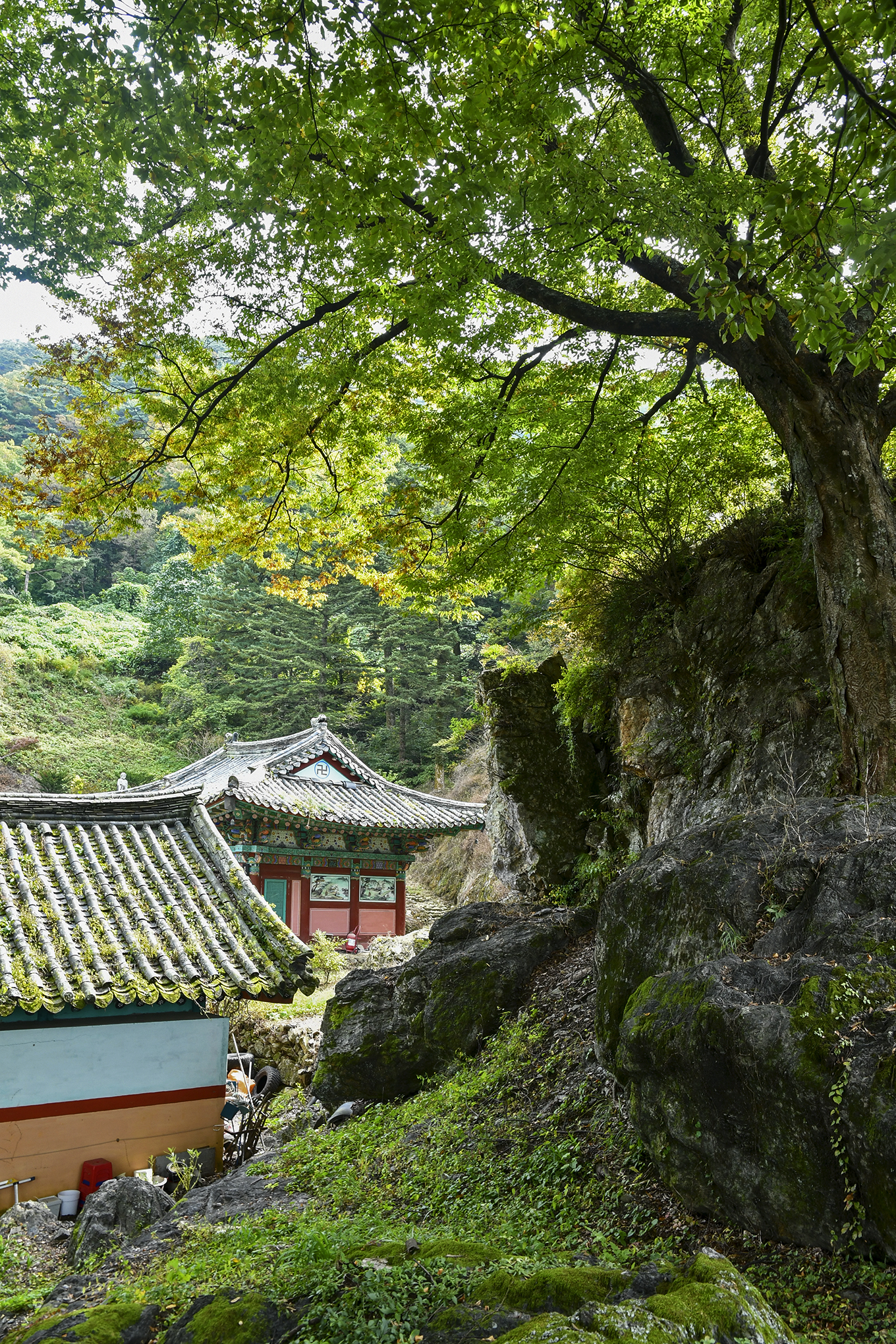대웅전 뒤로 기암이 우뚝 서있고, 인적없는 적막함이 느껴진다.