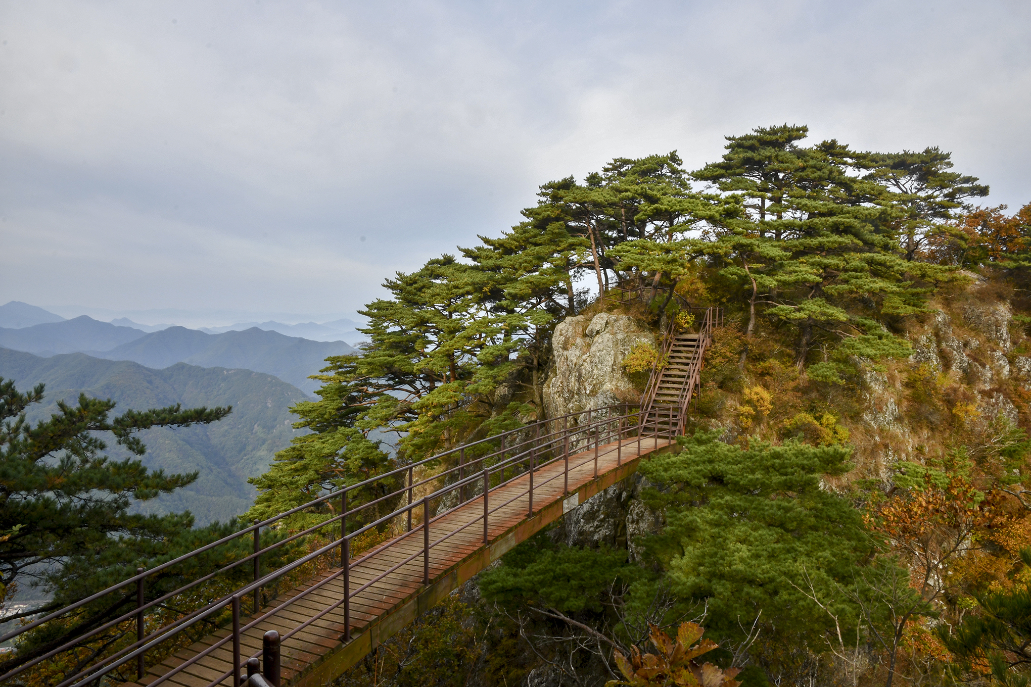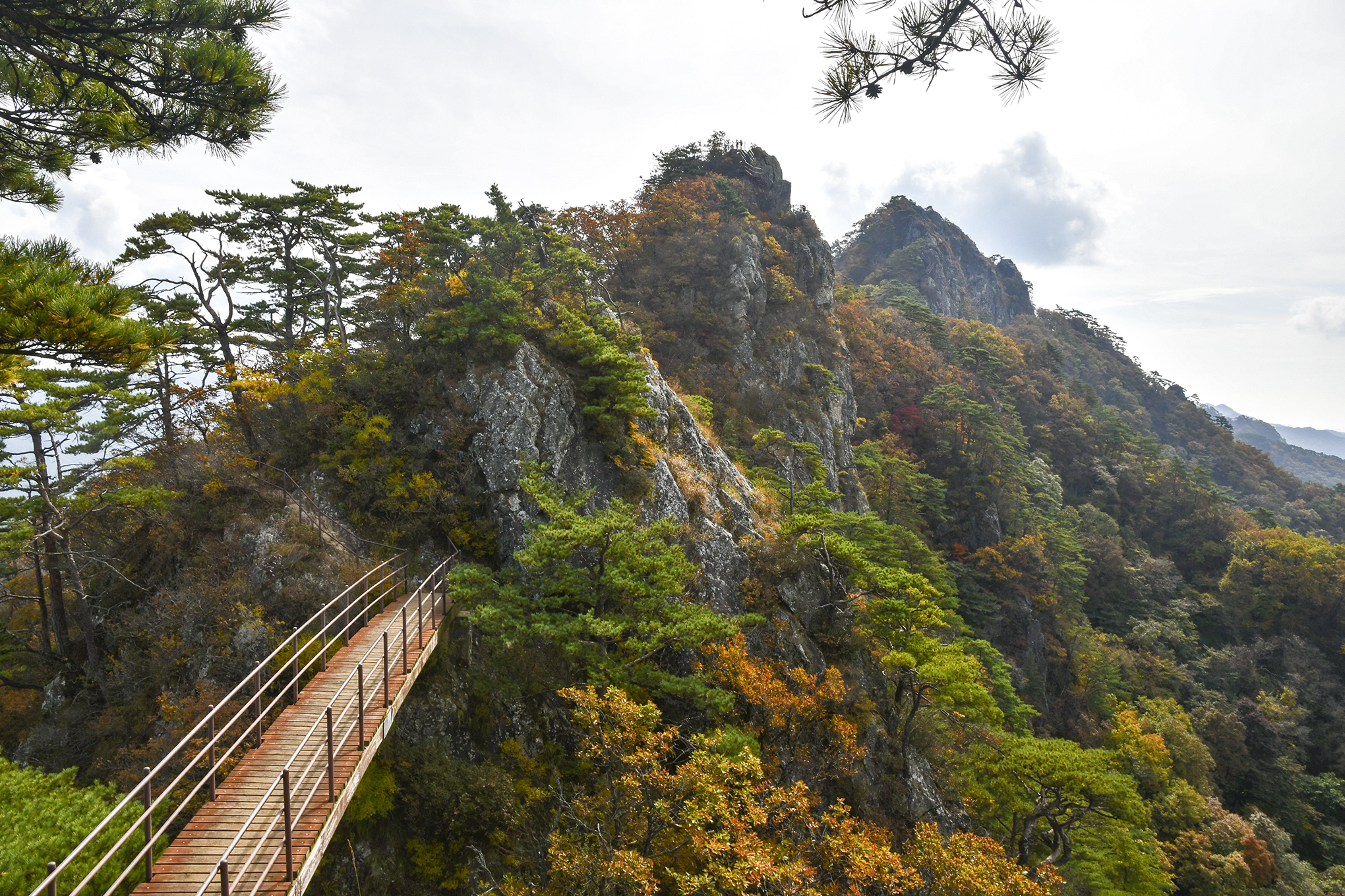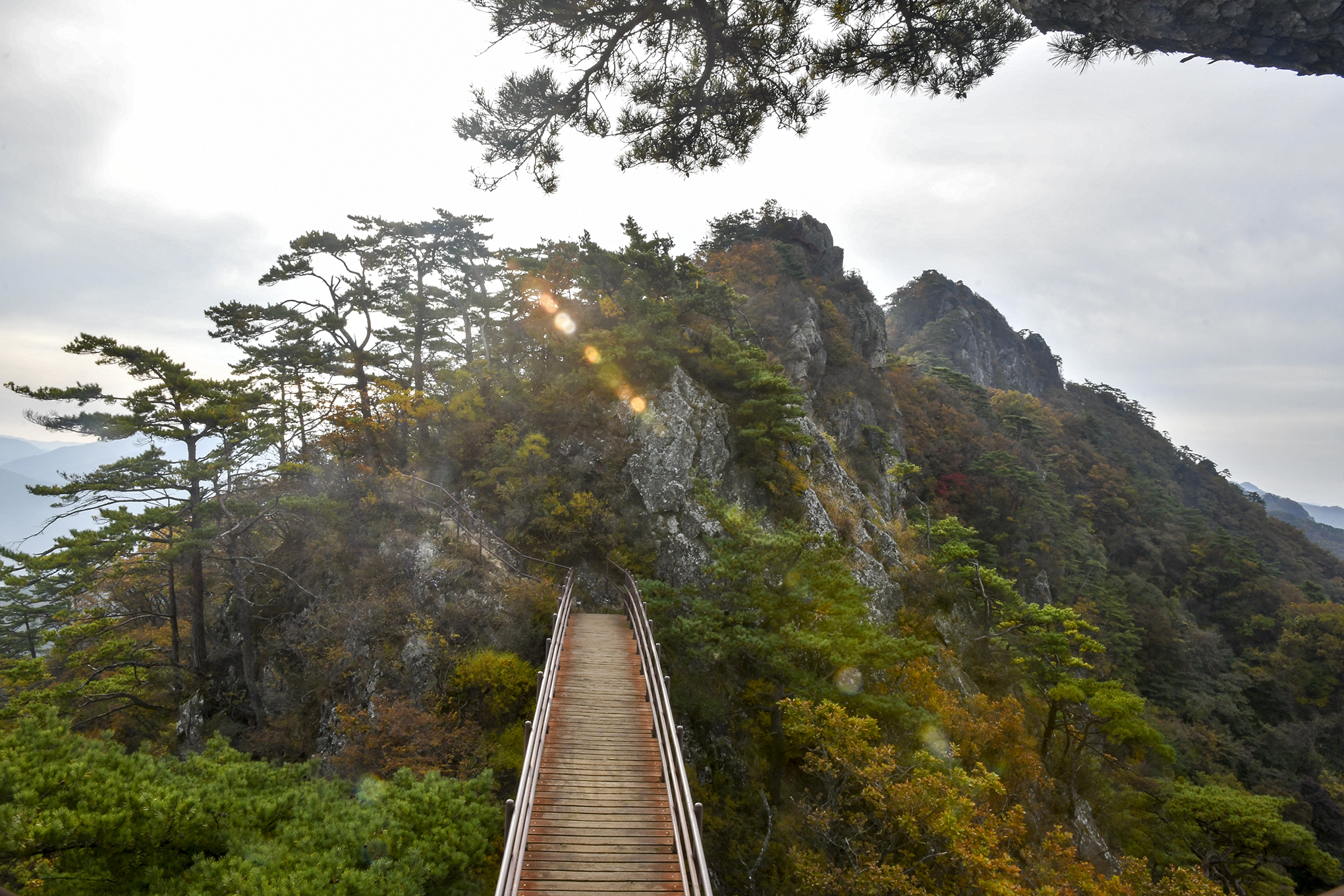 앞에 보이는 두 봉우리에 사이에 구름다리가 있었다.
