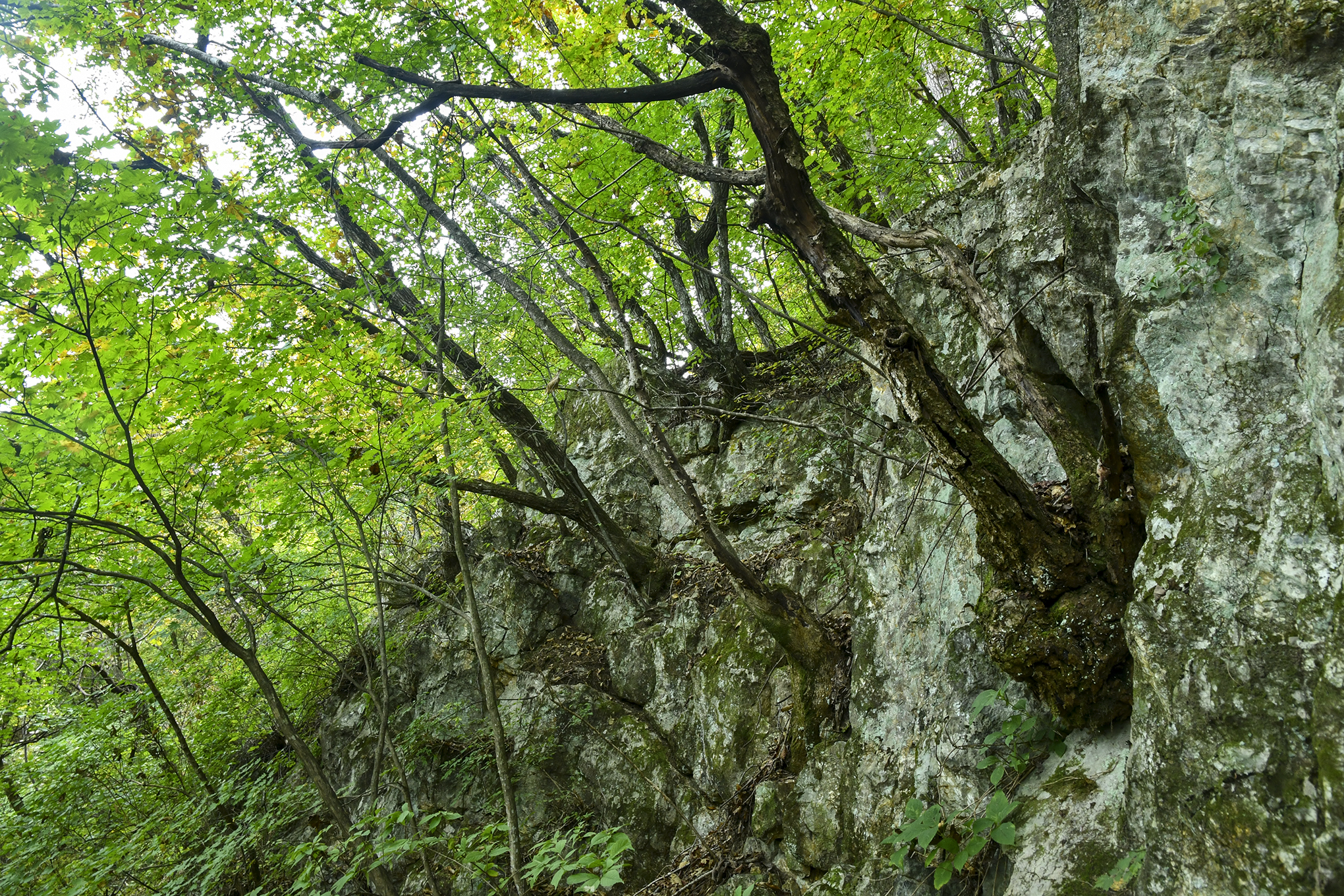 나무뿌리가 바위 틈으로 뻗어 바위에서 자라는 것처럼 보인다.