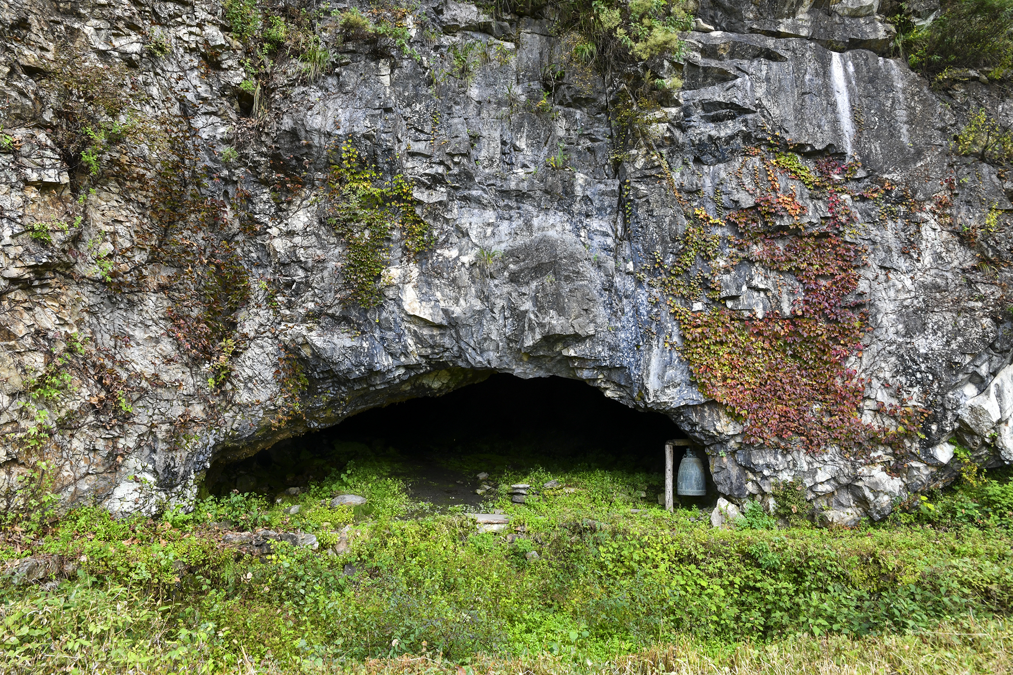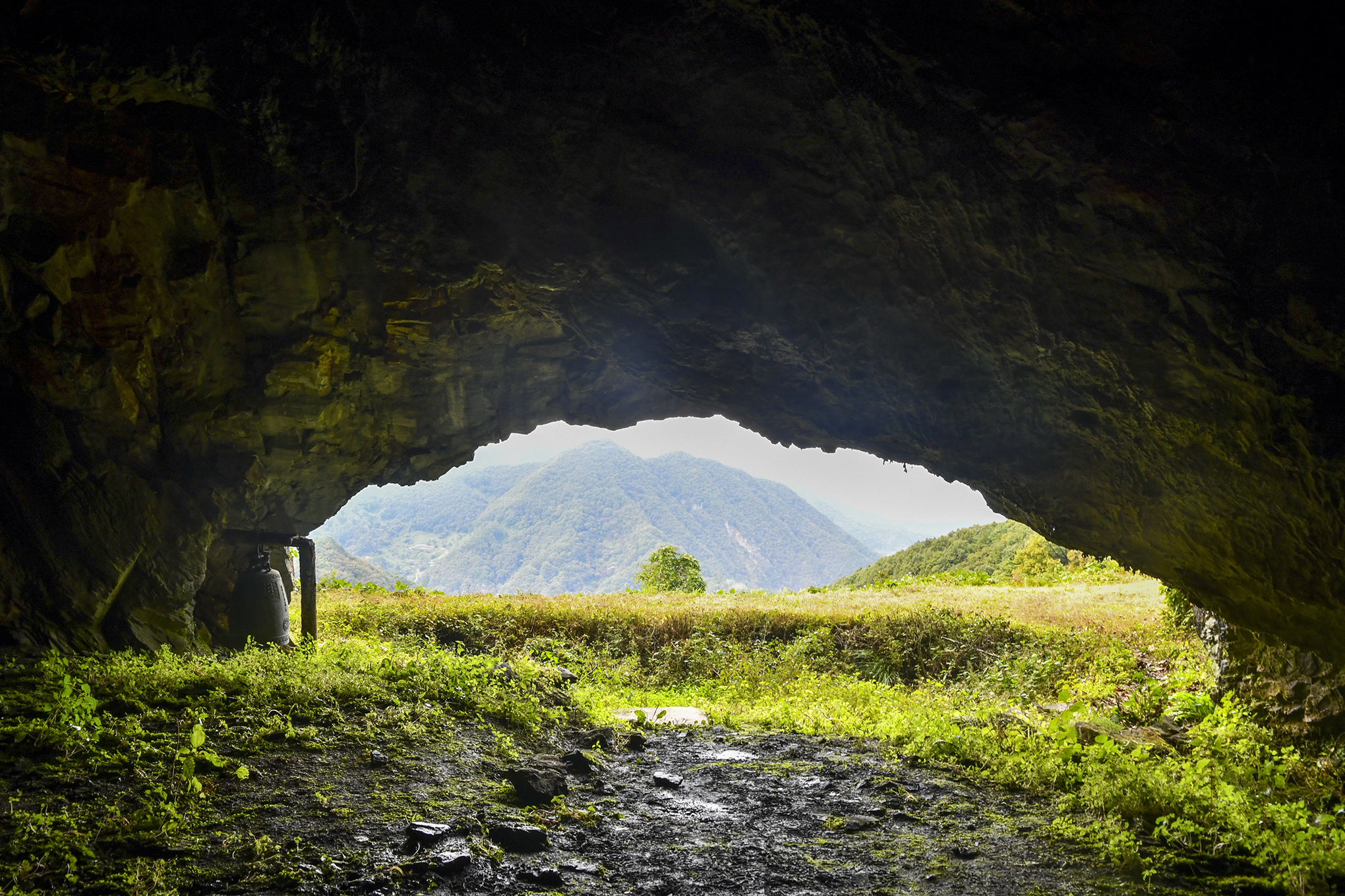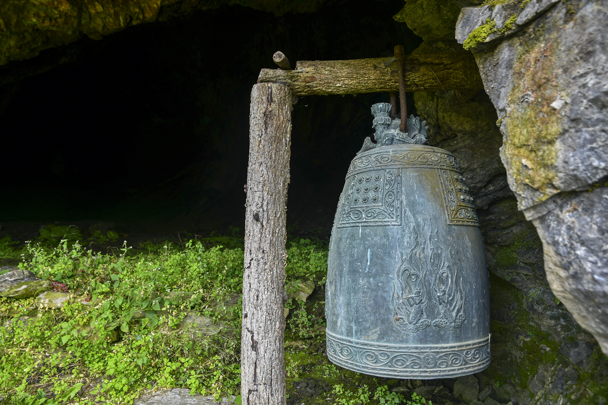입구 오른쪽 나무 기둥에 종이 매달려 있고, 굴 위에서는 물이 똑똑 떨어지기도 한다.
